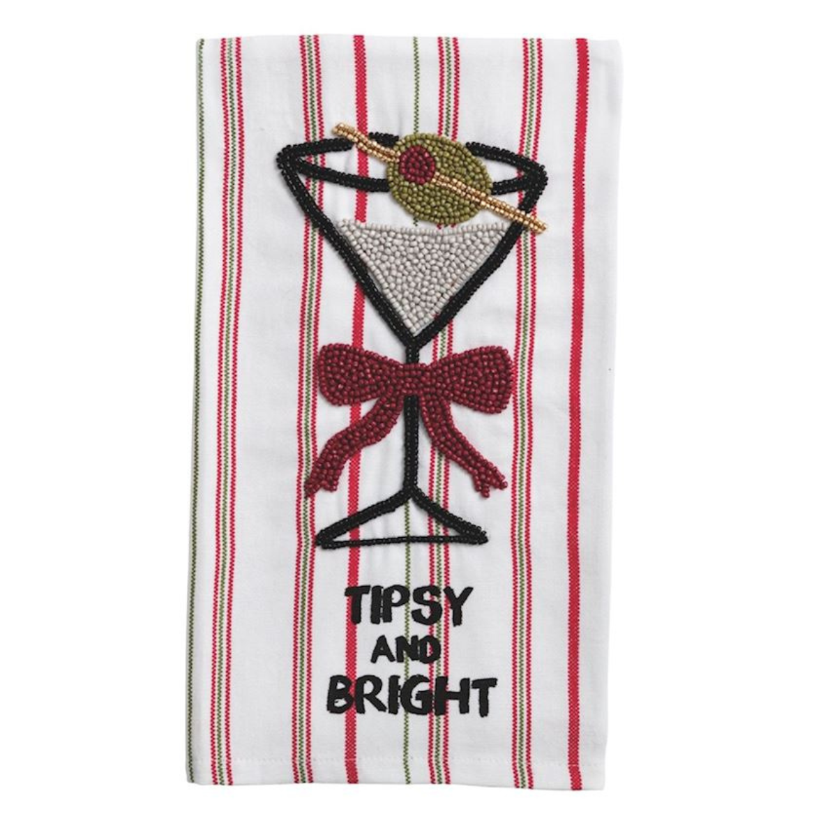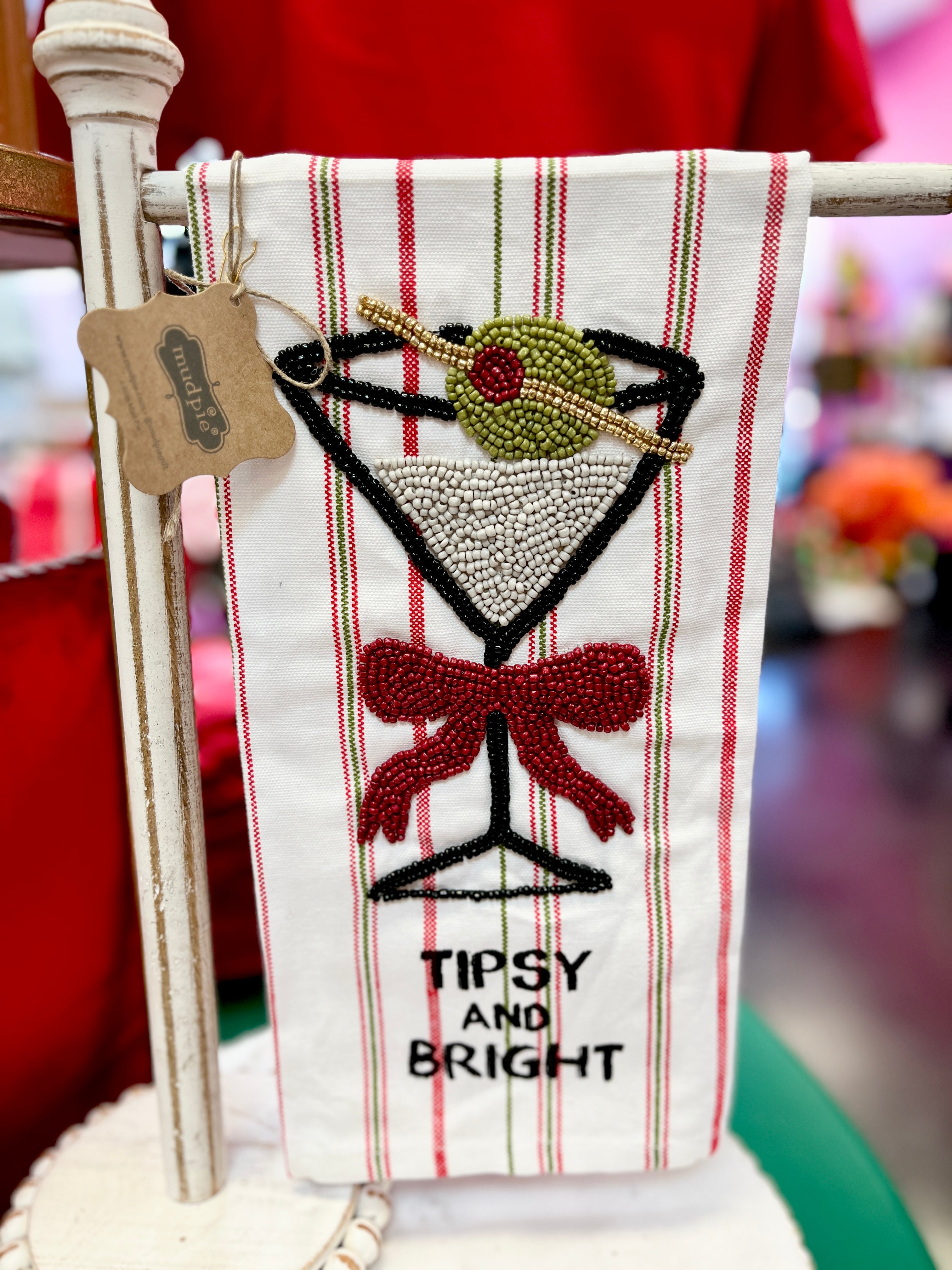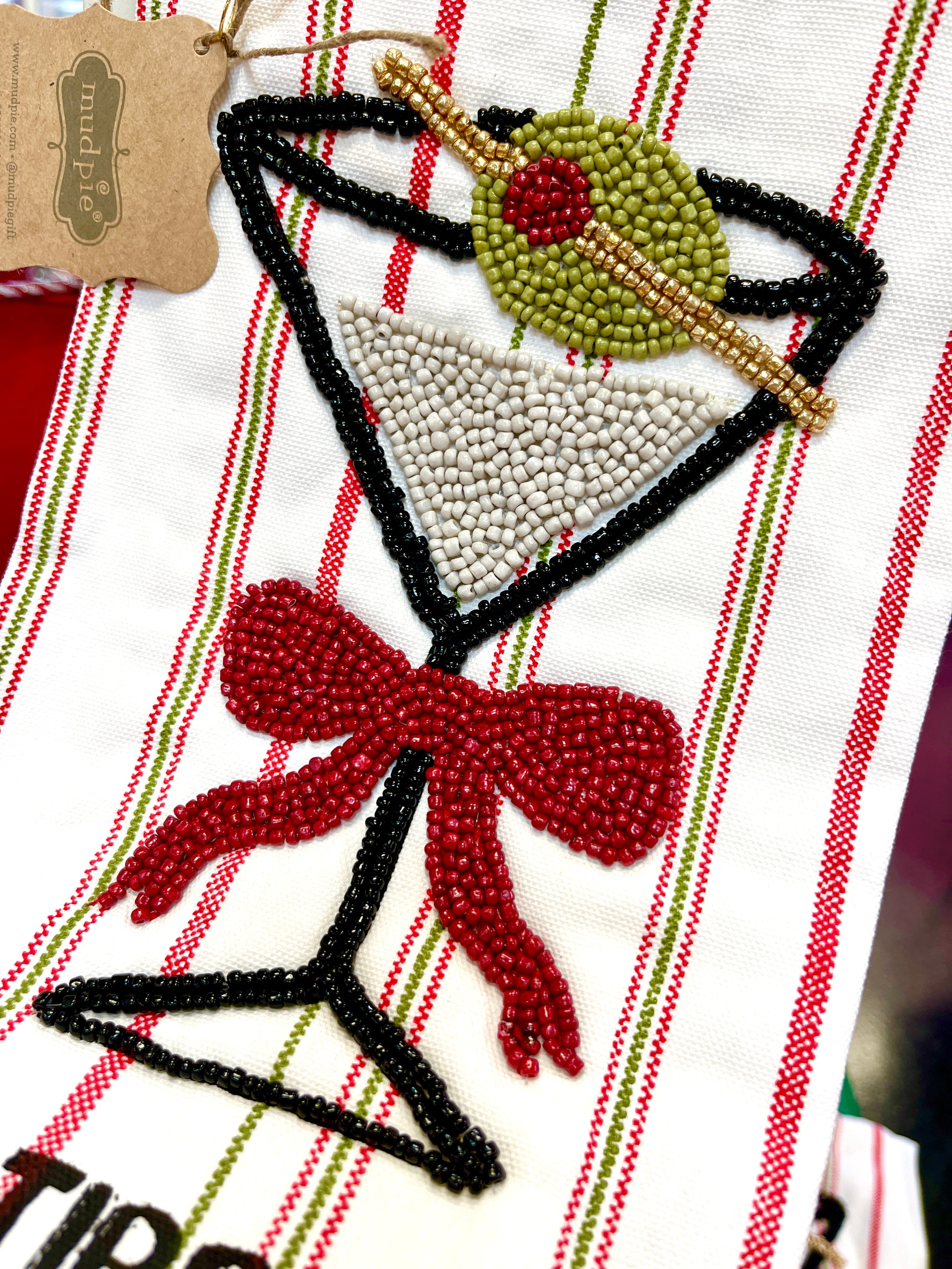 Add a splash of festive fun to your kitchen with the Tipsy & Bright Martini Beaded Tea Towel. Featuring a charming martini design, it’s the perfect playful touch for holiday gatherings and cozy nights in. Cute and cheerful, this towel brightens up any space while keeping things tidy. Cheers to style and function all in one!