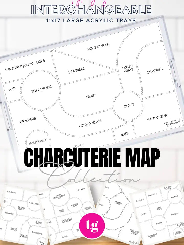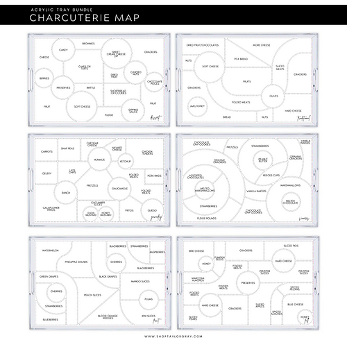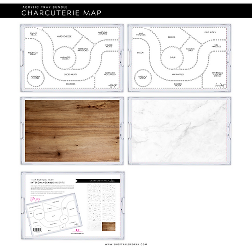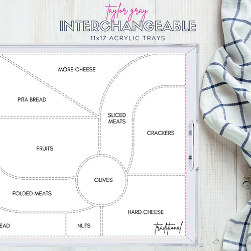 Acrylic trays are all the rage and are definitely on trend. Why should you settle for one design when you can have TEN designs and change them out on a whim? The TAYLOR GRAY acrylic tray is an extra-large 11x17 tray that perfectly fit our 11x17 insert designs. The pocket on the bottom of the tray allows the inserts to be easily interchanged and protected. 10 Different Inserts for your Tray.