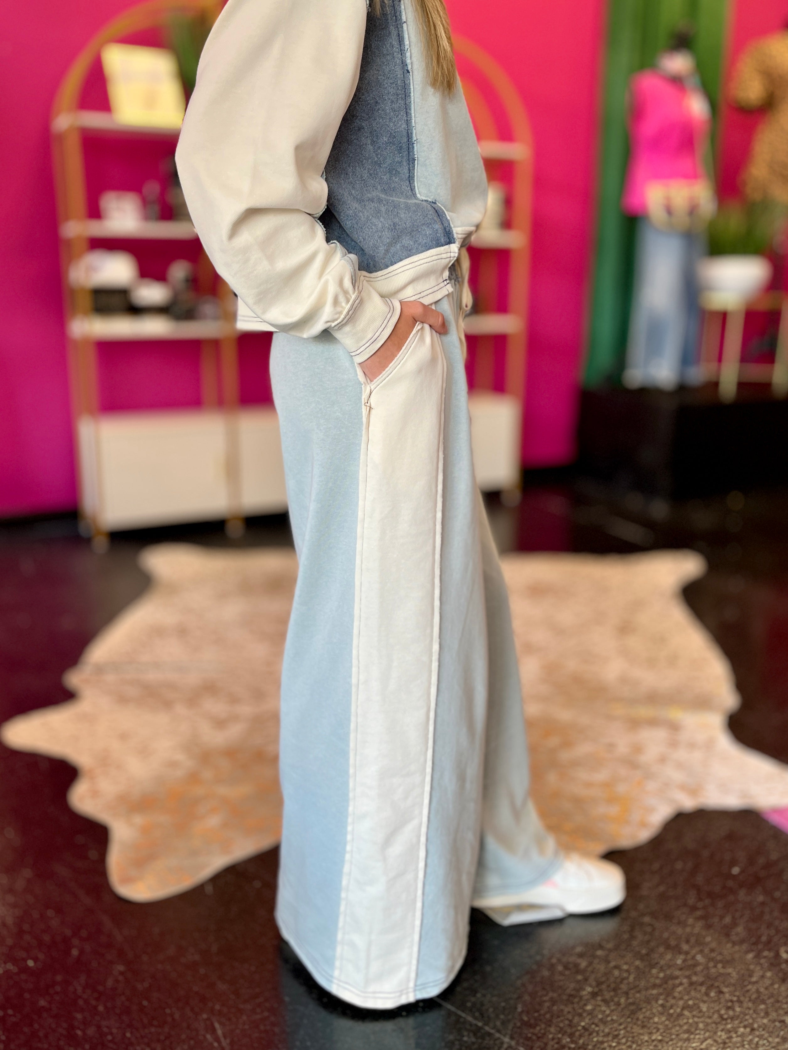 - Denim & Lt Blue Color Block Wide Leg Pant