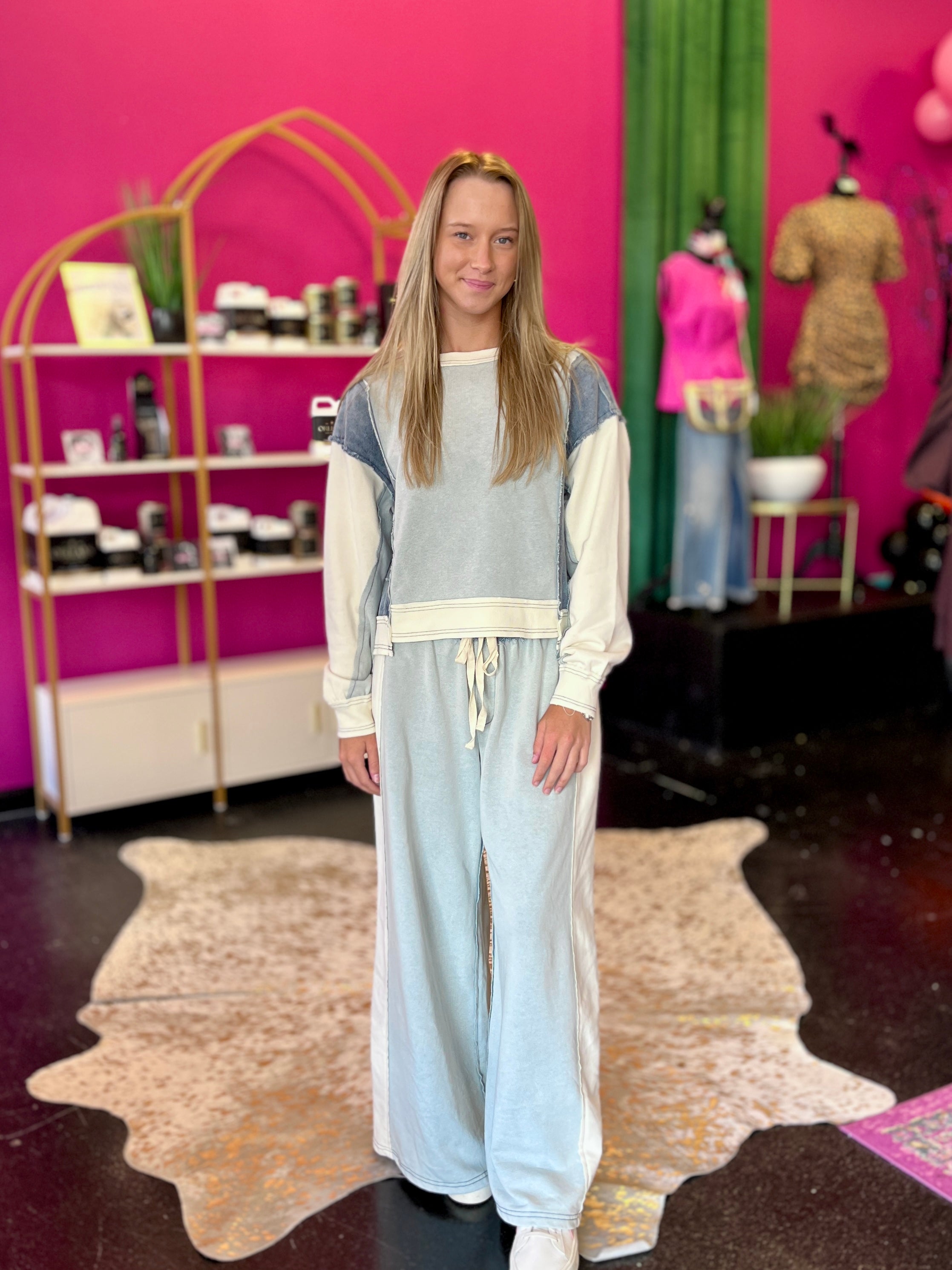 Step out in style with the Denim & Sage Color Block Wide Leg Pant. This adorable pant pairs perfectly with its matching top to create a cute, coordinated outfit. Whether you're traveling, running errands, or just lounging around, its wide-leg fit offers comfort and effortless flair. Embrace playful ease and standout charm wherever you go!