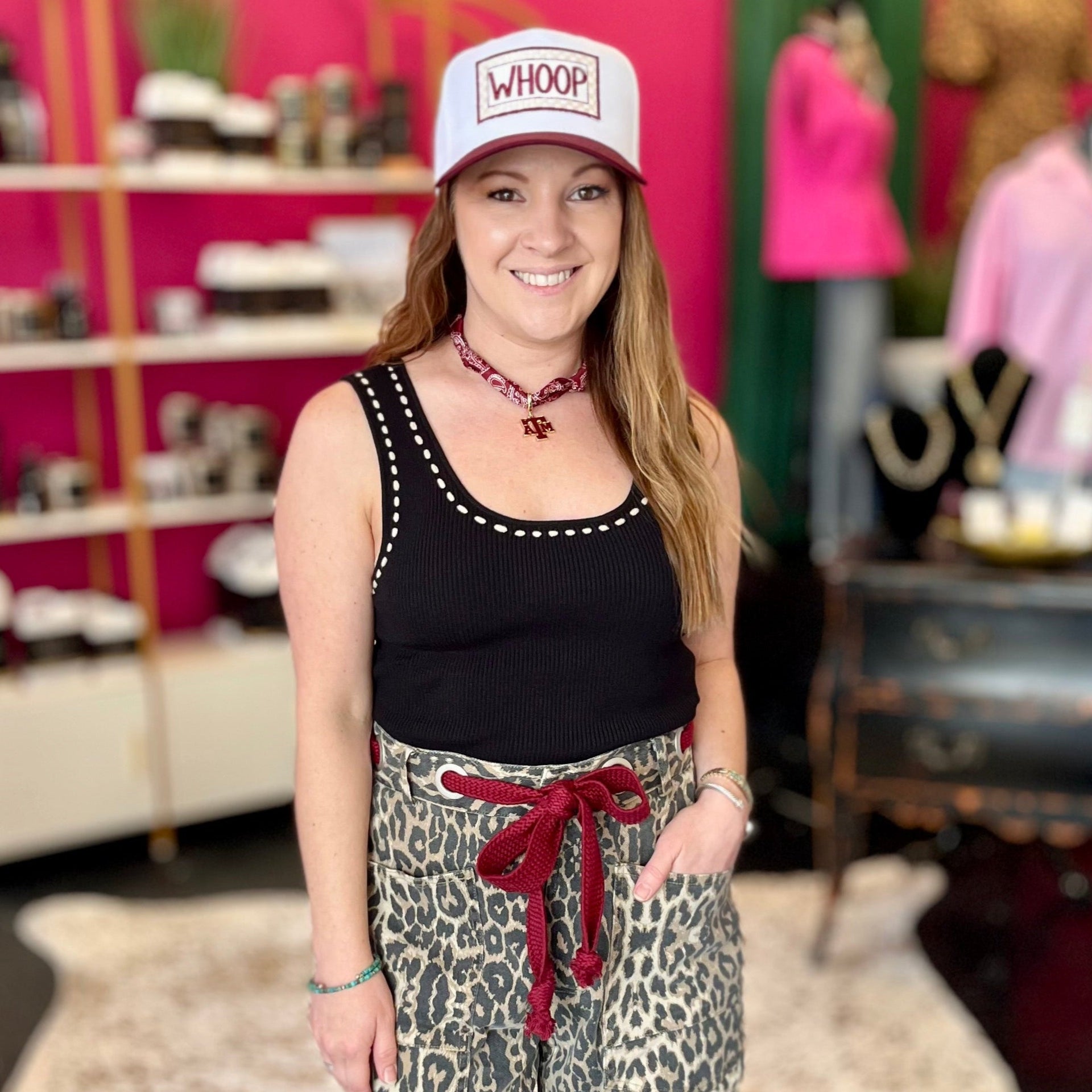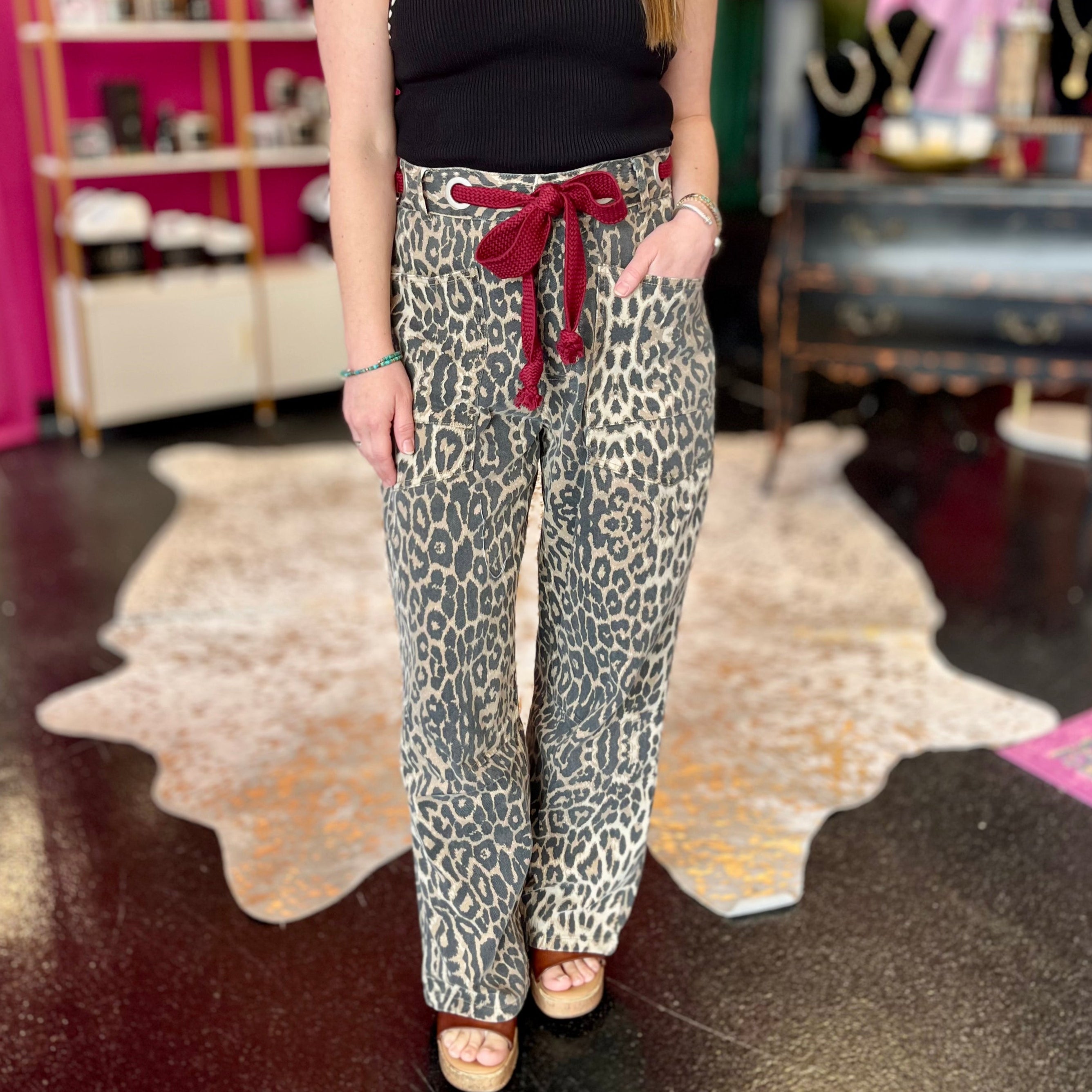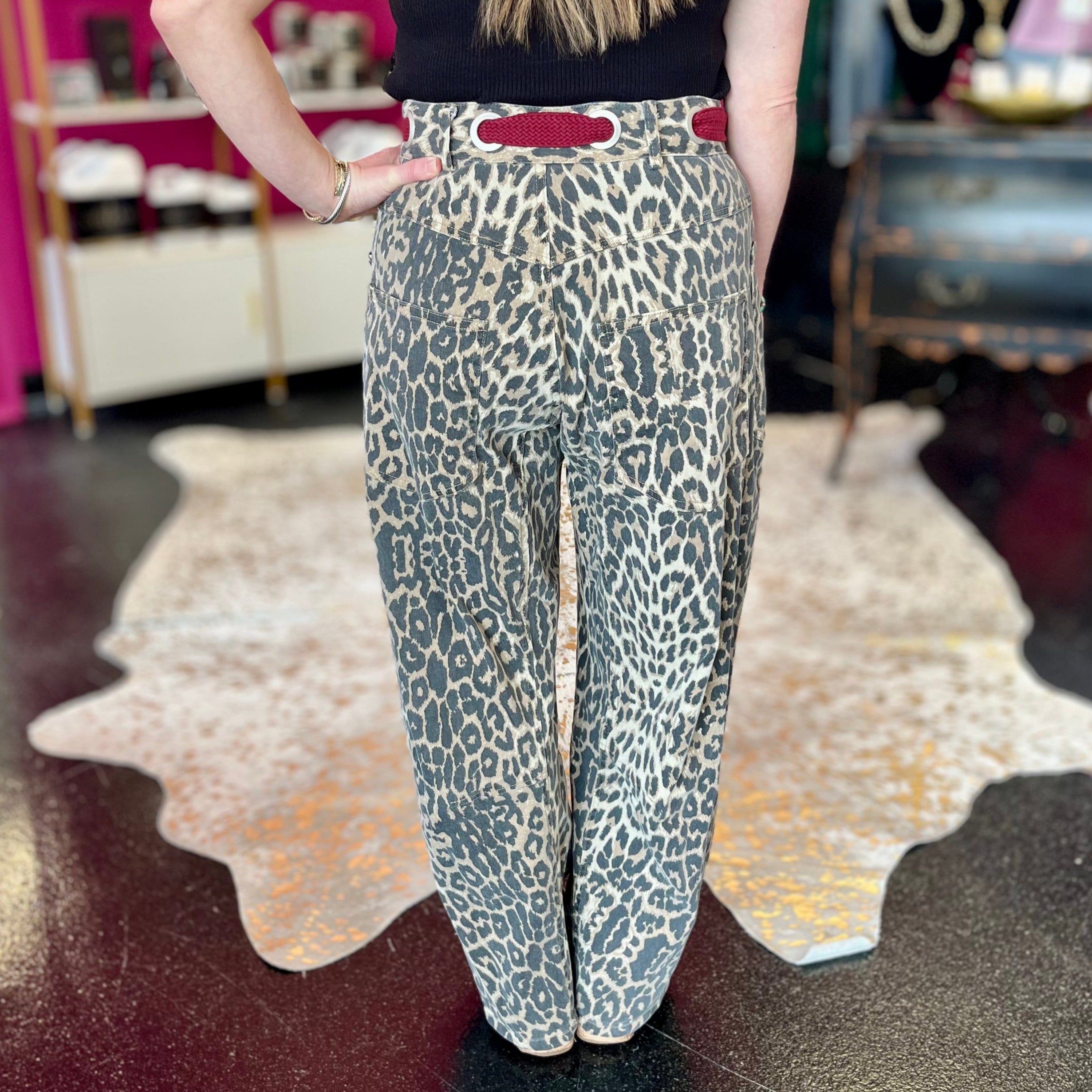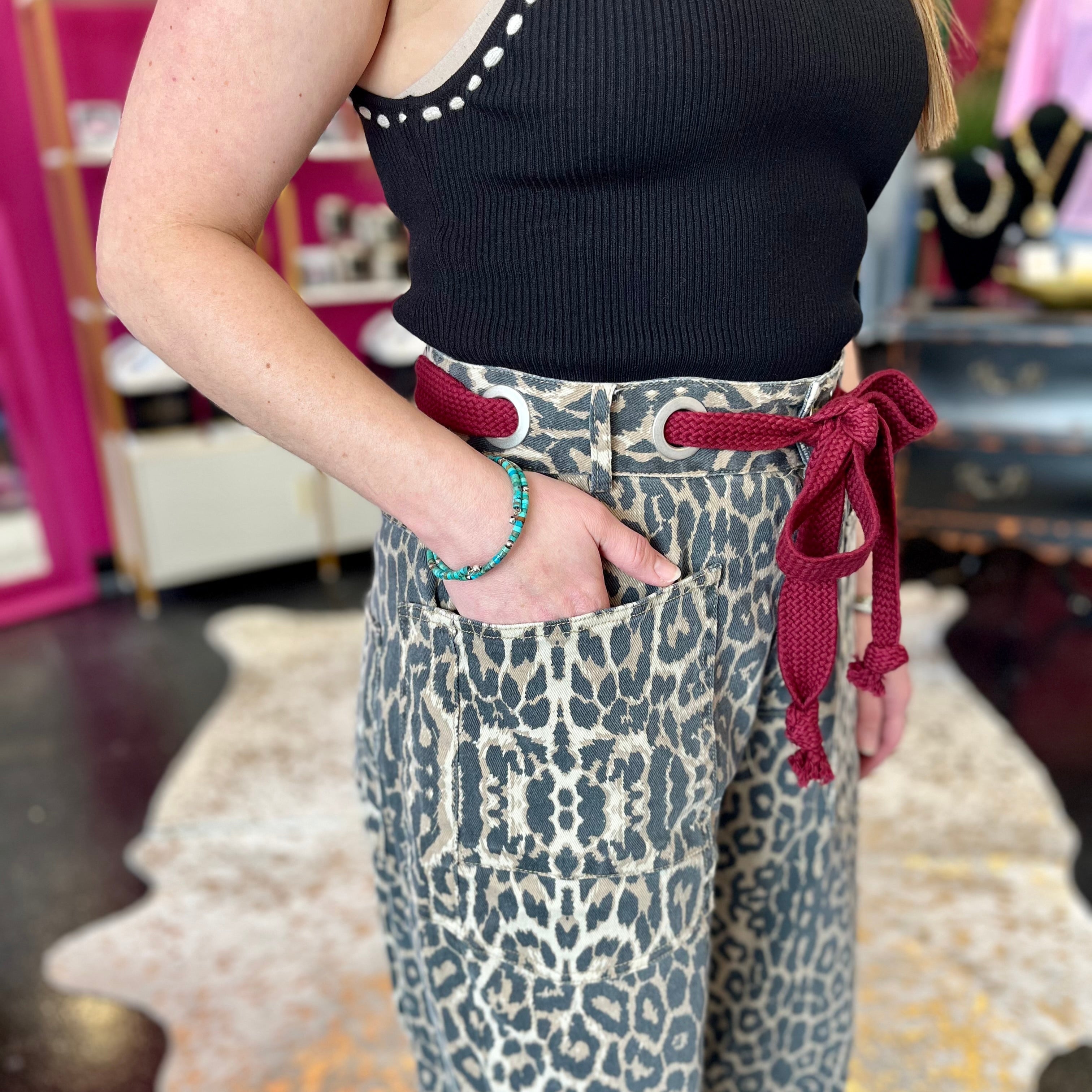 Step out in style this fall and on gameday with the Leopard & Maroon Belt Barrel Jean. This playful piece combines bold leopard print with rich maroon tones for a look that’s both cute and eye-catching. Designed to turn heads, it’s the must-have addition to your closet that delivers fun and flair every time you wear it.