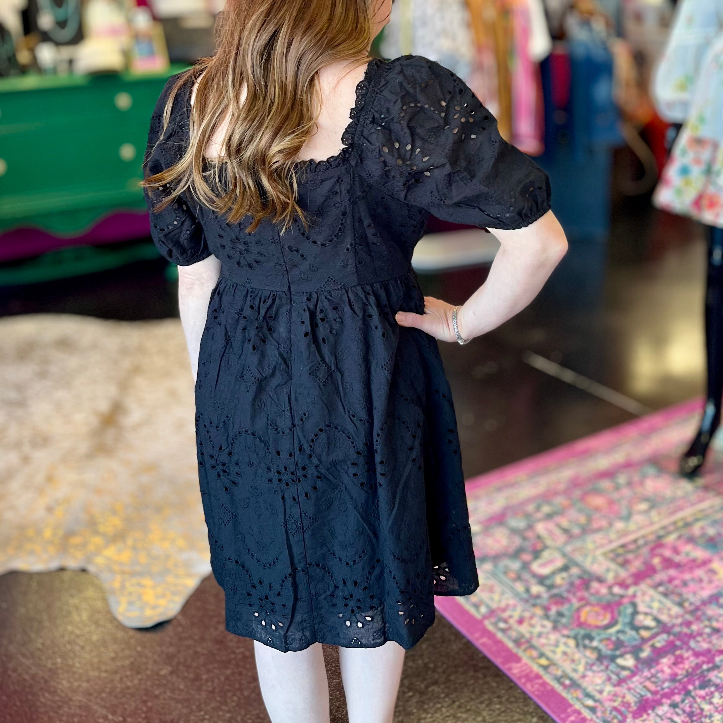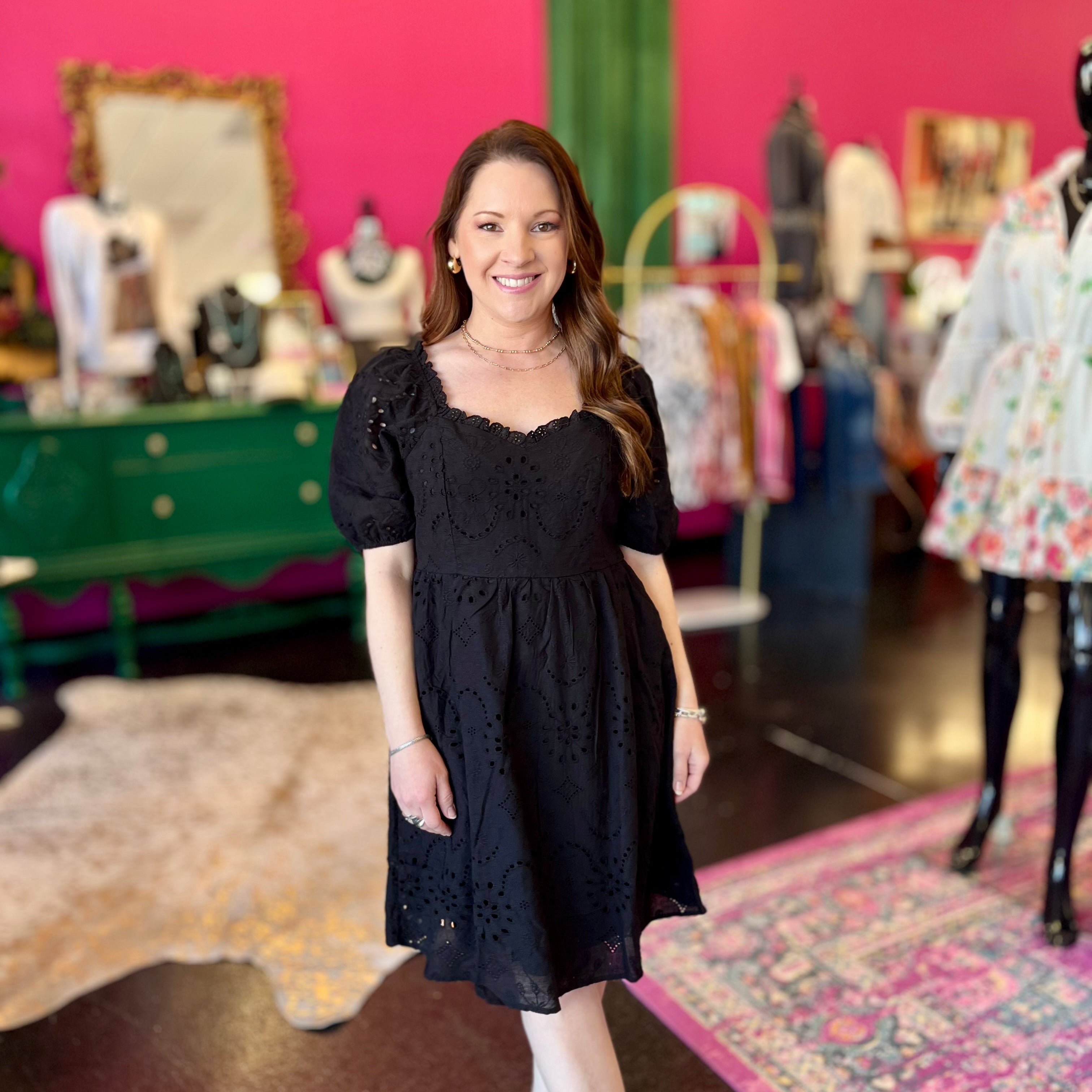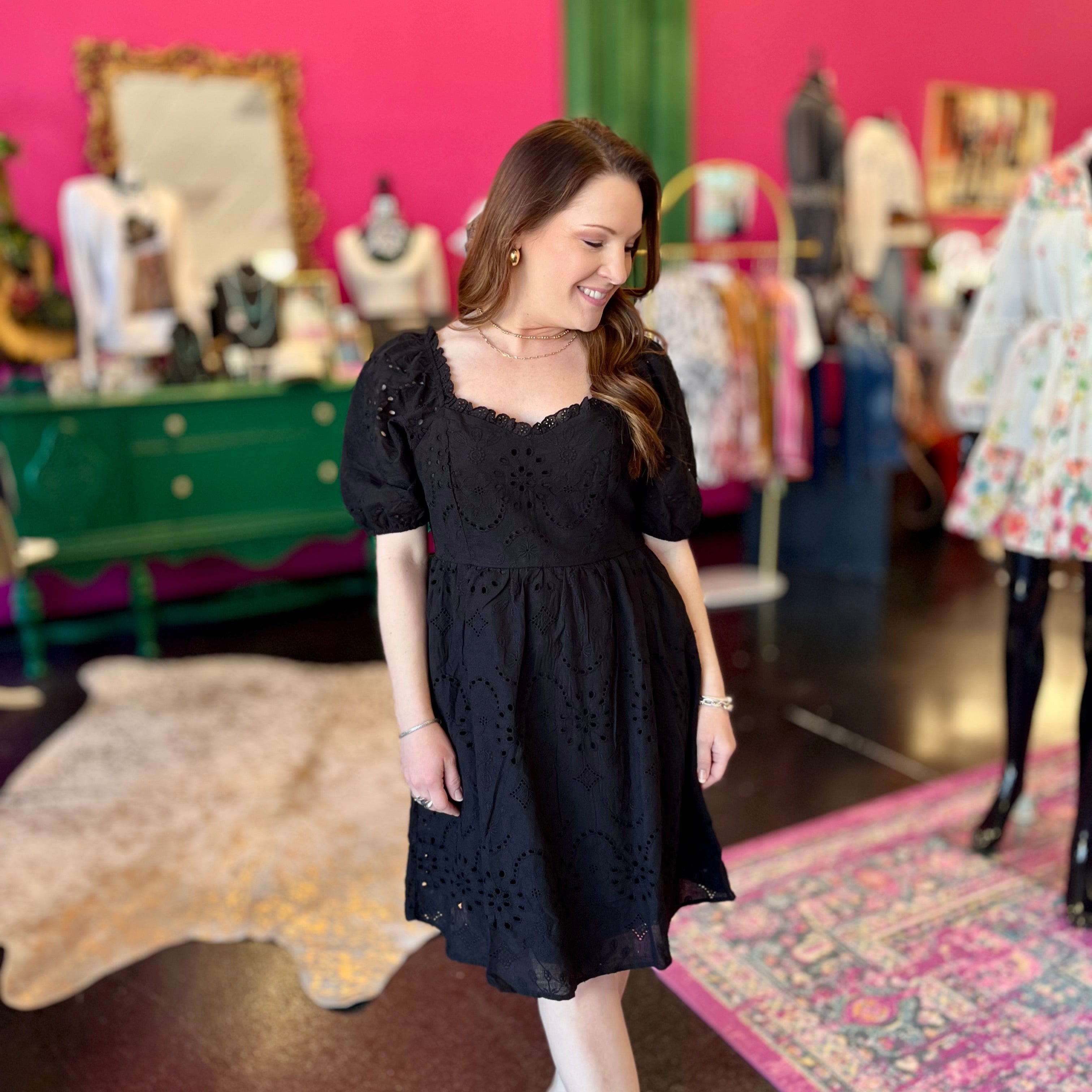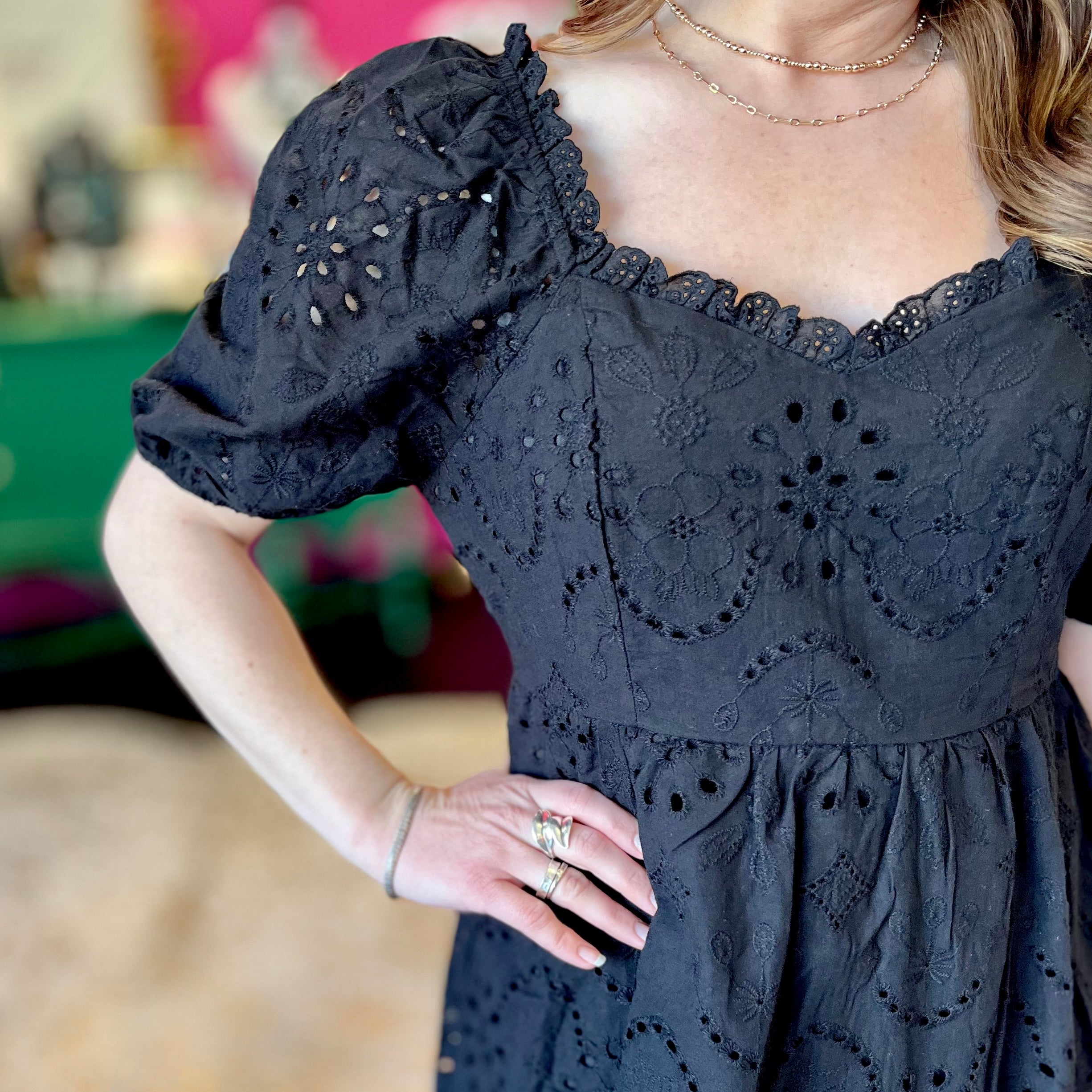 Saddle up in style with our Black Sweatheart Eyelet Dress! This cutest dress is perfect for any occasion, from rodeos to spring and summer days. Don't miss out on the fun - add this dress to your wardrobe today!