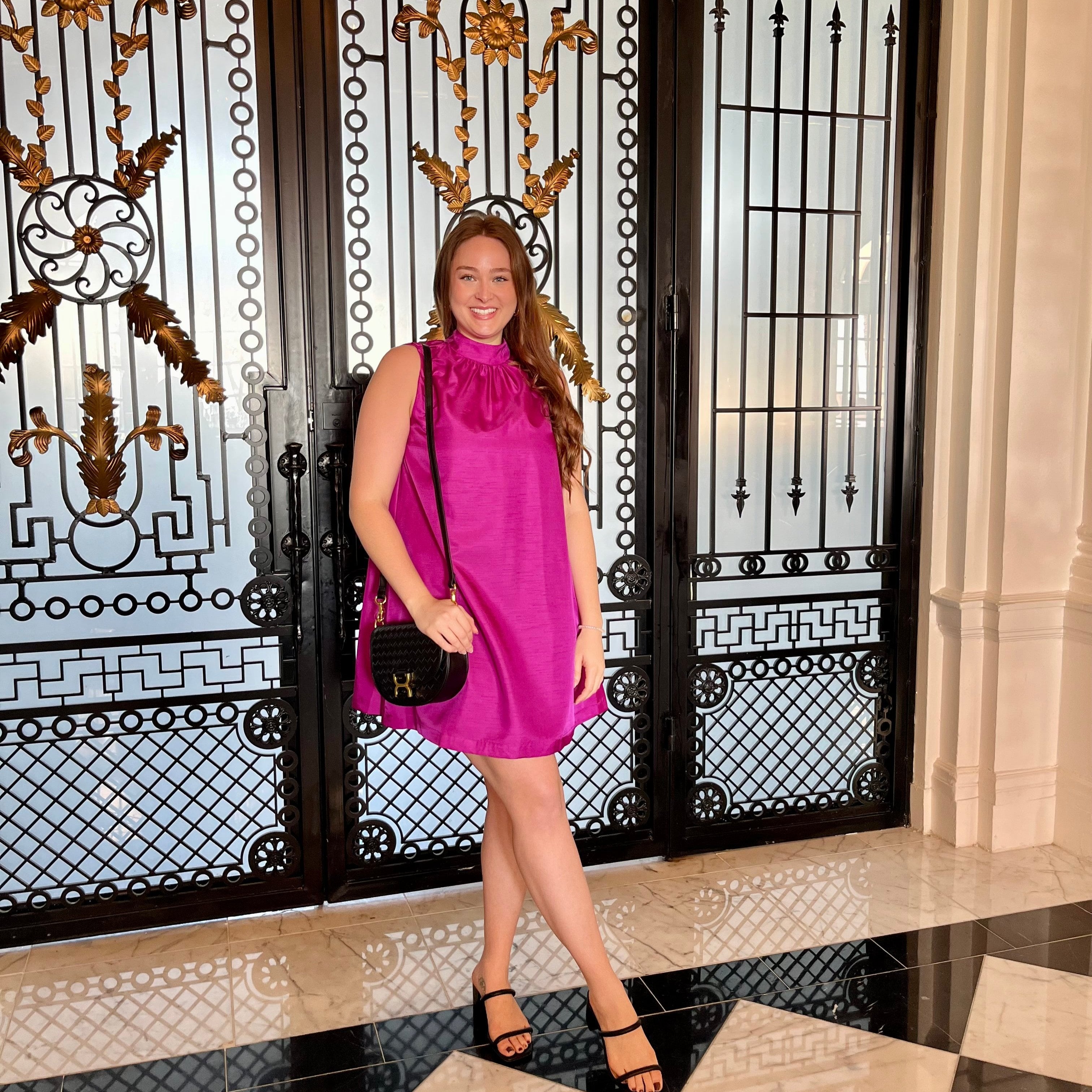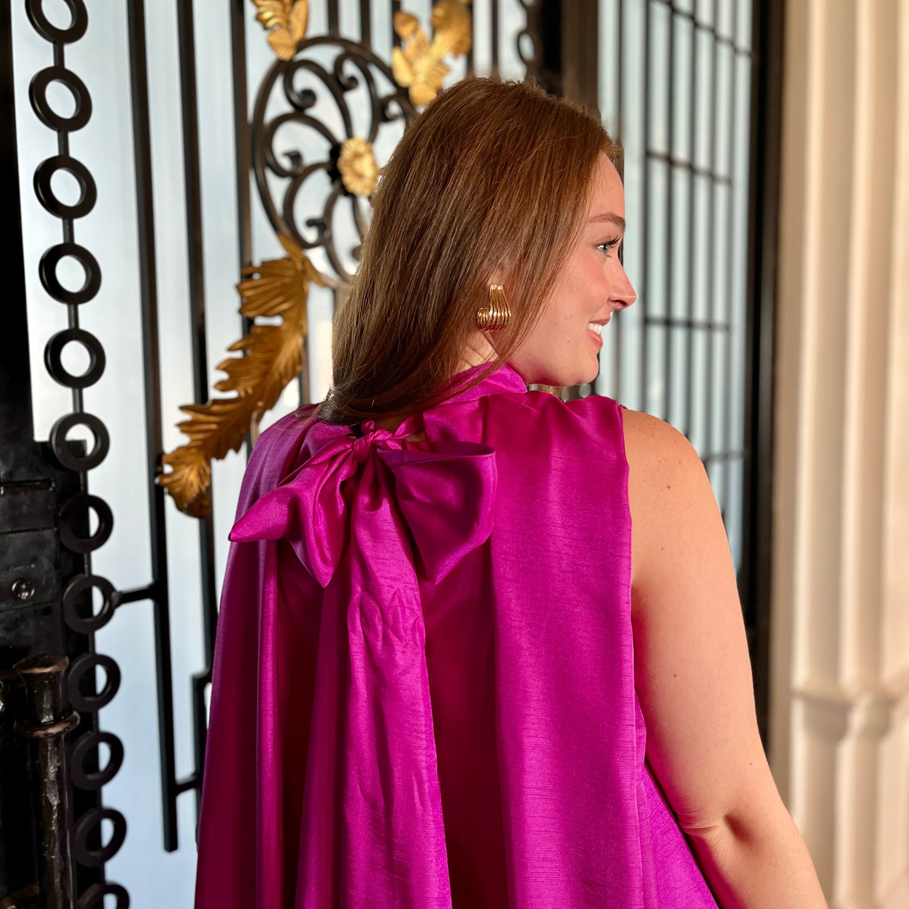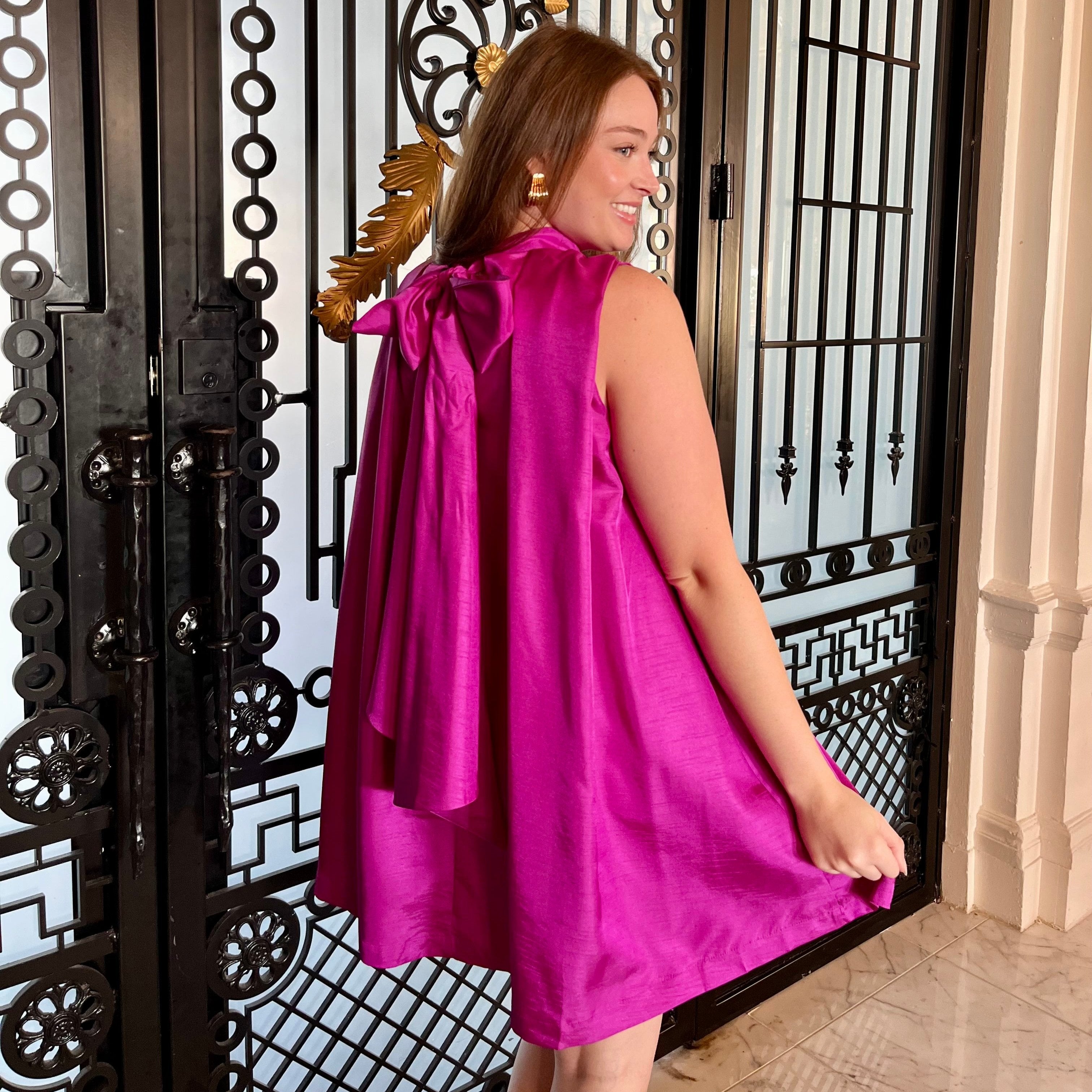 Get ready to turn heads with our Magenta Tie Back Satin Dress! This beautiful dress features a stunning color and an elegant tie bow back that will make you feel classy and sophisticated. Upgrade your wardrobe with this must-have piece!