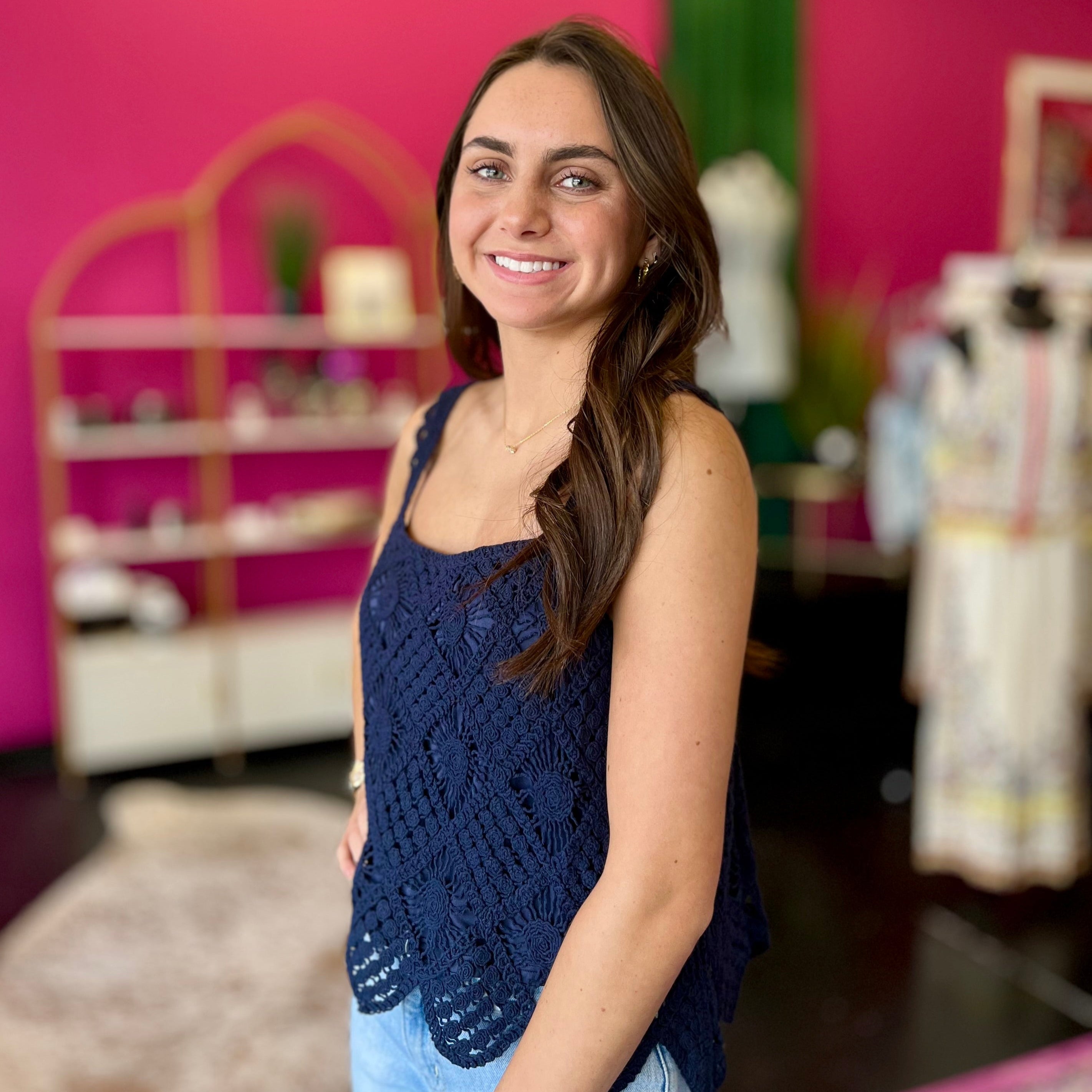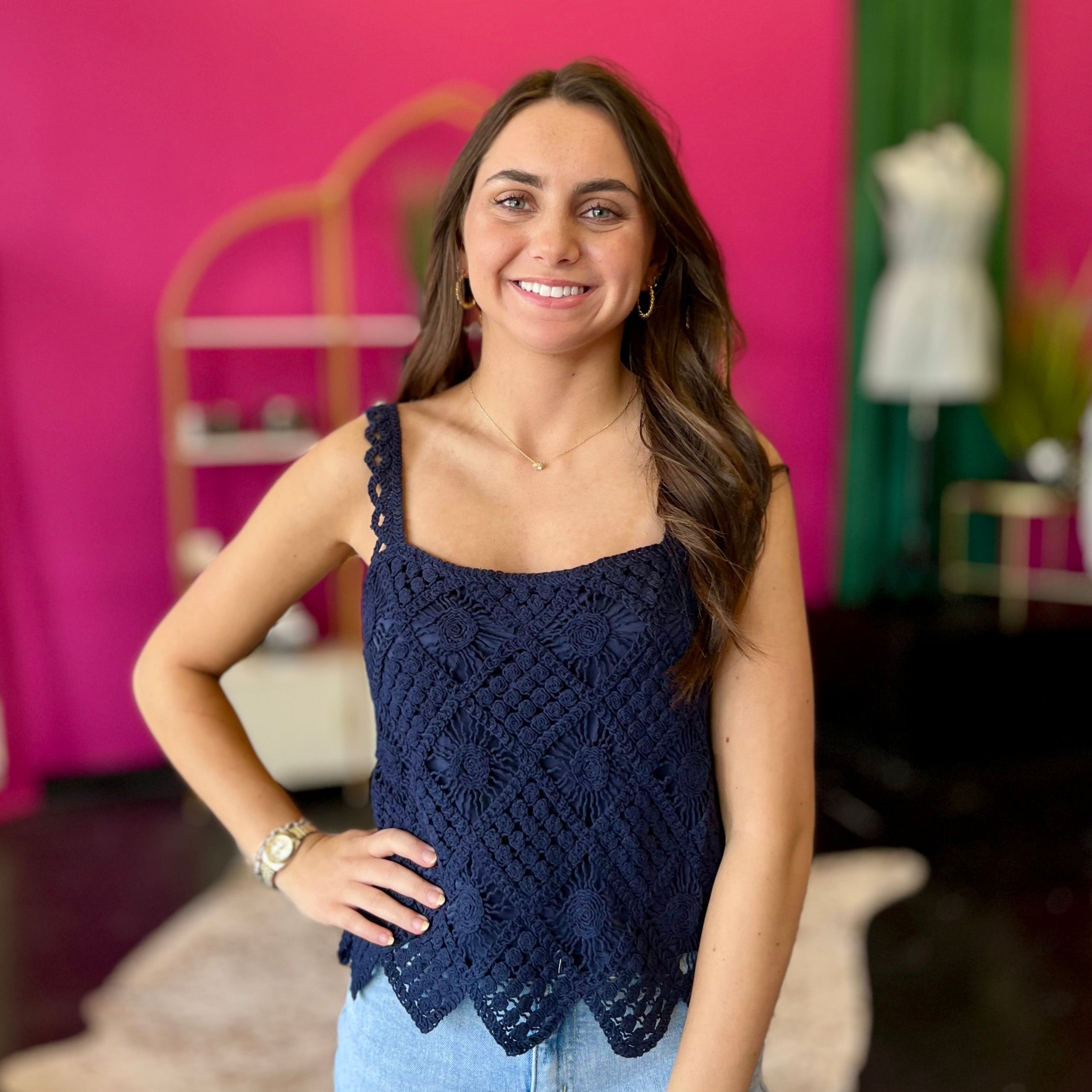 This Navy Diamond Crochet Top is the perfect blend of cute and boho charm. Featuring a lovely diamond crochet pattern, it adds a playful, breezy vibe to any outfit. The soft lining ensures comfort while keeping the look light and airy—ideal for sunny days or layering up with your favorite accessories. Embrace effortless style with this charming, must-have piece!