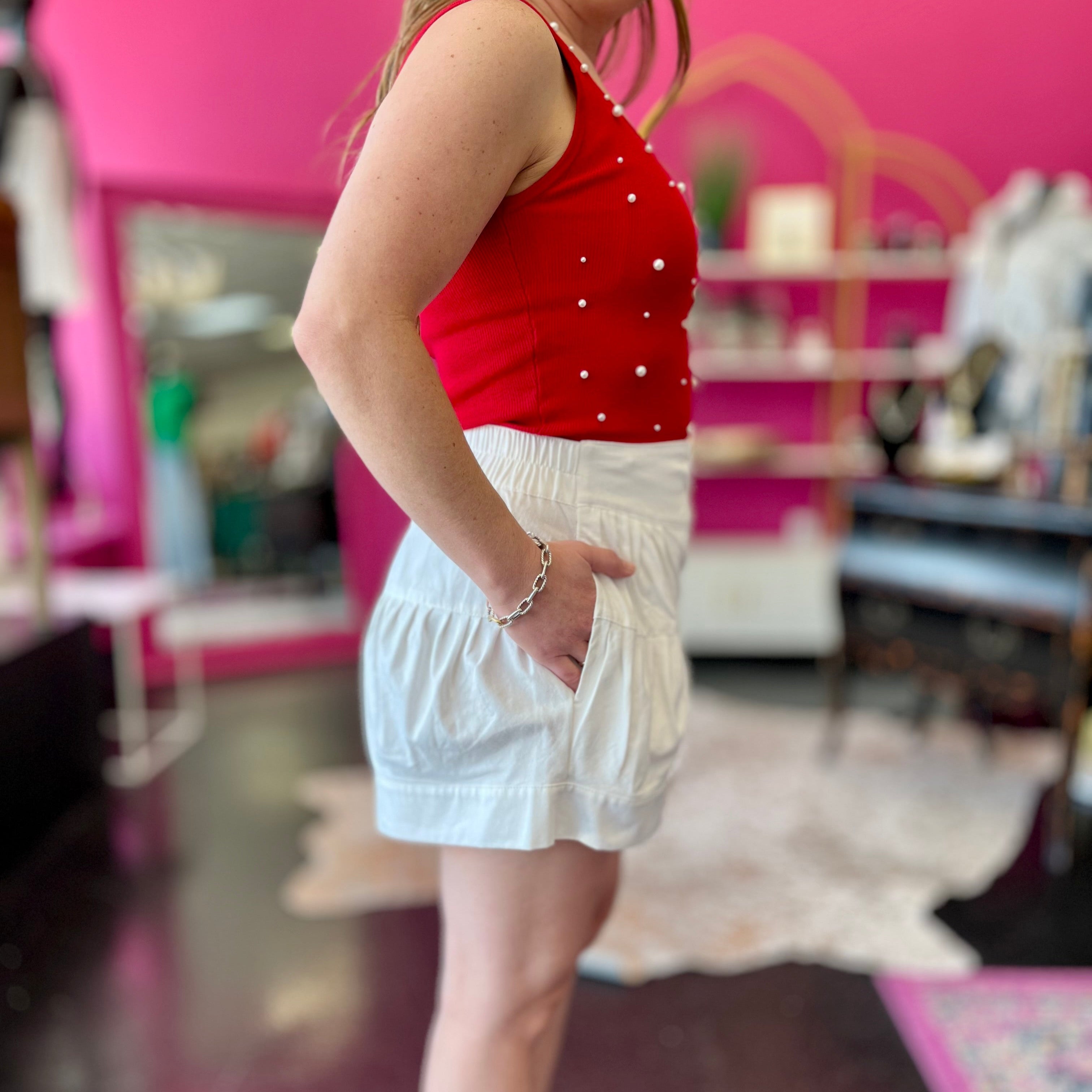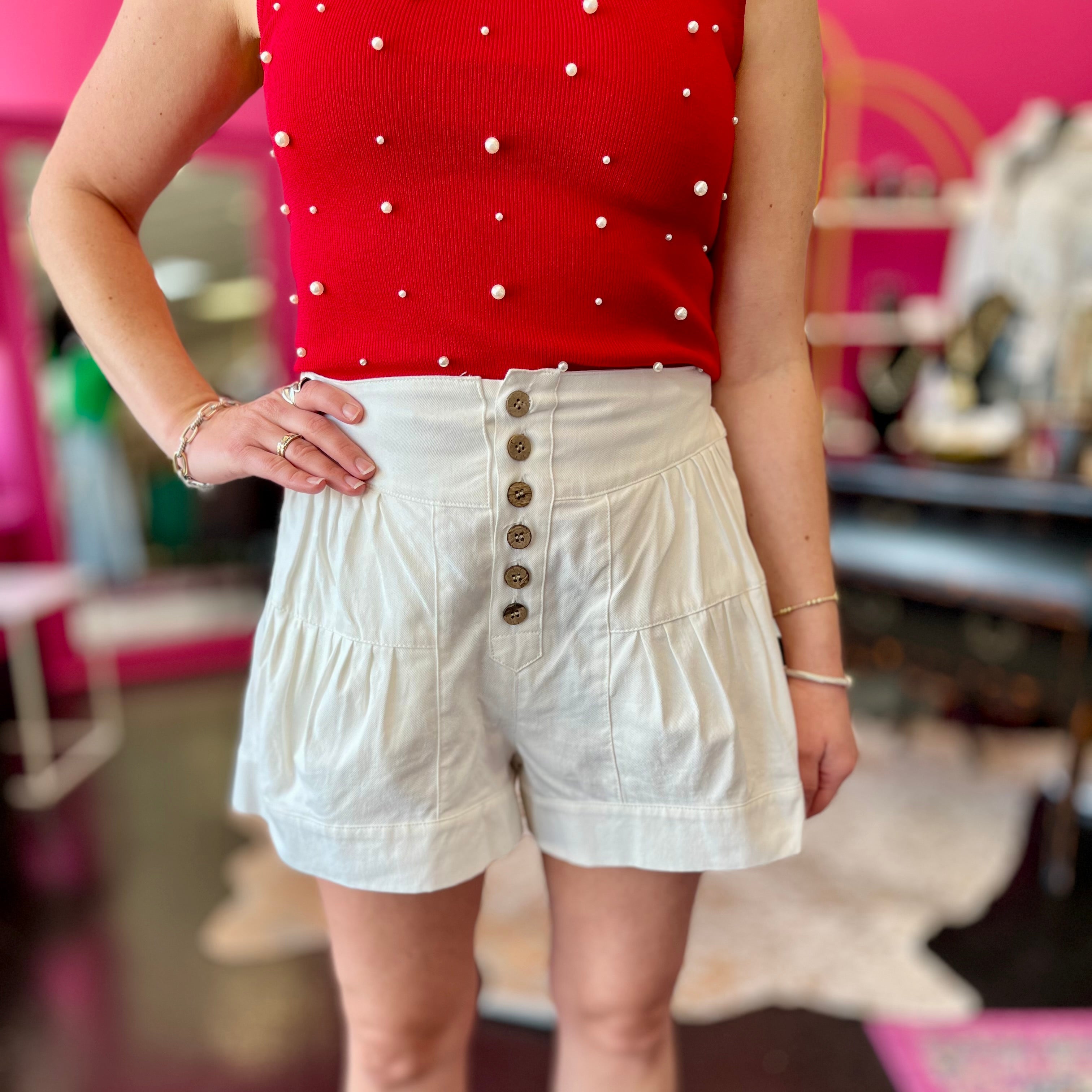 These White Button Down Denim Shorts are the perfect playful addition to your summer wardrobe. Featuring an adorable button-front design, they add a fun twist to classic white shorts. The pinched waist offers a flattering fit that’s both comfy and stylish, making them your go-to for sunny days and casual outings.