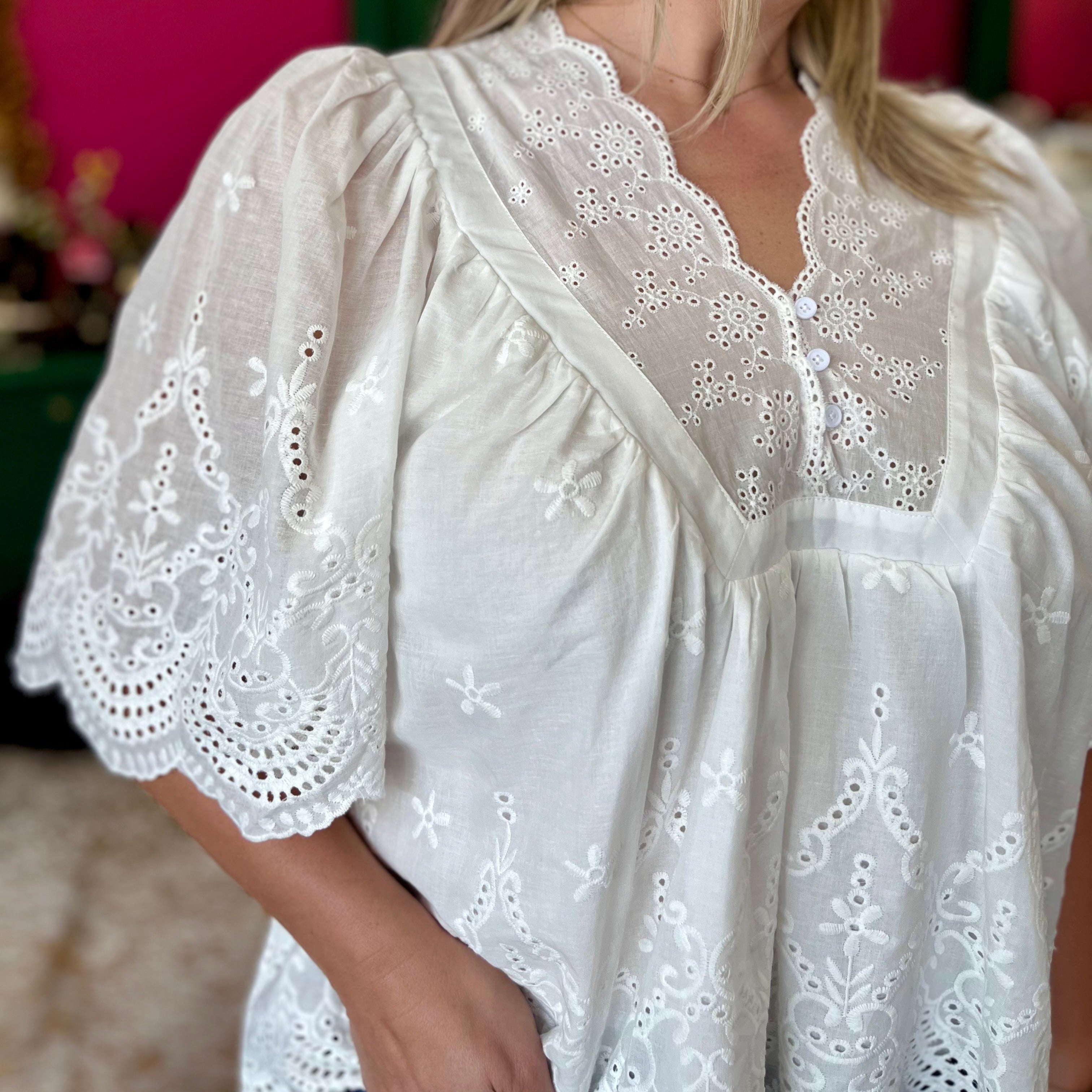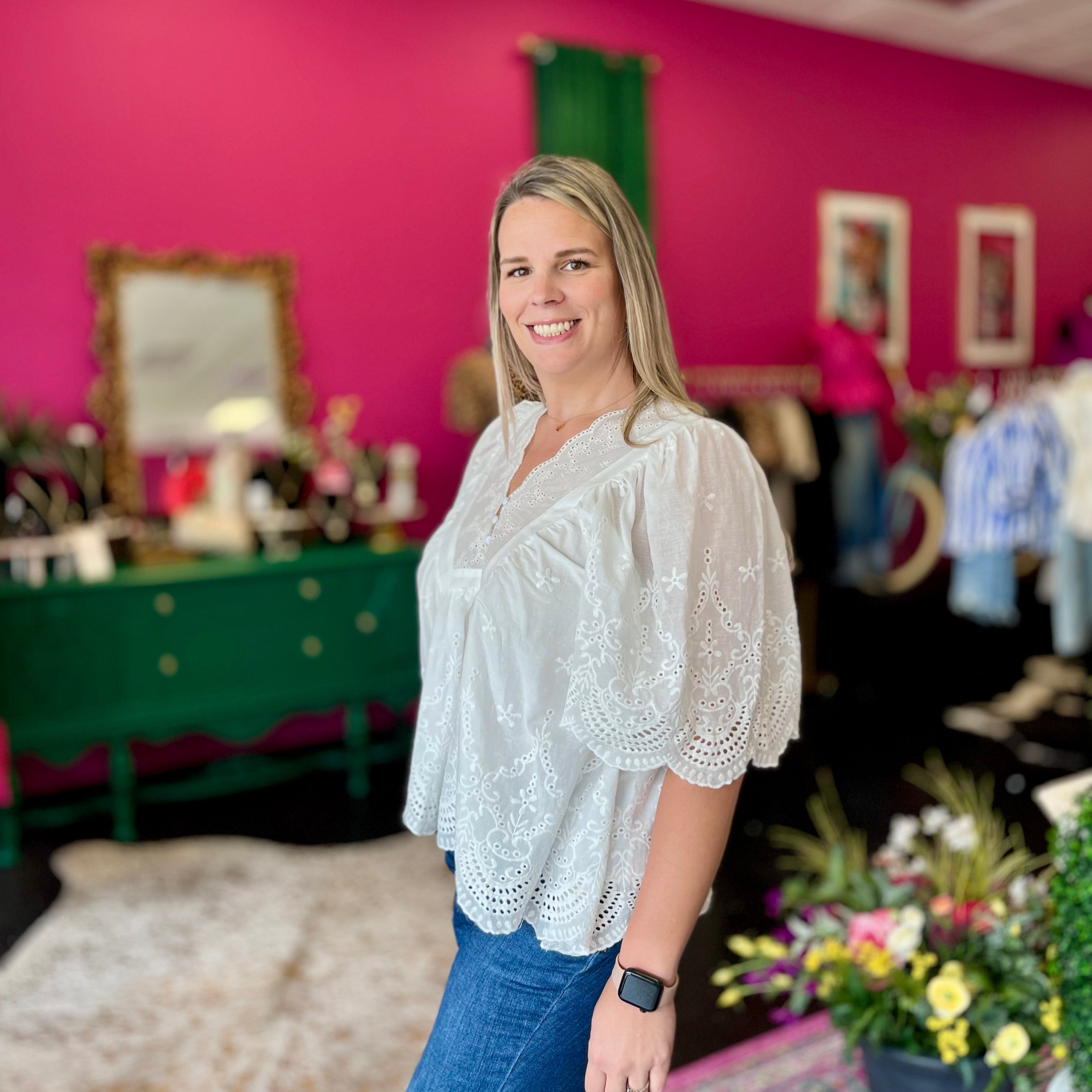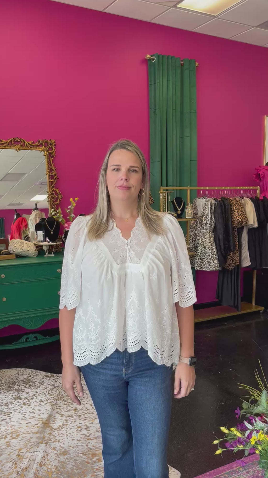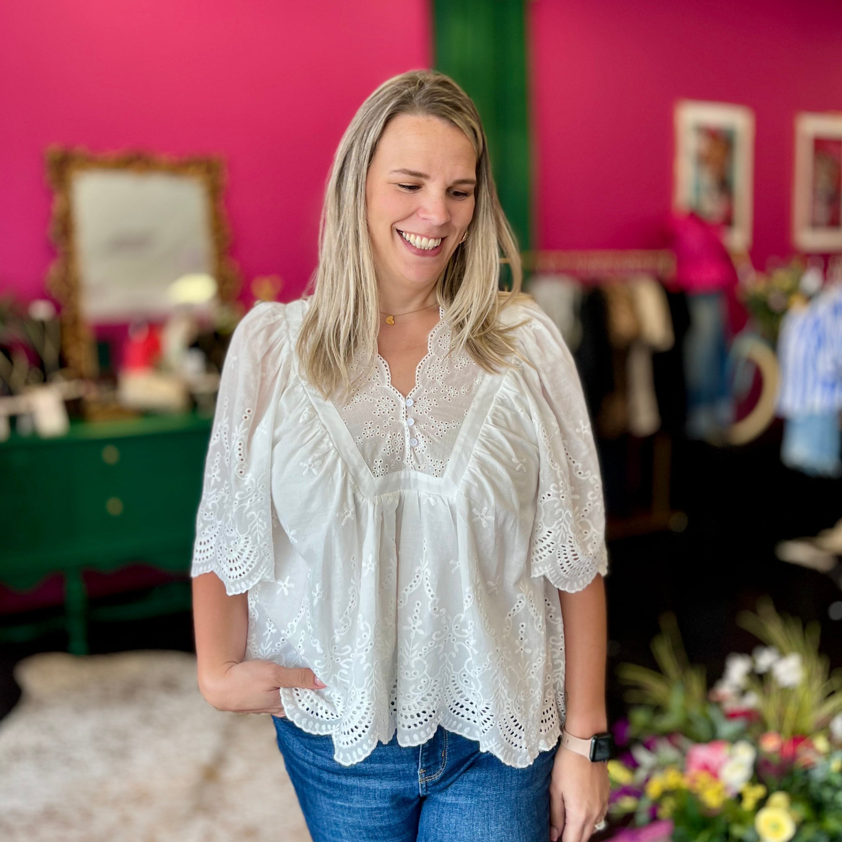 Introducing our White Eyelet VNeck Boho Top! With charming eyelet trim, scalloped edges, and a light weight design, this top is perfect for hot weather. You'll love this cute and stylish addition to your wardrobe.