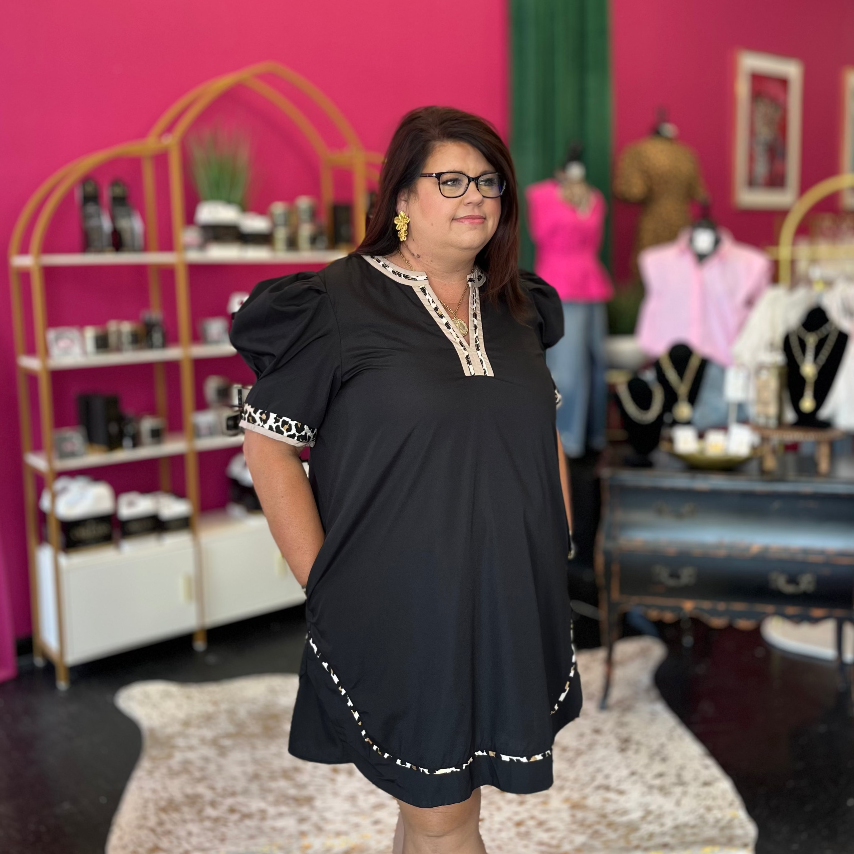 Step into fall with this playful Black & Leopard Trim Dress, featuring subtle leopard accents that add a sassy touch to your look. Perfectly stylish and effortlessly cute, it’s the ideal piece to transition your wardrobe with flair.