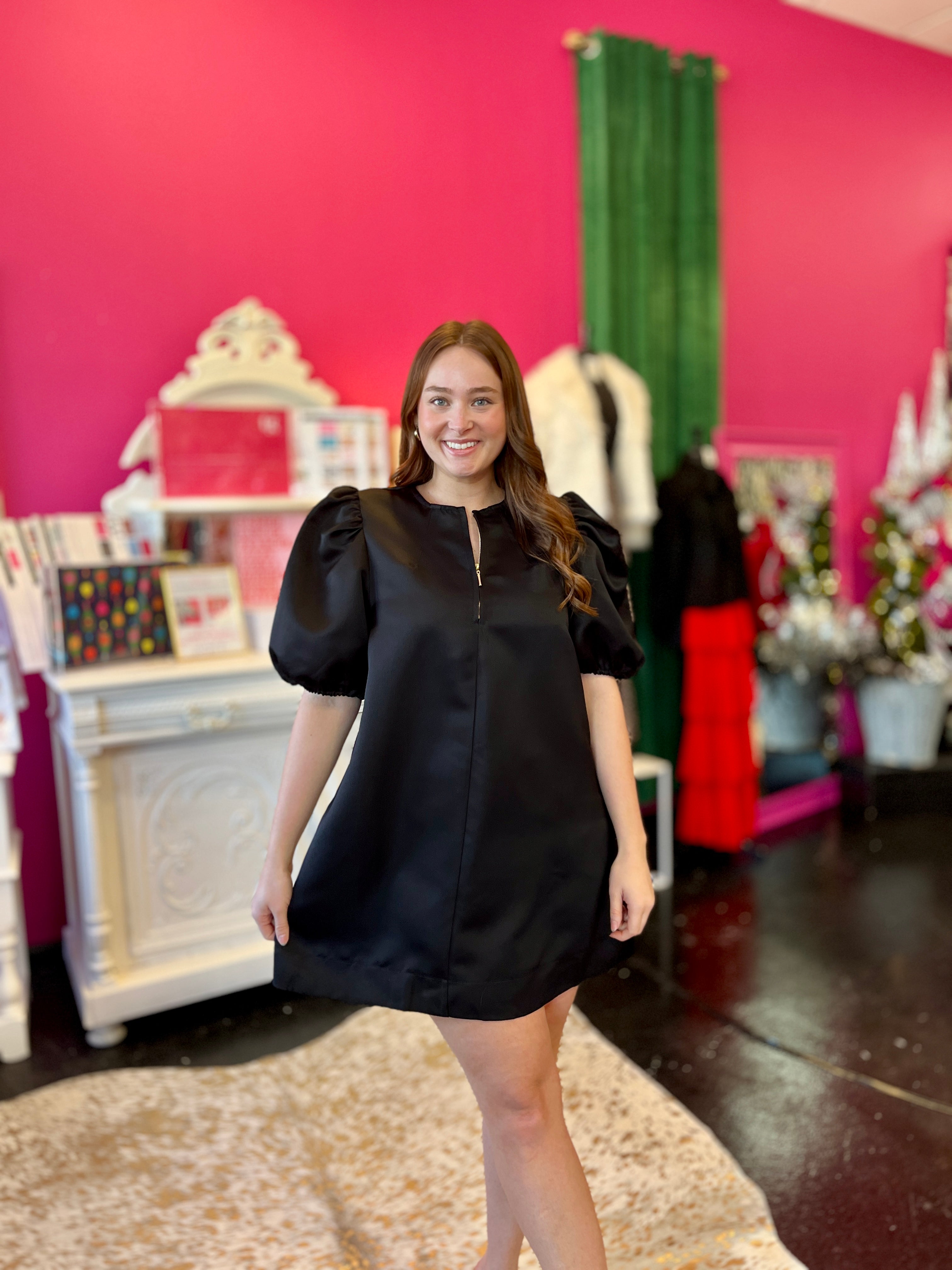Flaunt your holiday style with this sassy and stylish Black Satin Puff Sleeve Dress. Featuring a cute puff sleeve and a zip front neckline, this dress is perfect for any festive event. You'll be the center of attention in this must-have dress!