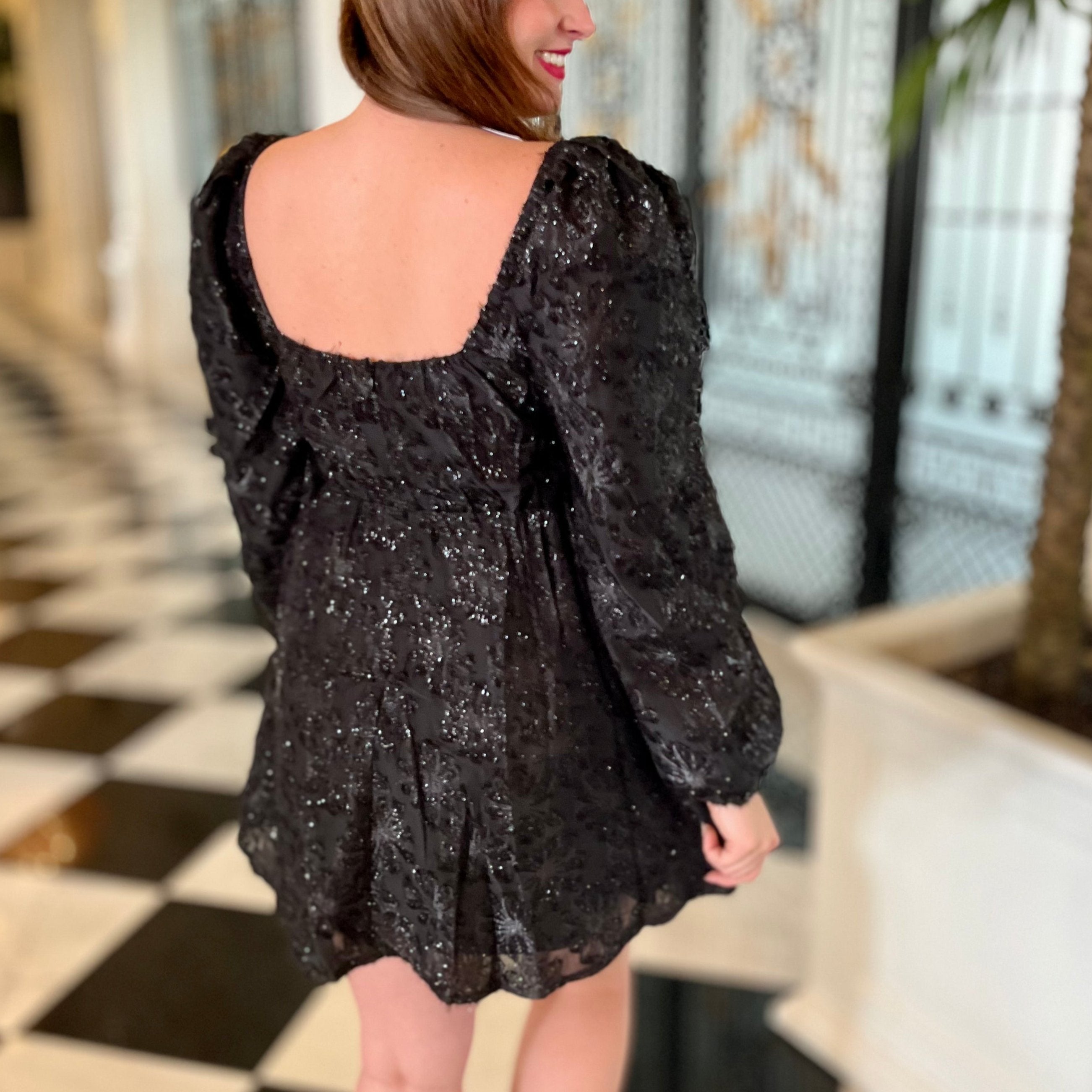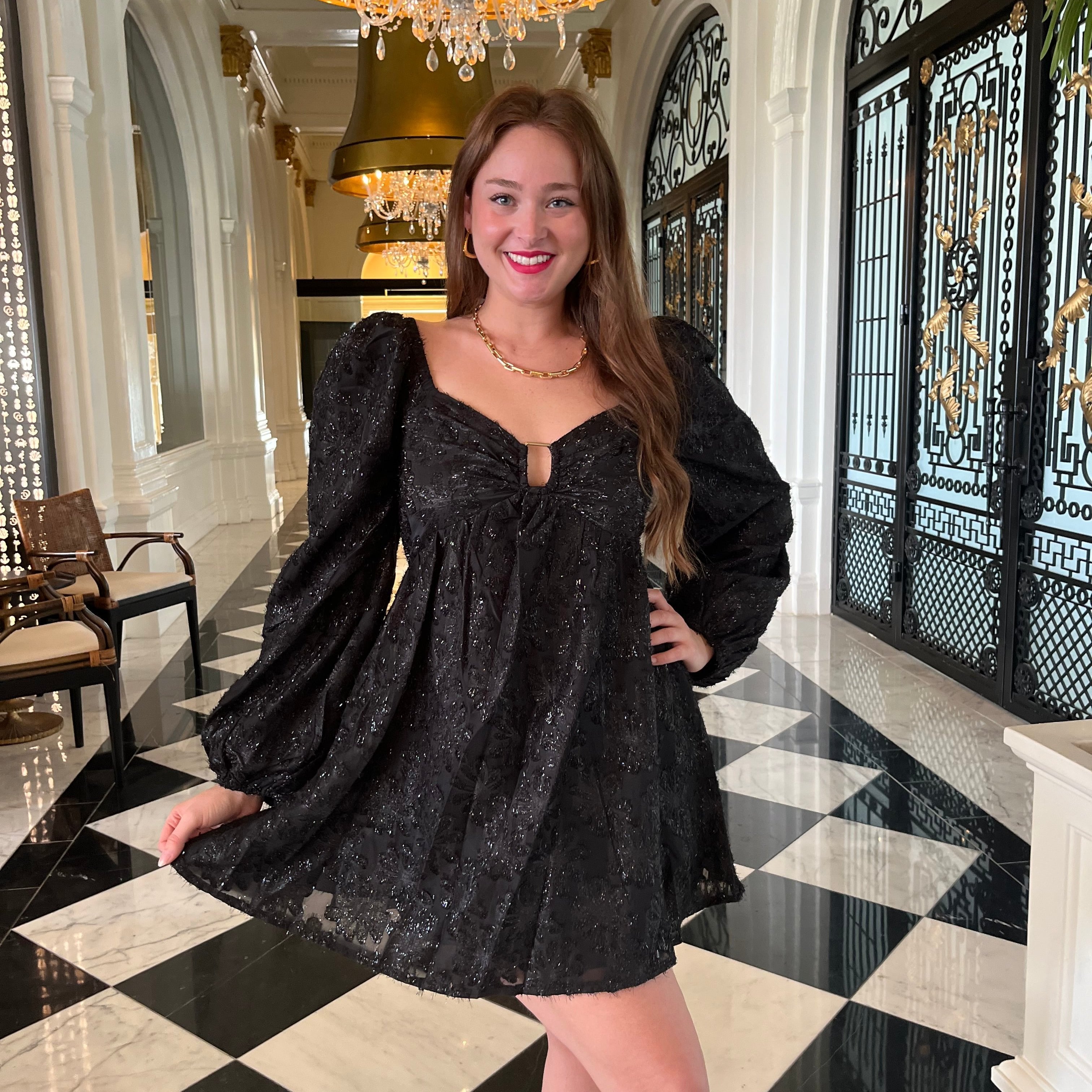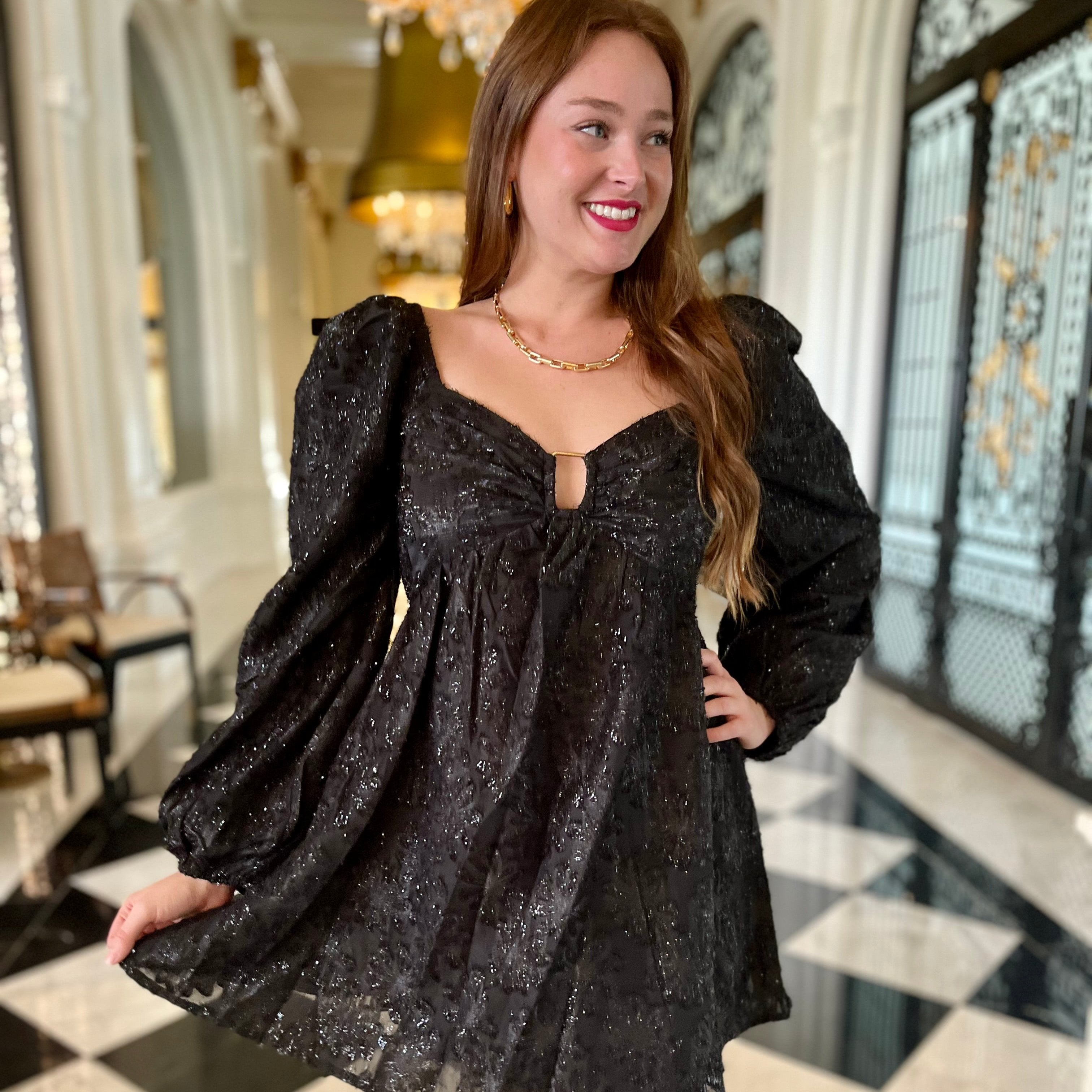 Answer the holiday party's call with this black textured chiffon babydoll dress. Bring out your cute side with its fun and flirty design. No need to take yourself too seriously, just have fun and slay!