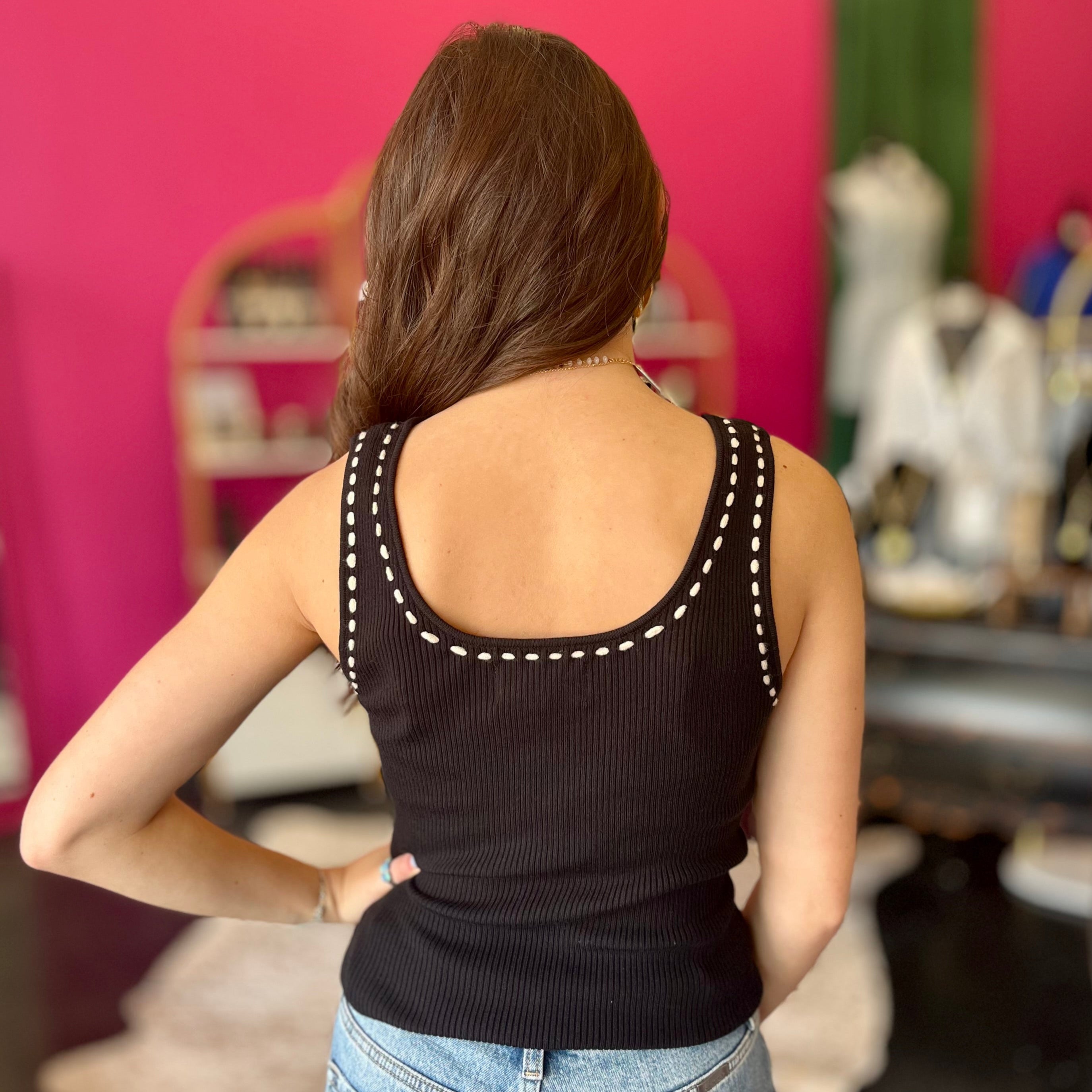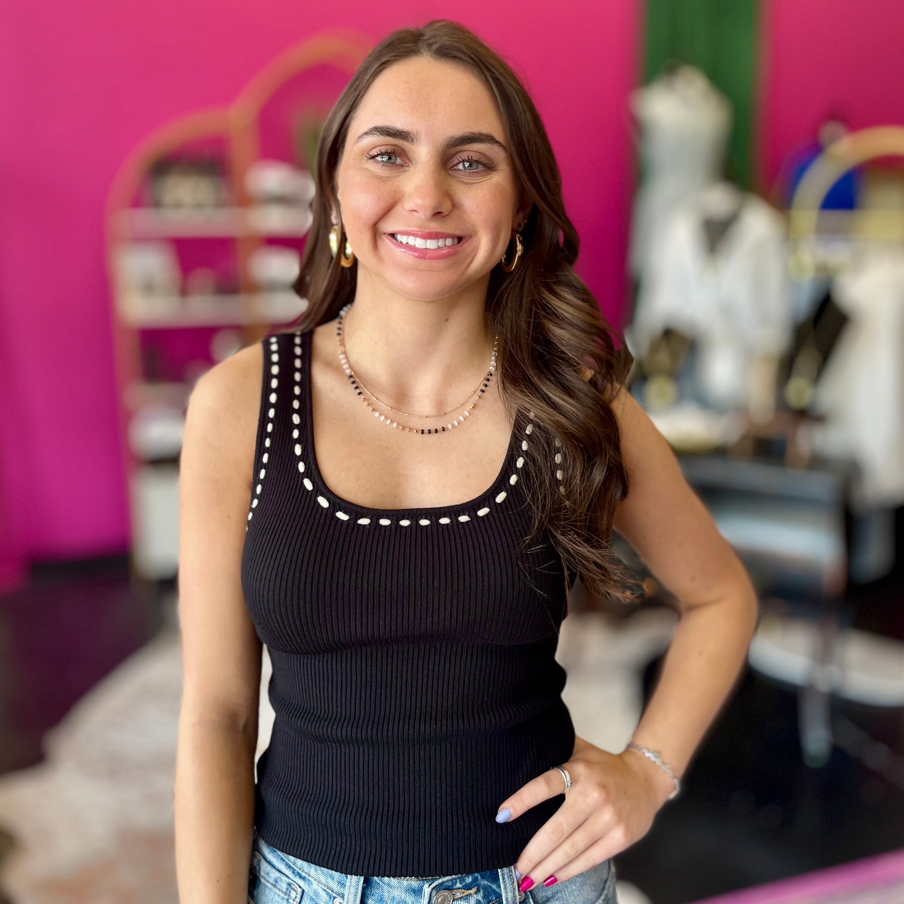 This Black Whipstich Ribbed Tank is your new go-to for effortless style and comfort. Featuring a cream whipstitch design around the neckline, it adds a fun, flirty touch to your look. Super soft and stretchy, it moves with you all day long—perfect for layering or wearing solo when you want to keep it cool and casual.