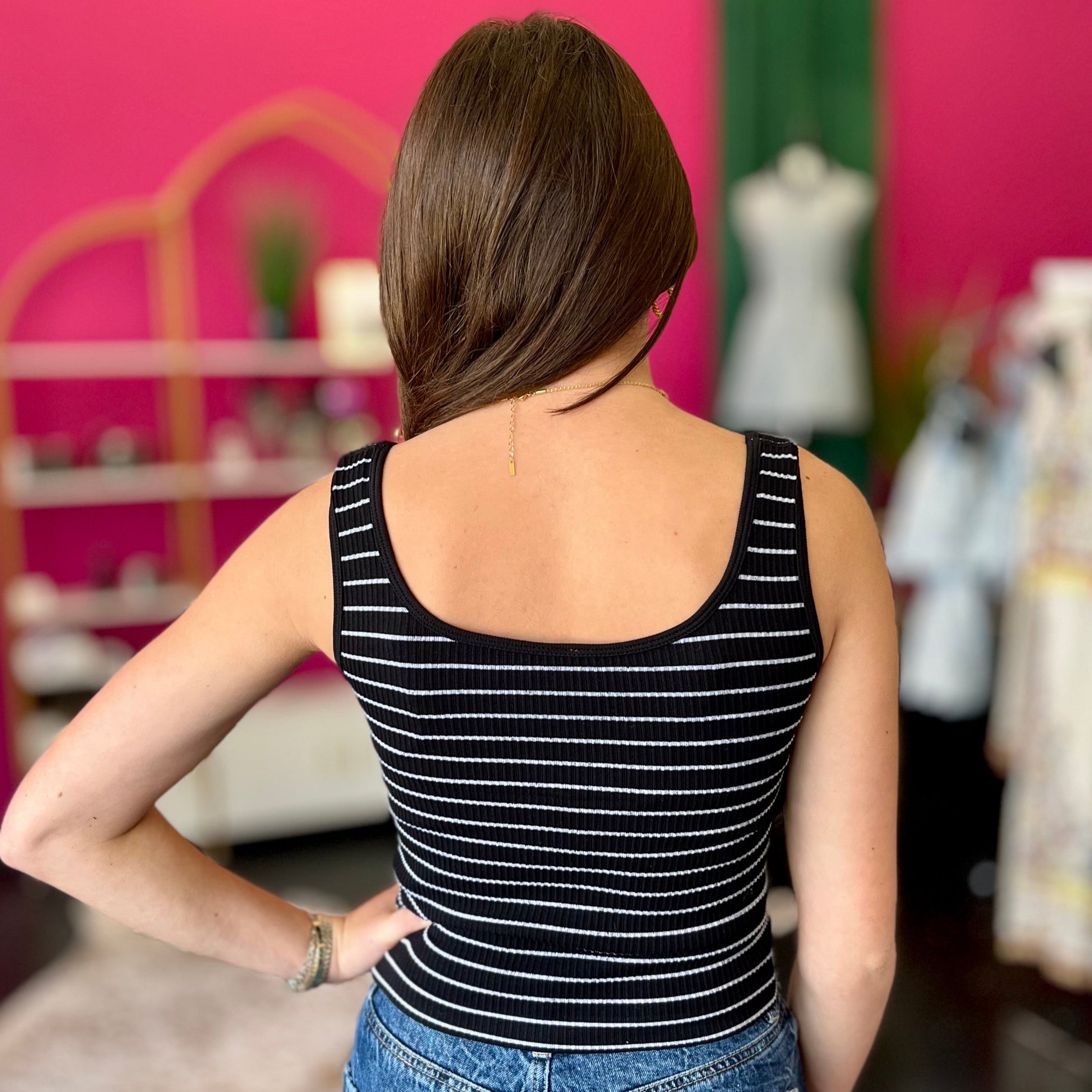 This Black & White Striped Seamless Tank is a fun and flirty addition to your wardrobe. The playful stripes pair perfectly with the snap button detail on the neckline, adding a touch of charm to your look. Comfortable and easy to wear, it’s a cute go-to for any casual day.