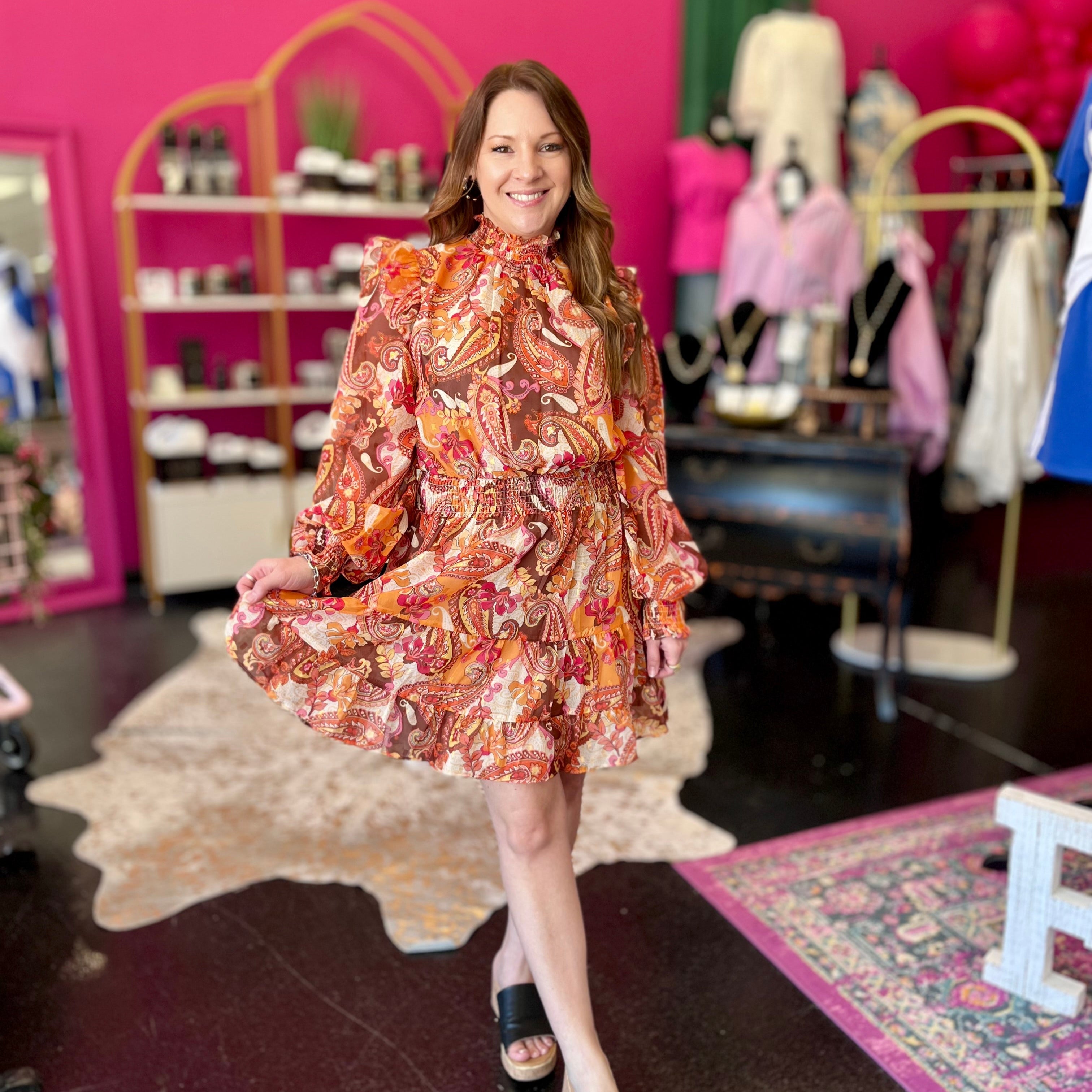 Embrace fall in style with this playful Brown Paisley Print Lurex Chiffon Dress. The lightweight chiffon fabric feels breezy and comfortable, while the gold metallic lurex adds a subtle shimmer that catches the light beautifully. The charming paisley print brings a touch of vintage flair, making this dress perfect for crisp autumn days when you want to look effortlessly cute.