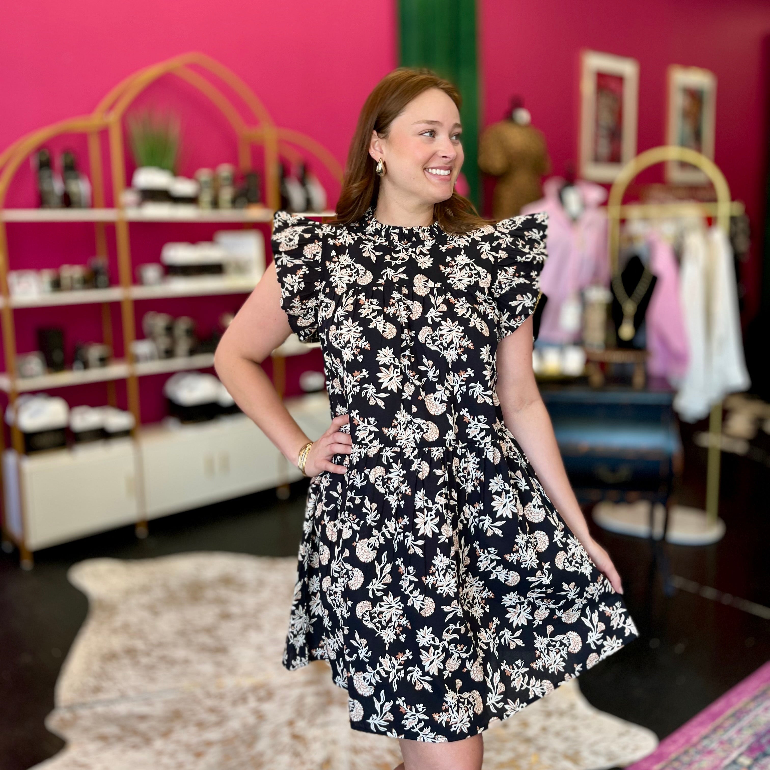 This Cannon Black & Ivory Floral Printed Dress is your go-to for a southern fall! Lightweight and breezy, it keeps you comfy while turning heads with its charming floral pattern. Perfect for layering or wearing solo, it’s a playful way to embrace the season in style.