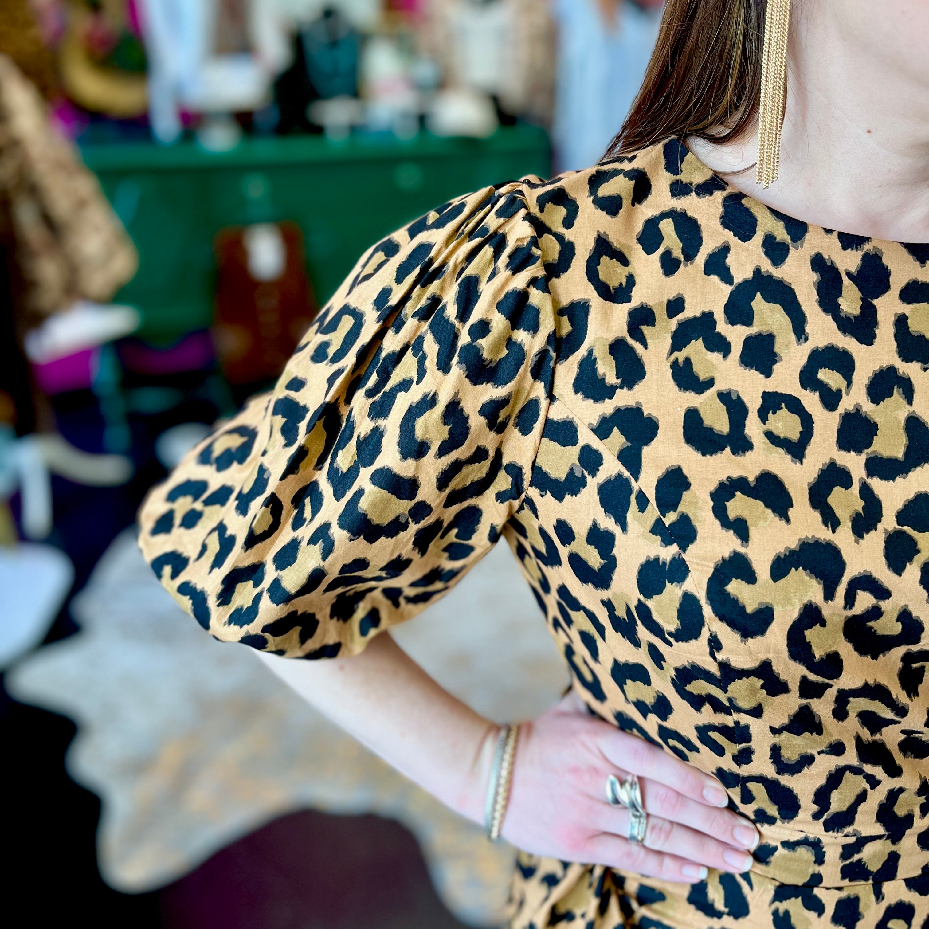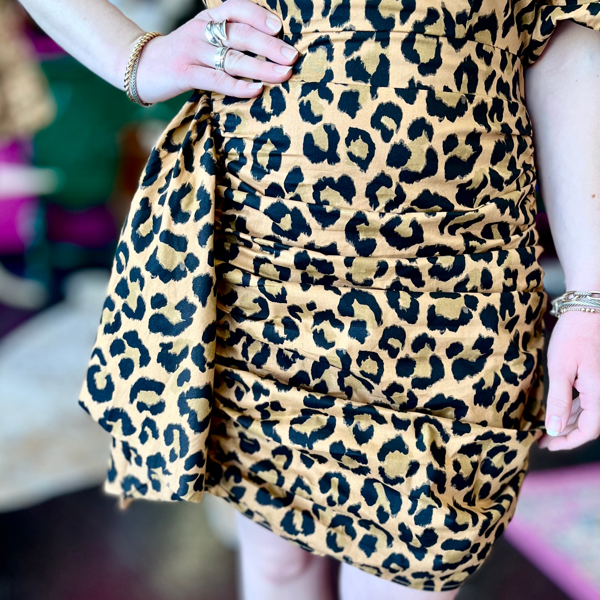 Unleash your wild side with this Leopard Ruched Puff Sleeve Dress. Perfect for leopard lovers, this dress is sure to make a statement at any occasion. Its ruched detailing and cute puff sleeves add a touch of playful charm to its already stylish design. Let your inner leopard shine!