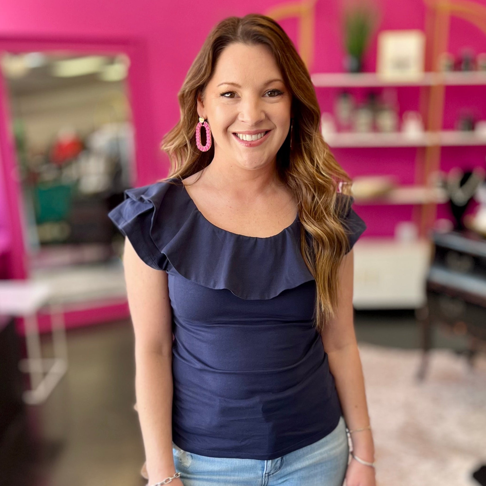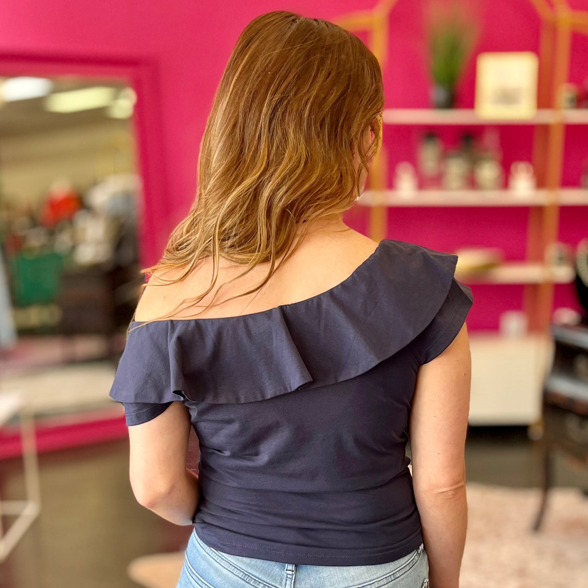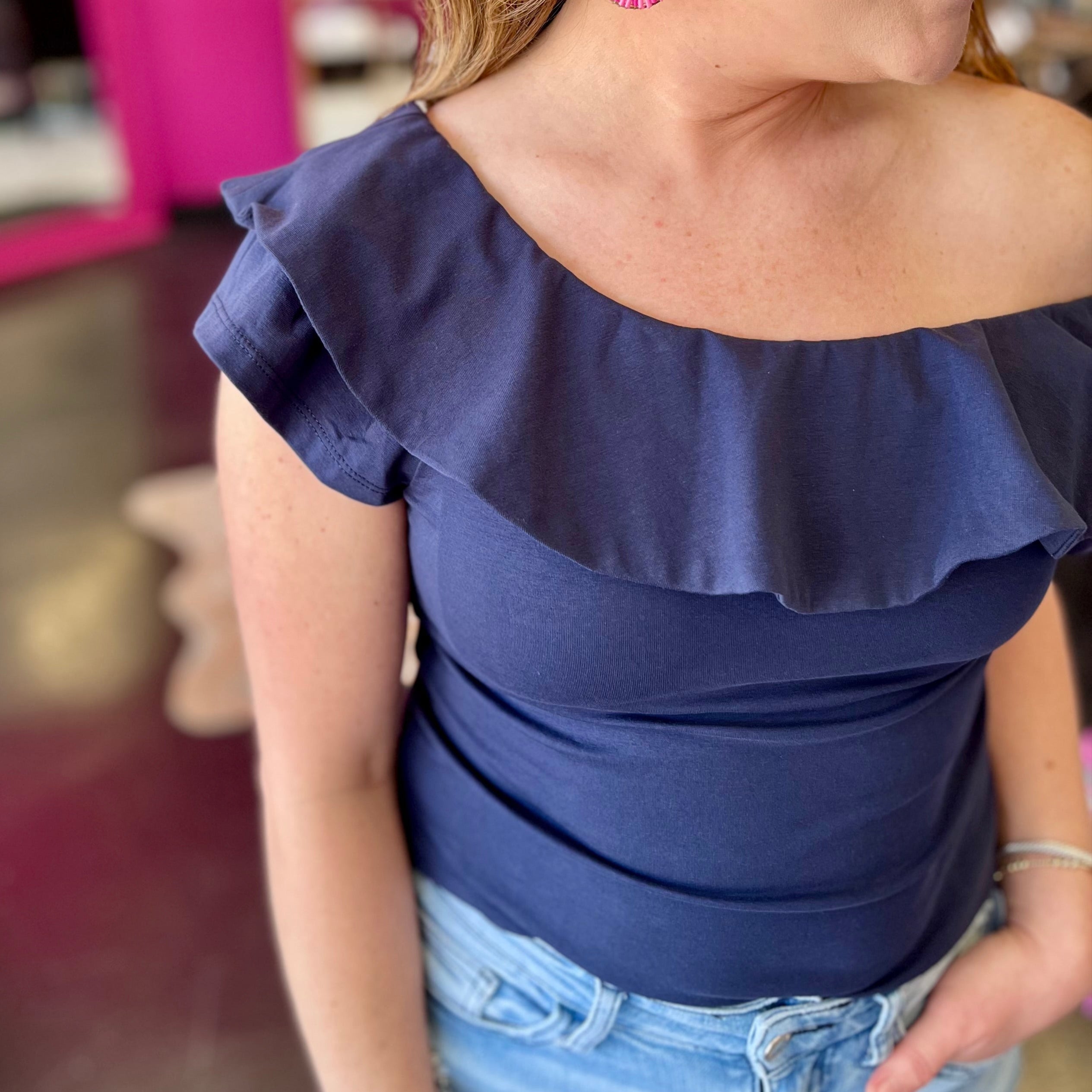 This Navy Wide Ruffle Off Shoulder Top is your new go-to for effortless style. Wear it on your shoulders or let it fall off for a flirty, fun look. Its versatile design makes it super easy to pair with anything in your wardrobe, adding a playful touch to any outfit. Perfect for days when you want to keep it cute and simple!