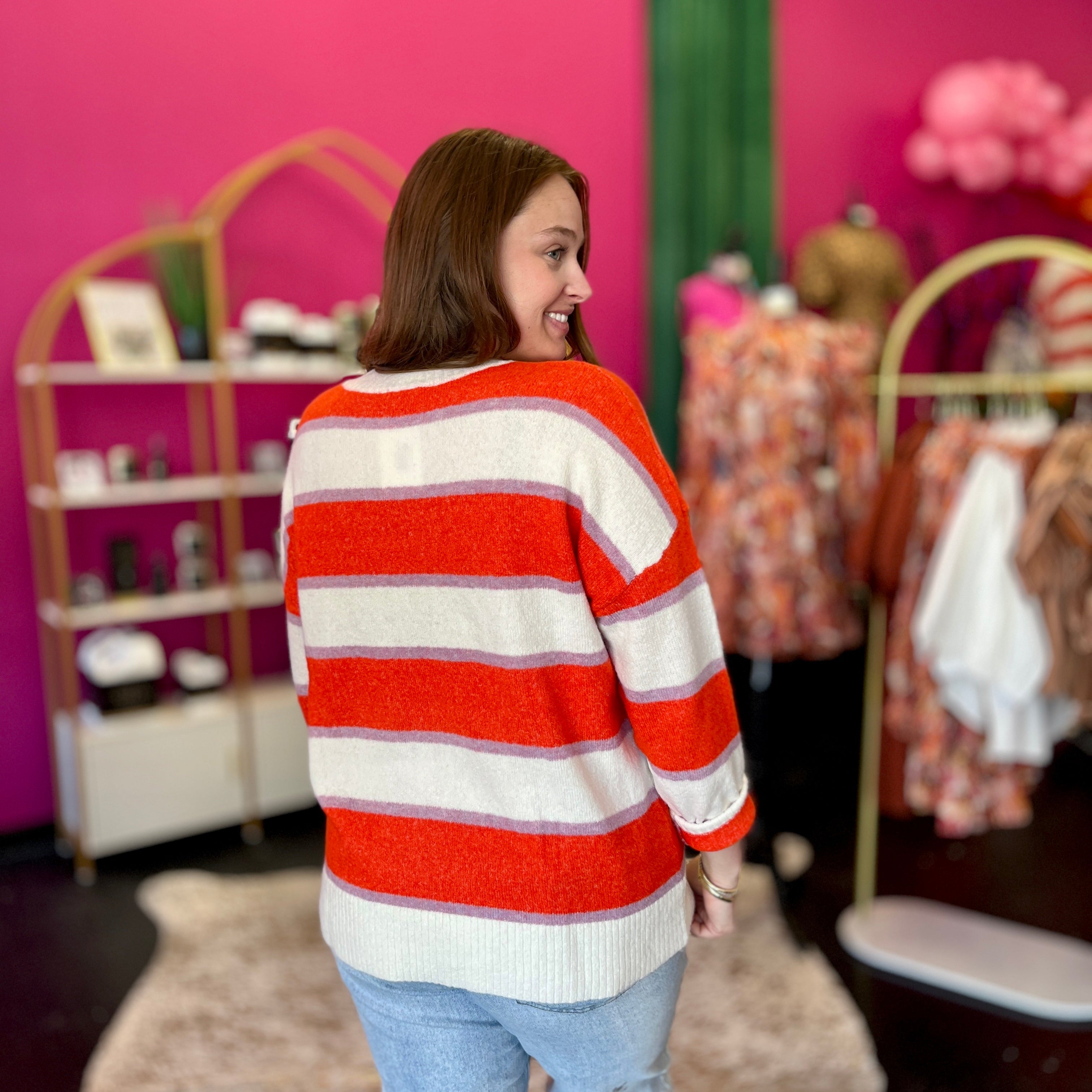 Embrace the cozy vibes of fall with this playful Orange & Ivory Striped Sweater. Its lightweight fabric keeps you comfy without the bulk, while the cheerful orange and ivory stripes paired with lilac trim add a fun pop of color. Perfect for layering on crisp days, this long-sleeve sweater brings warmth and style to your seasonal wardrobe.
