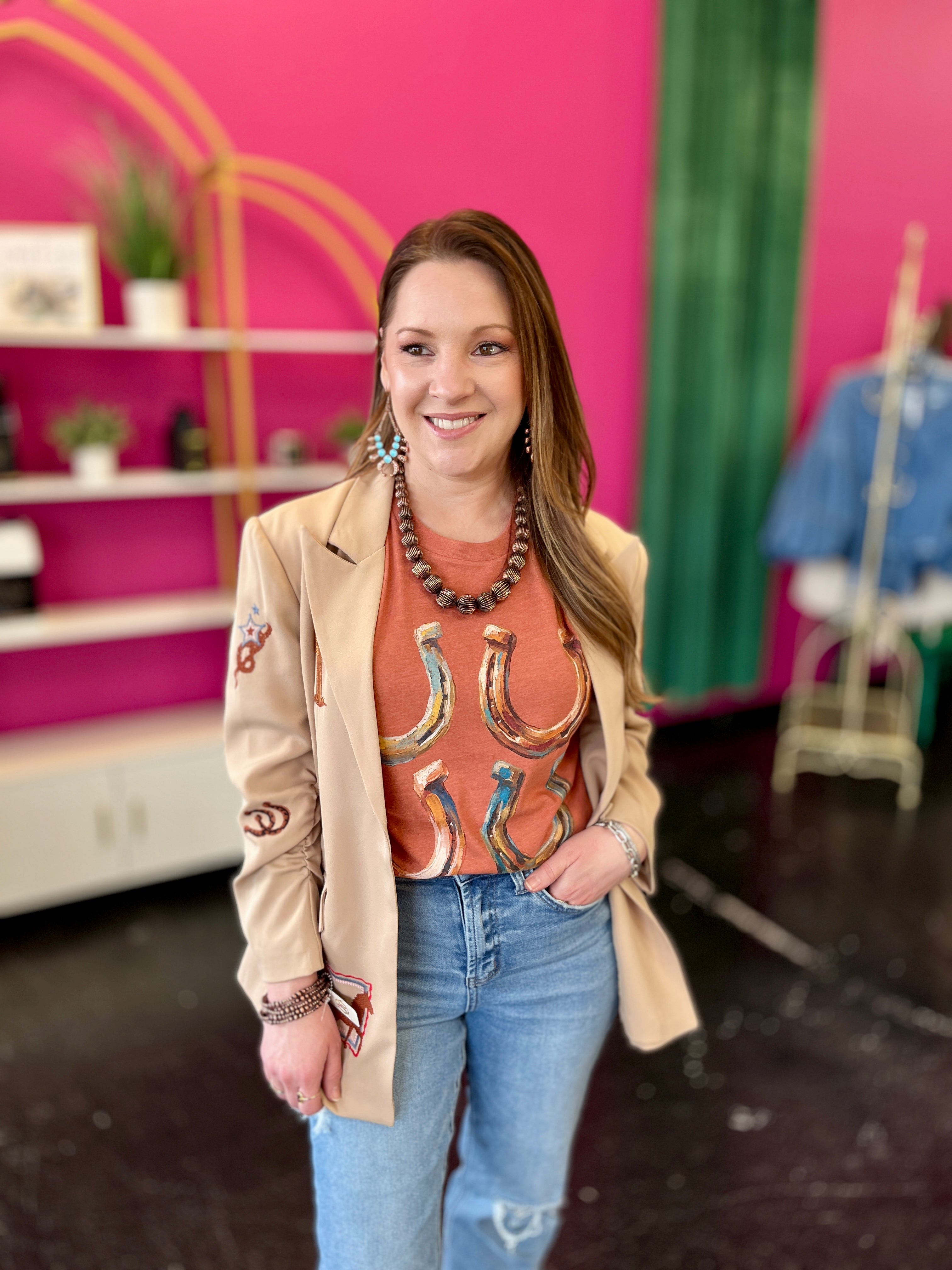 Saddle up for style with this adorable tan blazer featuring intricate embroidery western motifs throughout. Layer it over a denim top for a chic rodeo-inspired look, or throw it on over your favorite dress for instant personality. Perfect for adding that playful touch to any outfit while keeping things effortlessly cool and collected.