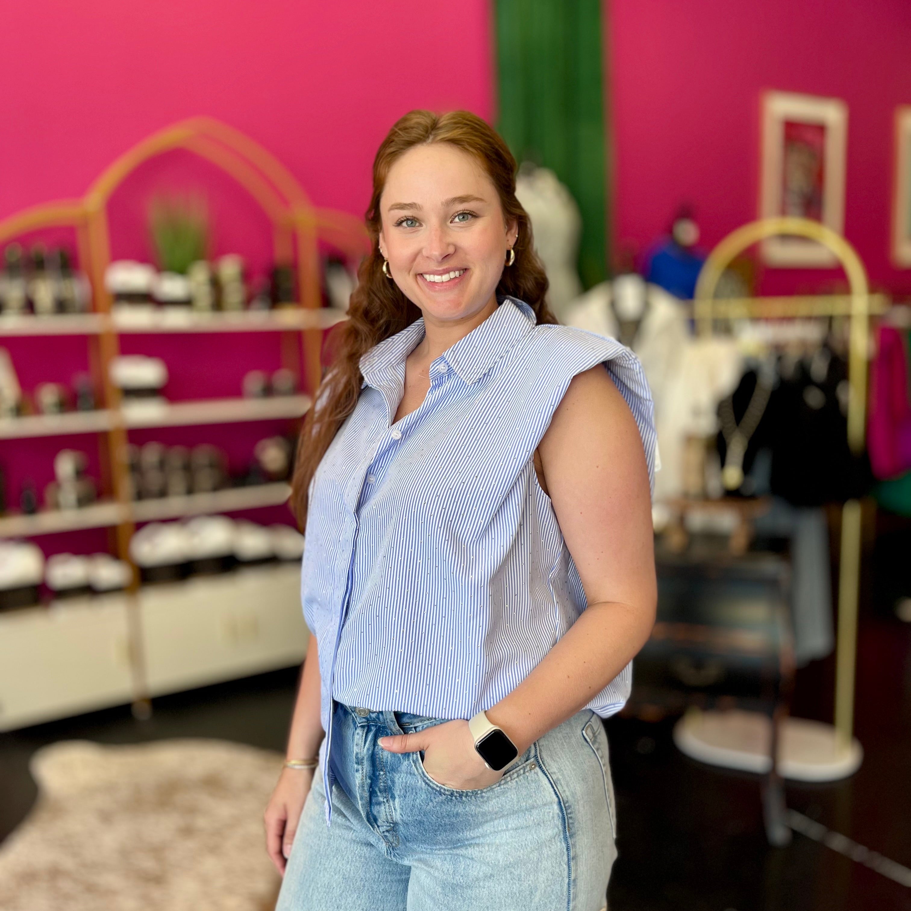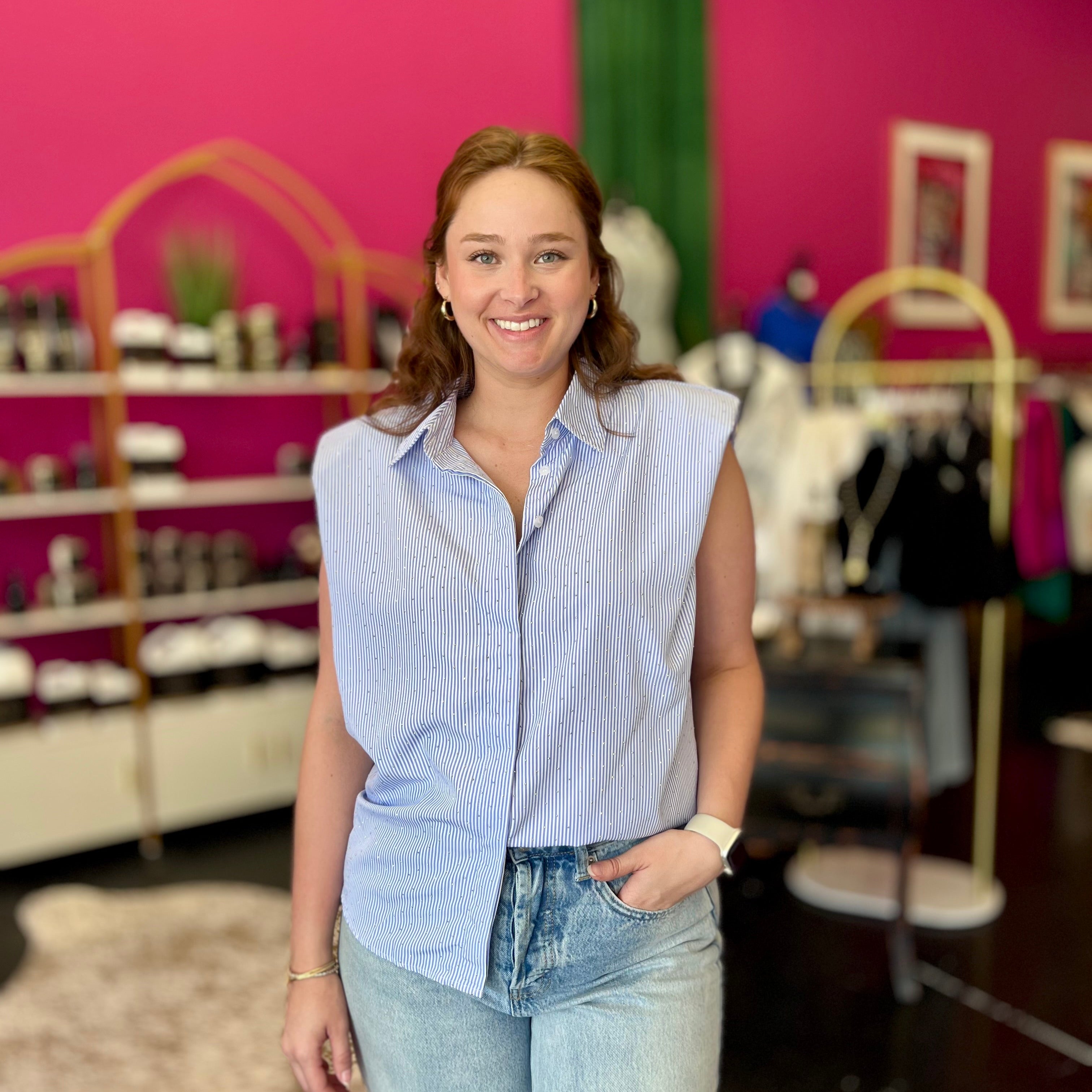 Add a touch of sparkle to your wardrobe with this Sky Blue & White Striped Crystal Top. Featuring playful cap sleeves and shimmering crystal accents, it’s the perfect blend of cute and chic. Whether dressing up or down, this top brings effortless charm and a little bling to any outfit.