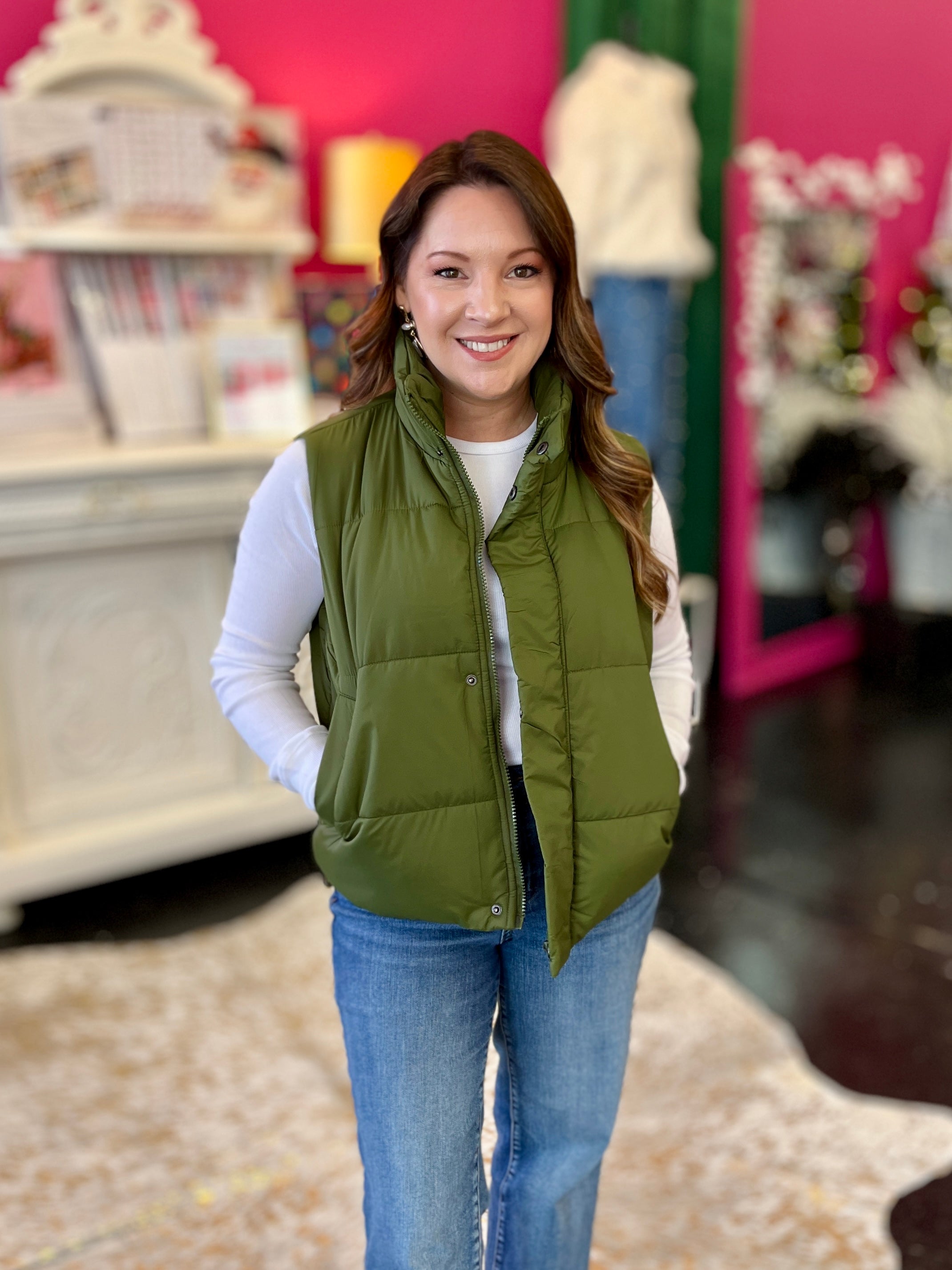 Stay cozy and stylish with the Steph Olive Puffer Vest—the cutest layering piece you'll want to grab all season! Its lightweight warmth makes it perfect for adding a pop of color and extra comfort over your favorite sweaters or tees. Whether you're heading out for a casual stroll or layering up for outdoor adventures, this vest brings playful charm and easy versatility to any outfit.