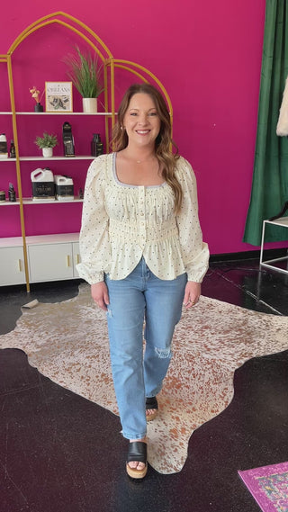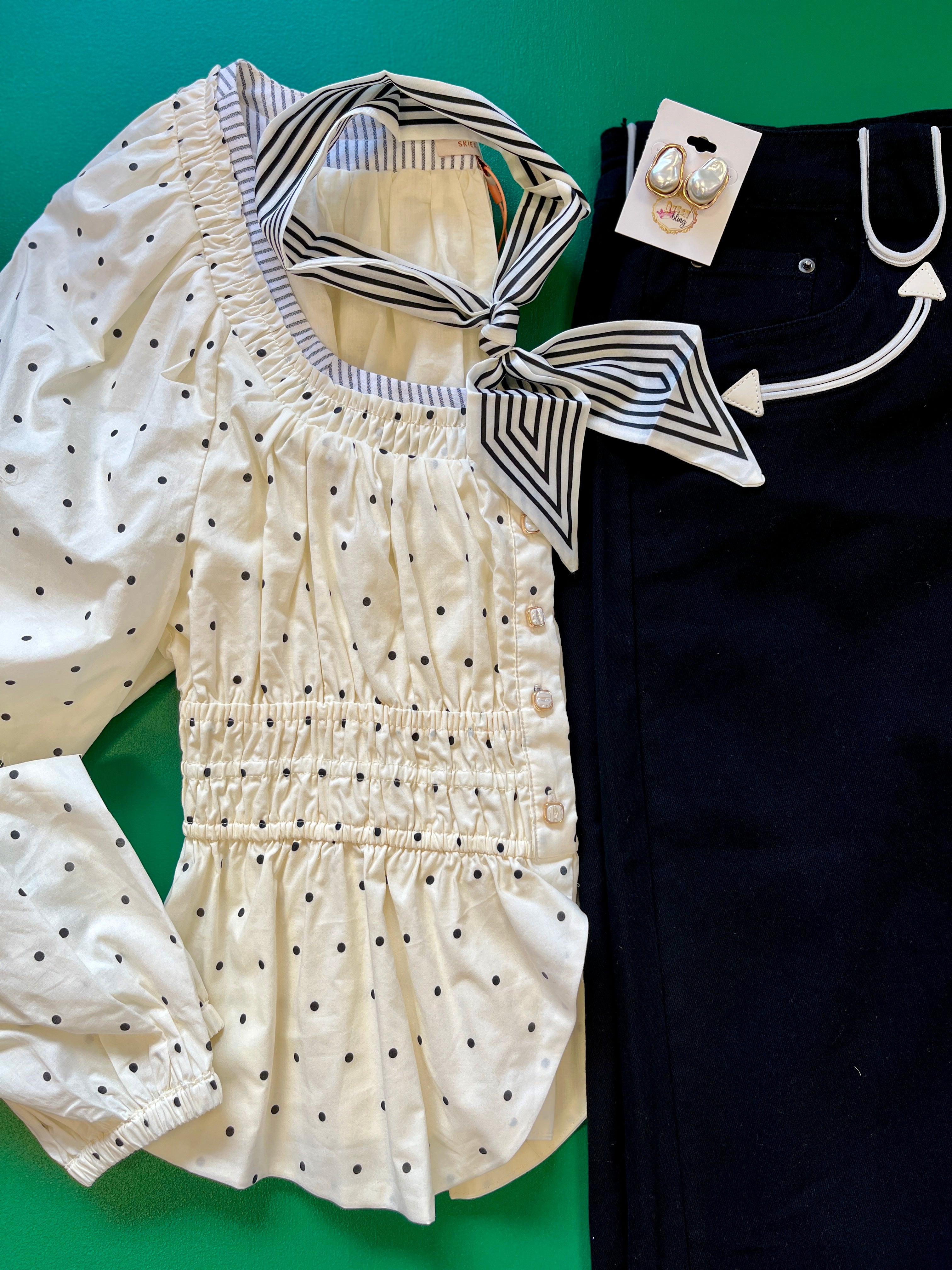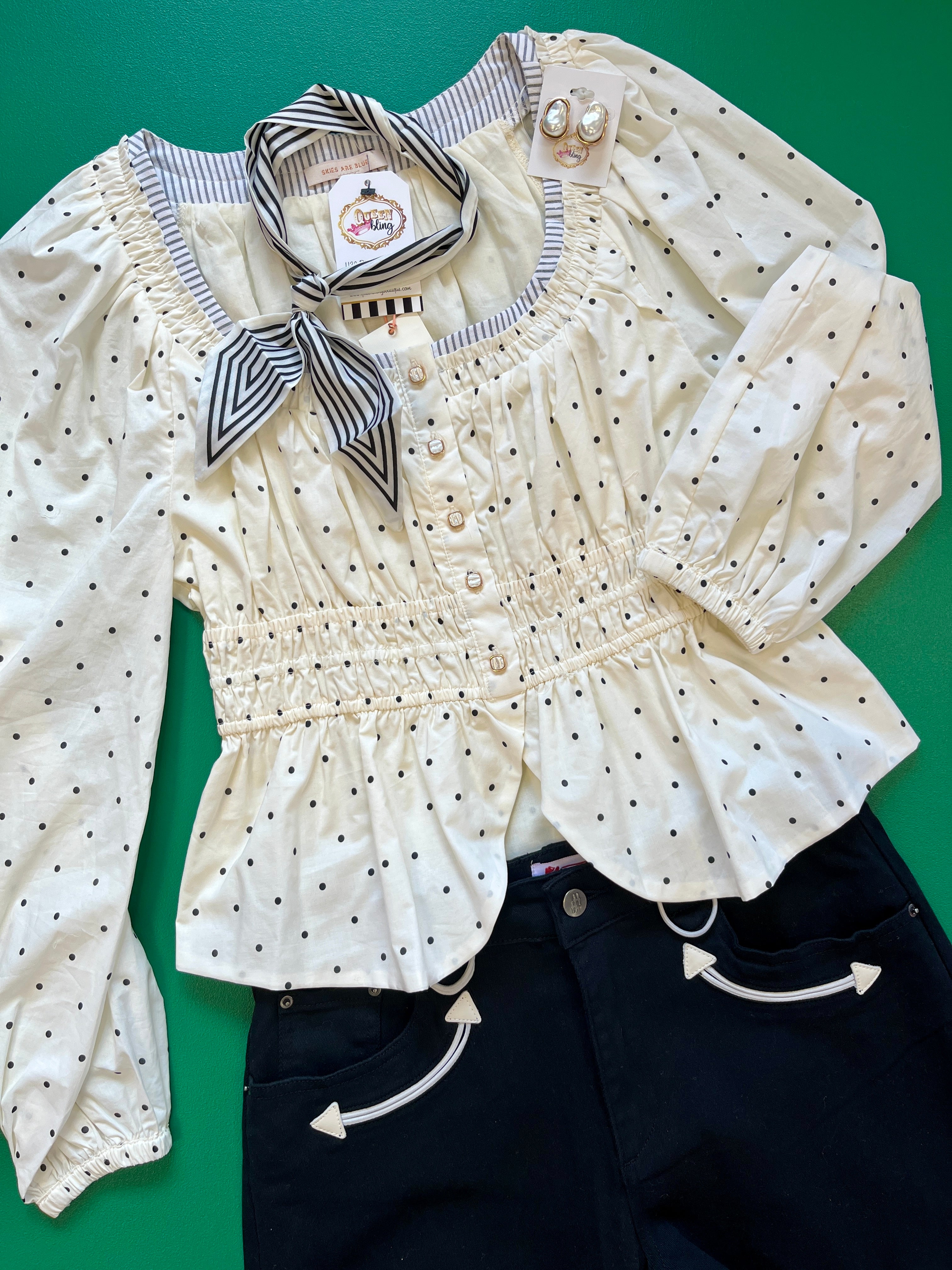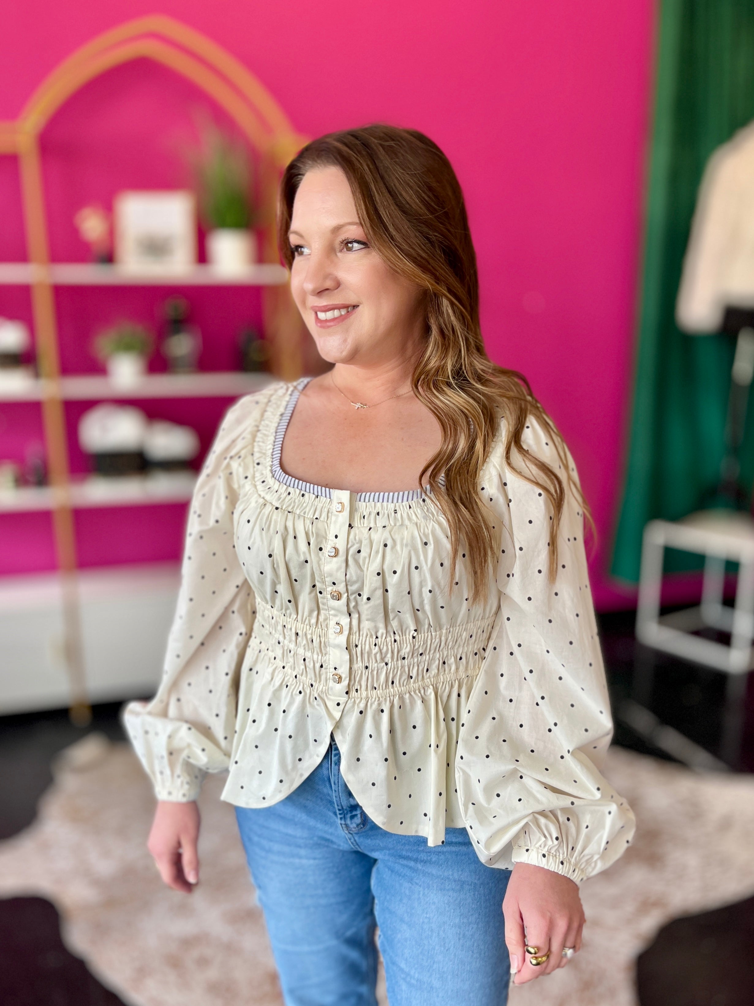 Adorable polka dot peplum top that's perfect for effortless style! Pair it with your favorite jeans for a casual vibe or dress it up with black pants for a polished look. This cute essential works for any occasion and instantly elevates your everyday wardrobe. Whether you're running errands or heading out with friends, this playful top is your go-to piece for looking put-together and feeling fabulous.