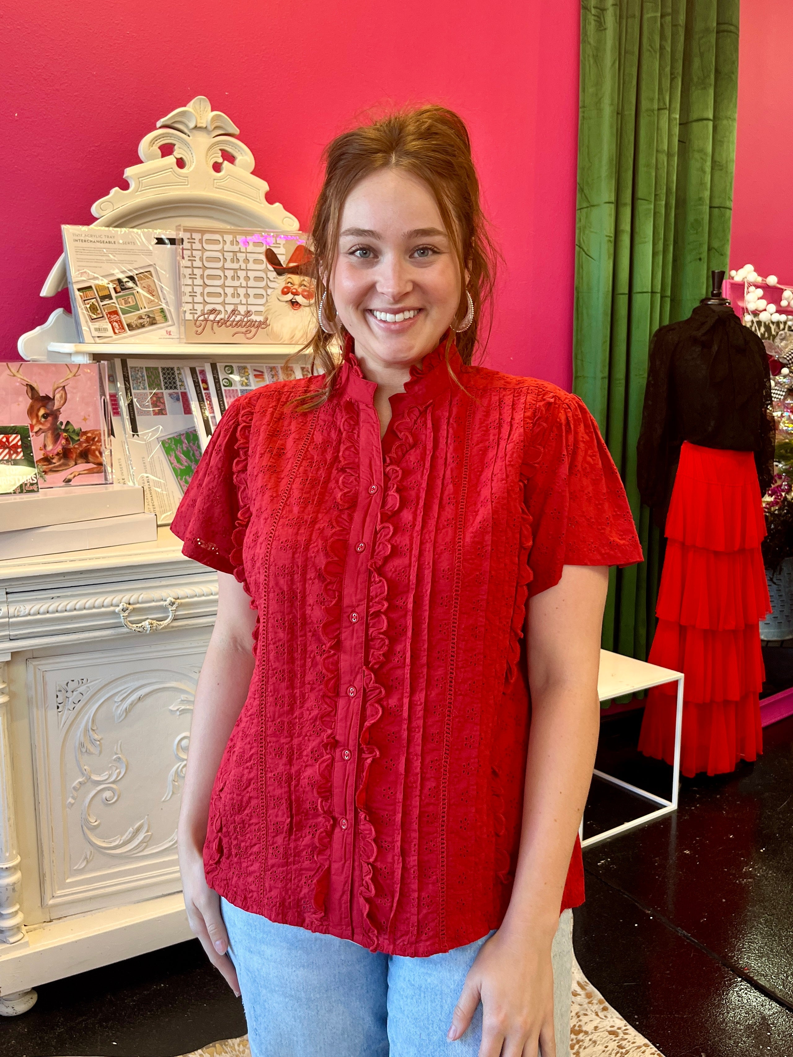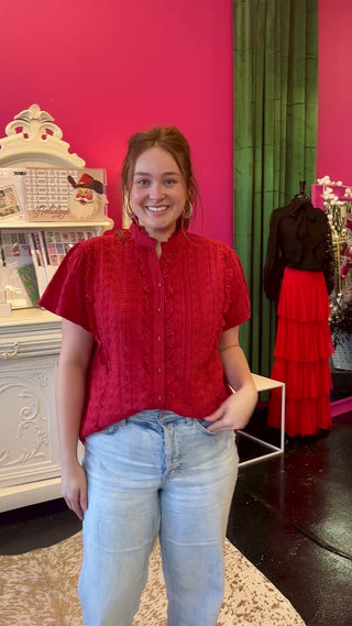 Slip into summer style with this stunning red eyelet top—the perfect pick for holiday celebrations in warm weather. The breathable short sleeves keep you cool while the vibrant hue turns heads at every gathering. Lightweight and effortlessly chic, this piece transitions seamlessly from beachside brunches to festive evening events. Embrace the heat in bold, beautiful color.