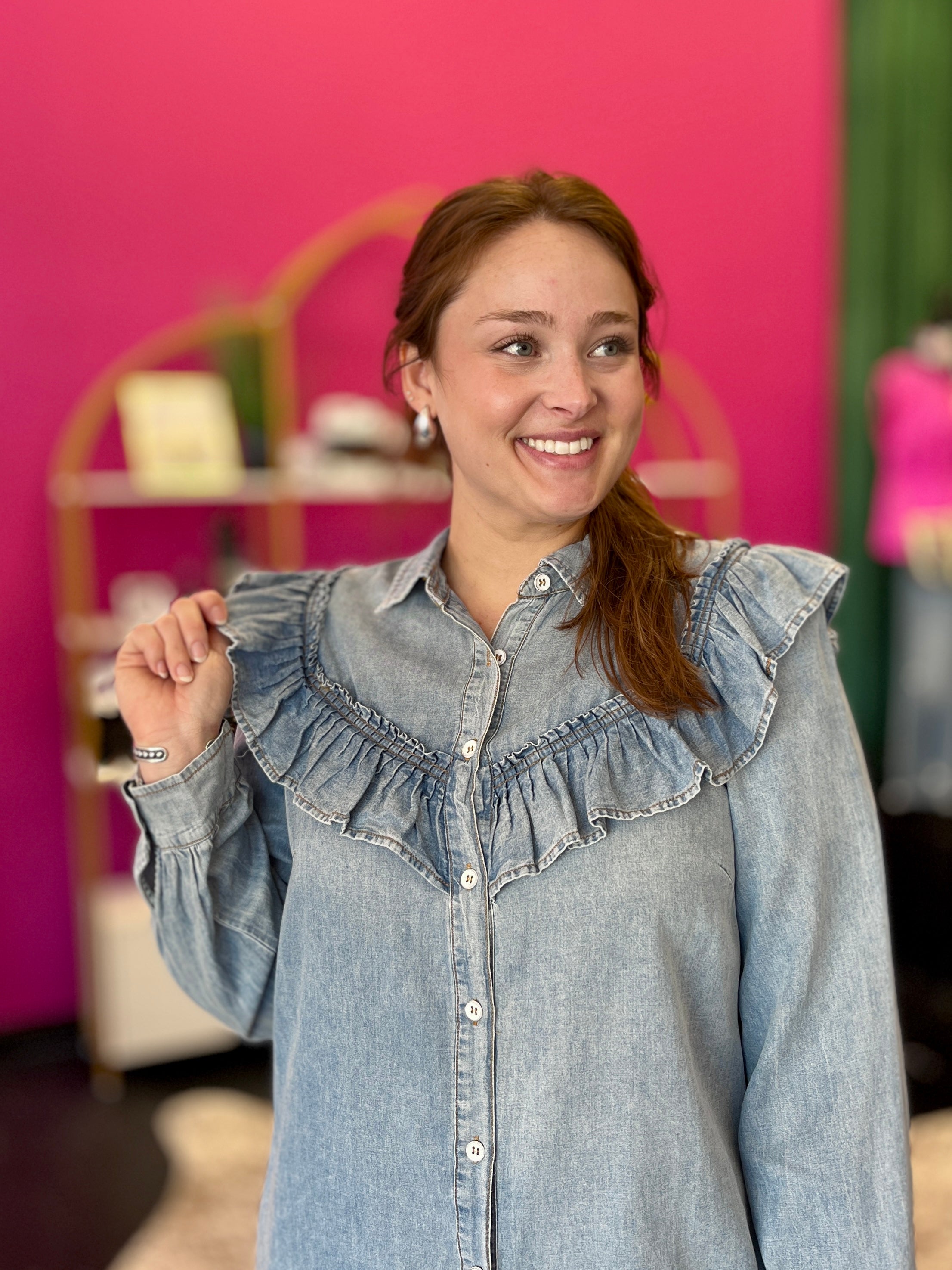 Meet your new fave wardrobe staple—the Chambray Denim Ruffle Dress! This playful piece pairs perfectly with booties, boots, or sneakers for effortless style every day. Its breezy chambray fabric and flirty ruffles add a fun twist, making it ideal for casual outings or weekend adventures. Get ready to turn heads in this versatile dress that’s as comfortable as it is cute!