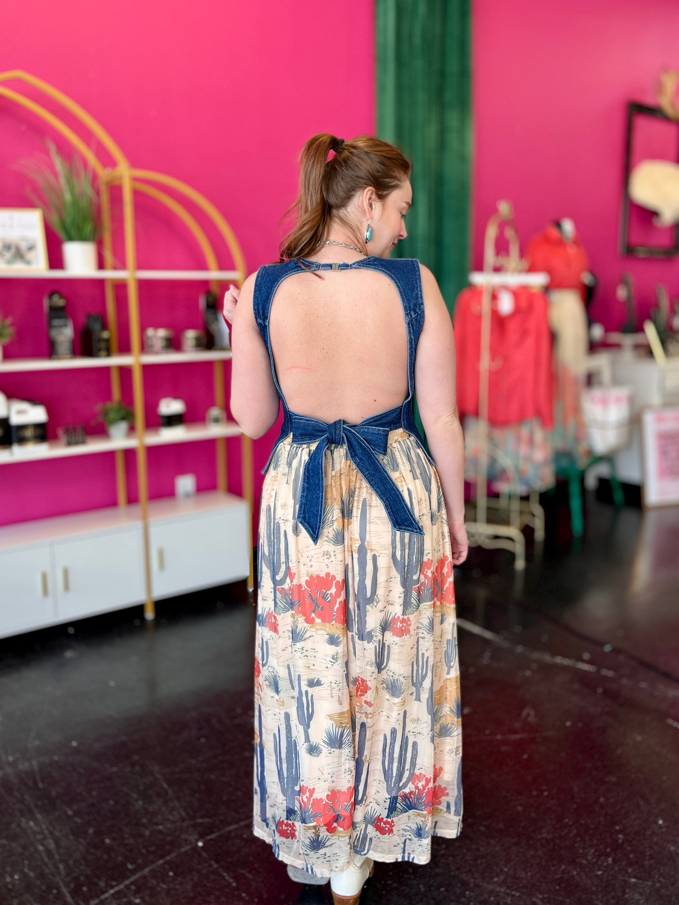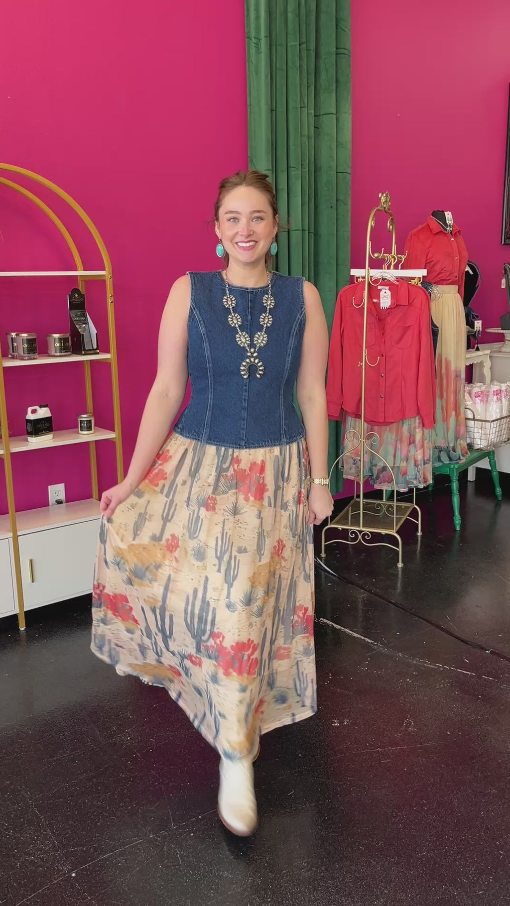 This denim and red cactus mesh maxi skirt is giving elevated western vibes! The adorable cactus print paired with the classic denim-and-red combo creates that perfect balance of fun and sophisticated. Flowy mesh construction adds movement and dimension, making it ideal for anyone looking to level up their western-inspired wardrobe with a piece that's both statement-making and wearable.