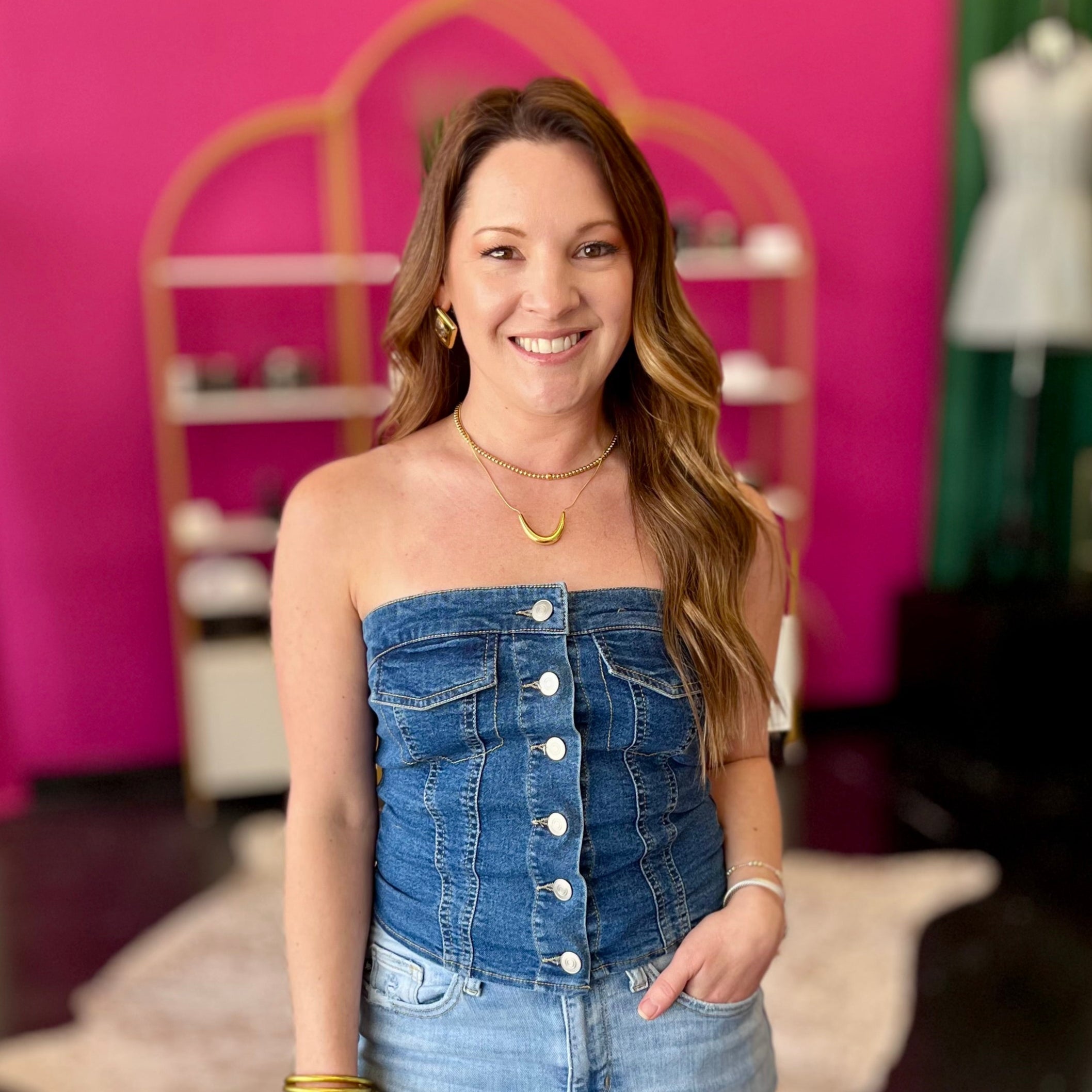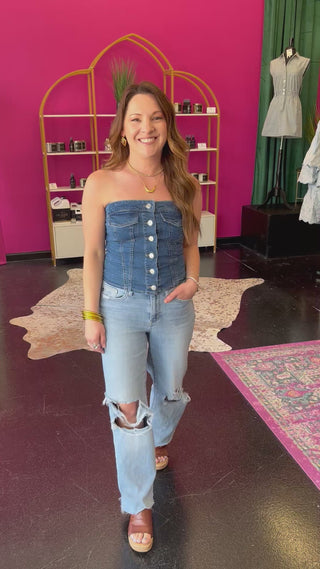 This adorable denim stretch strapless top features a chic button-down design, making it the perfect pick for concert nights or girls' night out. Its snug fit and playful style ensure you stand out while staying comfortable and confident all evening long.
