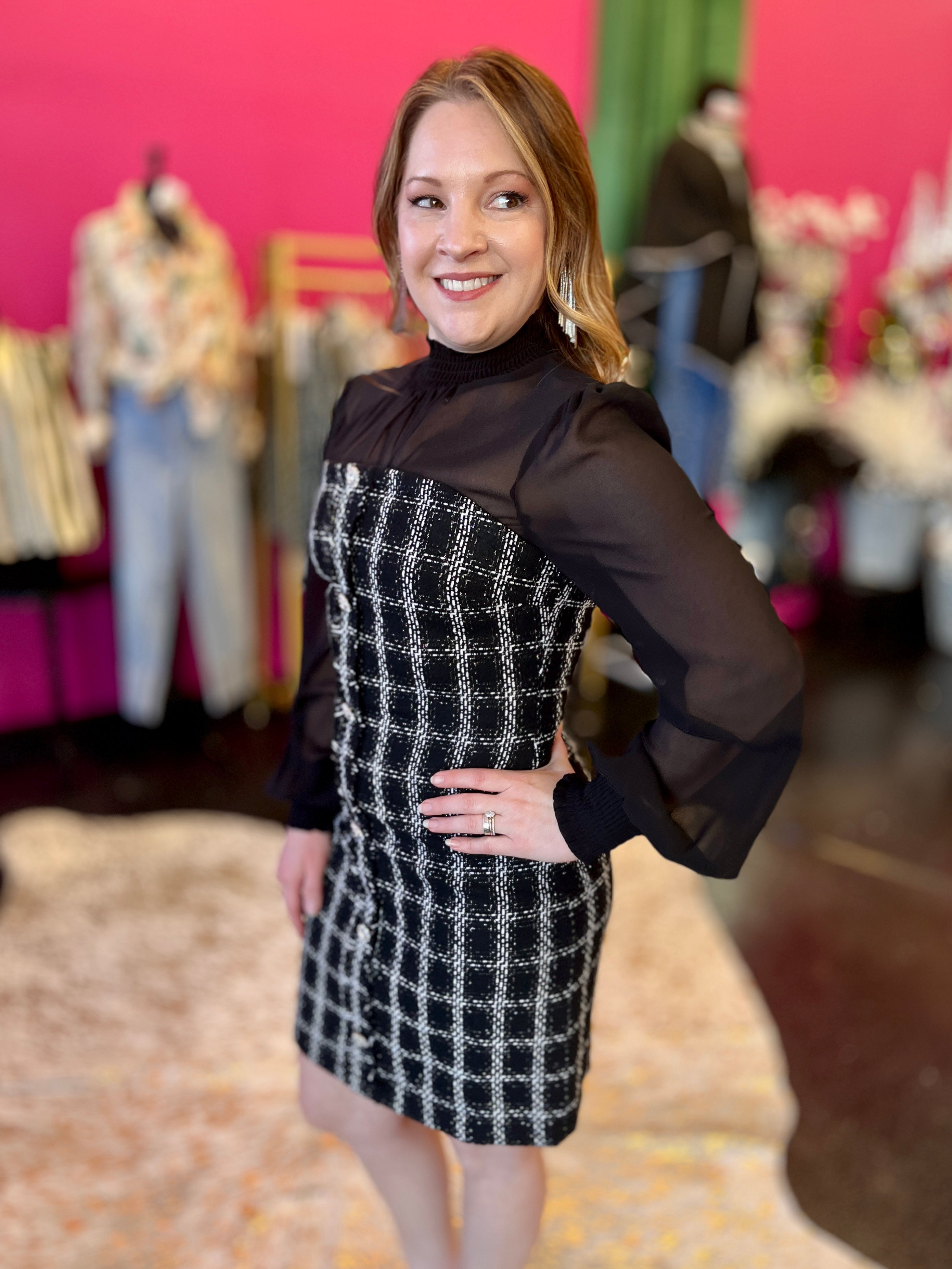 This Black Tweed Shear Dress is your go-to showstopper for holiday parties and wild Vegas nights. Its chic tweed fabric paired with a daring sheer neckline adds just the right amount of sass to your look. Get ready to turn heads and steal the spotlight wherever you go!