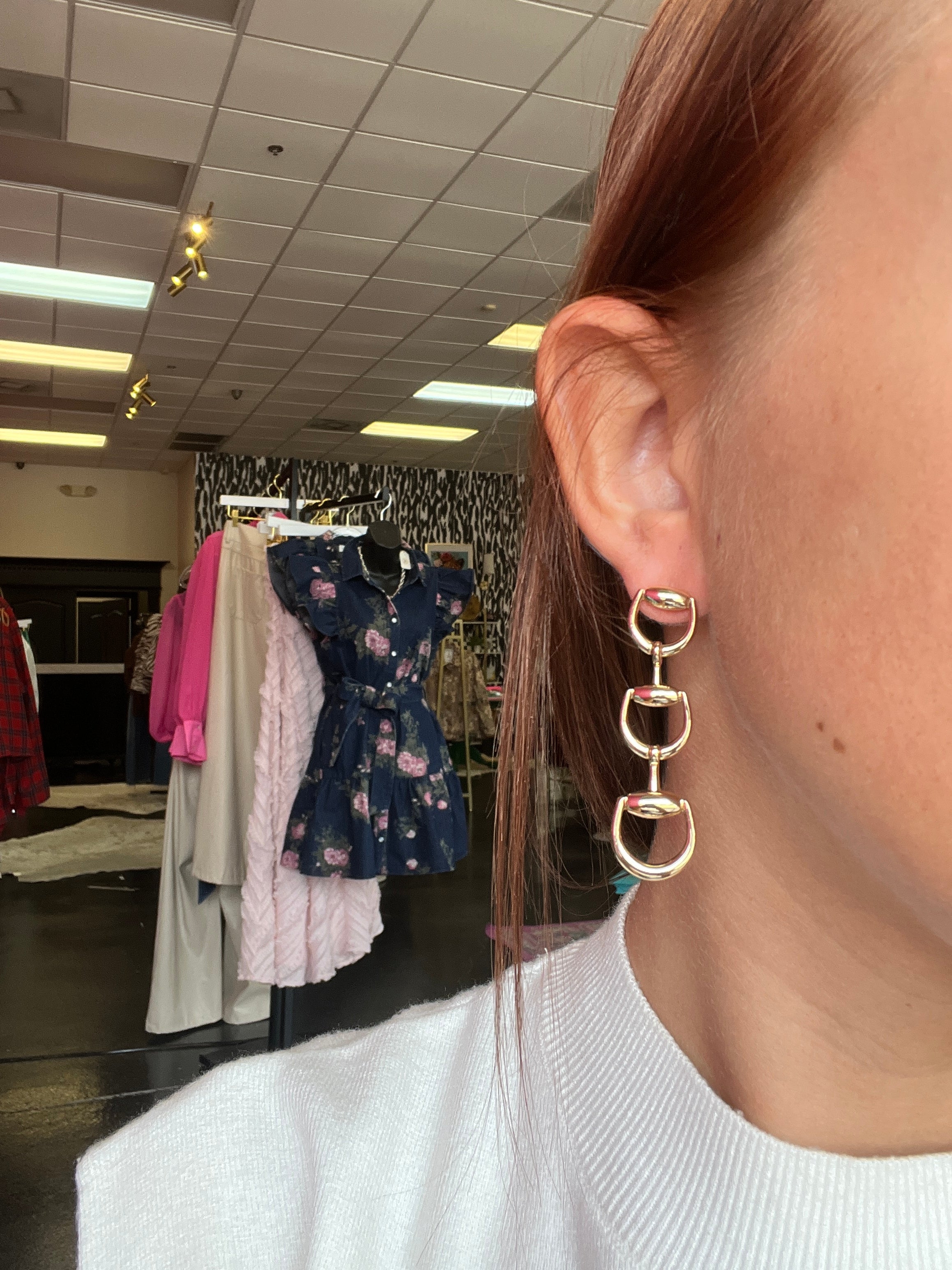 Saddle up in style with these charming Gold 3 Horsebit Dangle Earrings—your new equestrian essential. Inspired by timeless Ralph Lauren sophistication, these beauties feature the iconic horsebit detail that whispers preppy elegance. Perfect for adding a touch of refined charm to any outfit, whether you're heading to the stable or the country club. Lightweight and versatile, they're the accessory that says you've got impeccable taste and a love for all things classic.