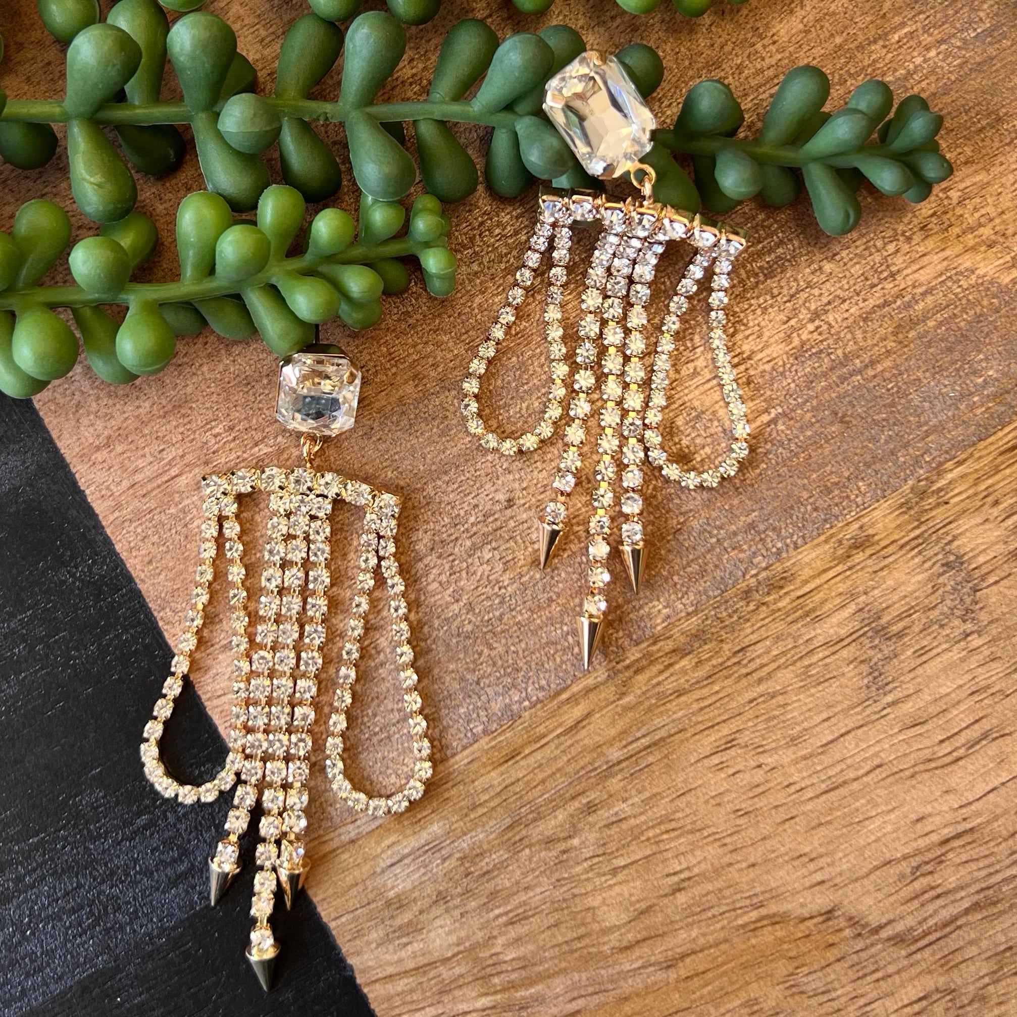 Add a touch of sparkle to any outfit with our Gold Crystal Scale Earring. Featuring a medium crystal rectangle topper, these post earrings are both elegant and versatile. Perfect for any occasion, these earrings will add a hint of glamour to your wardrobe.
