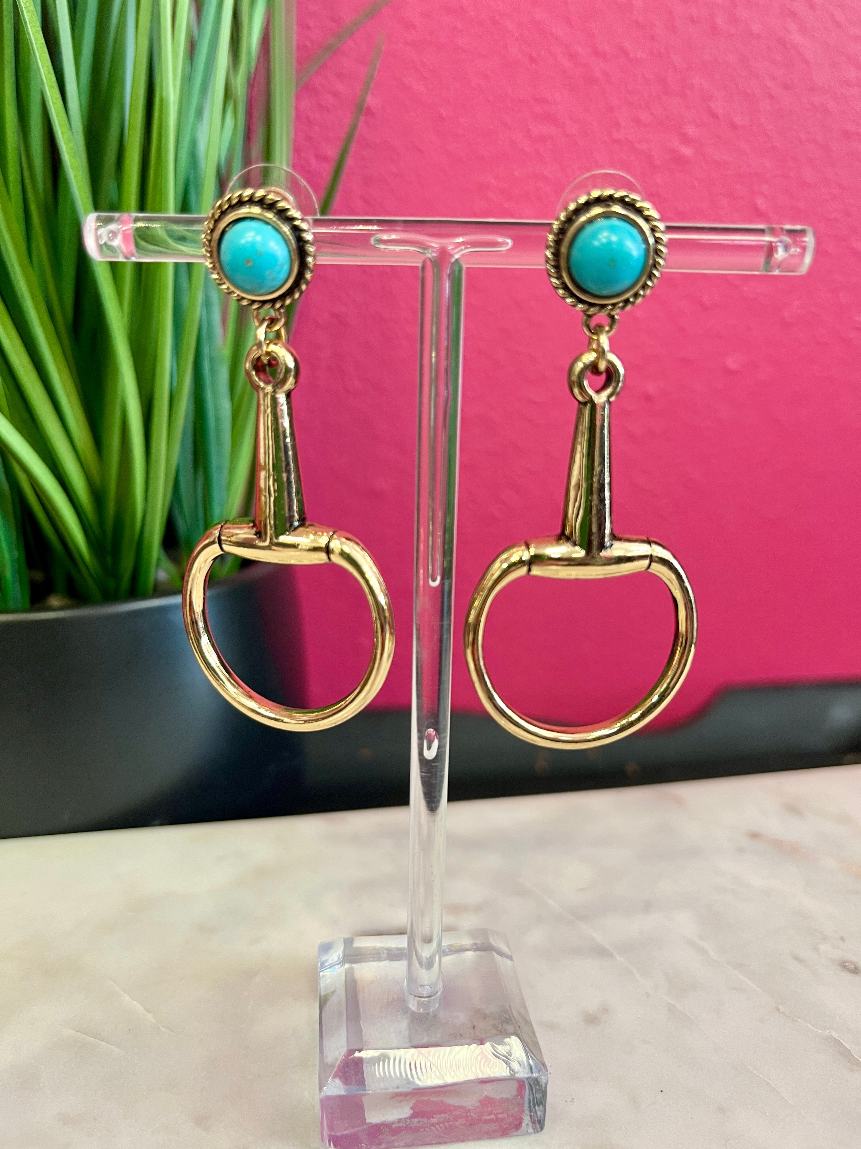 Saddle up in style with these stunning gold horsebit earrings, featuring a pop of turquoise that's absolutely irresistible. Perfect for channeling your inner equestrian queen, these beauties capture that Western charm with a modern twist. Mix and match with our complete horsebit jewelry collection to create your signature look—because one piece is never enough when you're serving cowgirl chic. The turquoise accent adds just the right amount of personality to elevate any outfit, from casual ranch days to nights out on the town.