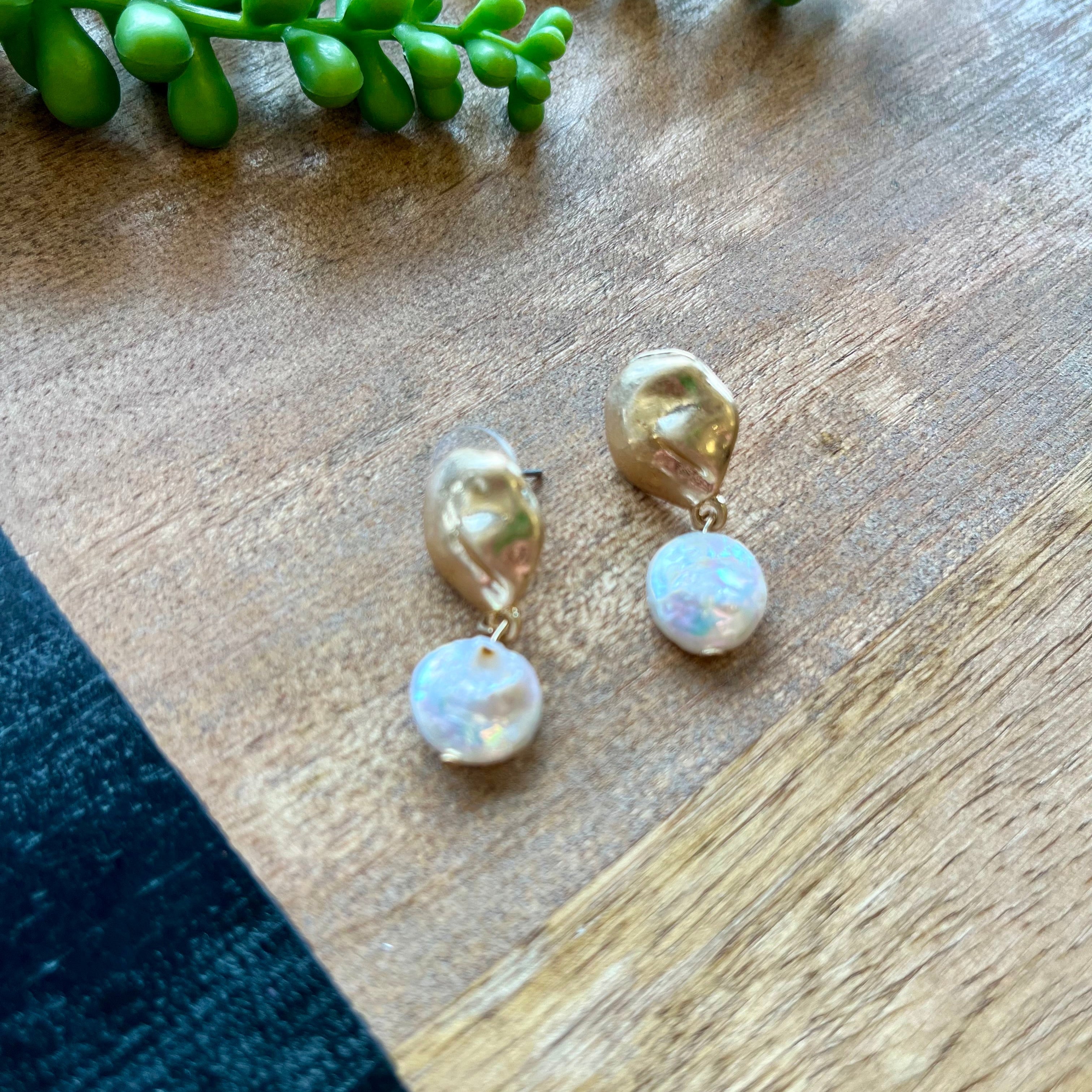 Add a touch of charm with these Gold & Mother of Pearl Stone Dangle Earrings. Featuring a sleek gold top and a shimmering mother of pearl drop, they’re simple yet stylish—perfect for effortlessly elevating any outfit with a playful sparkle.