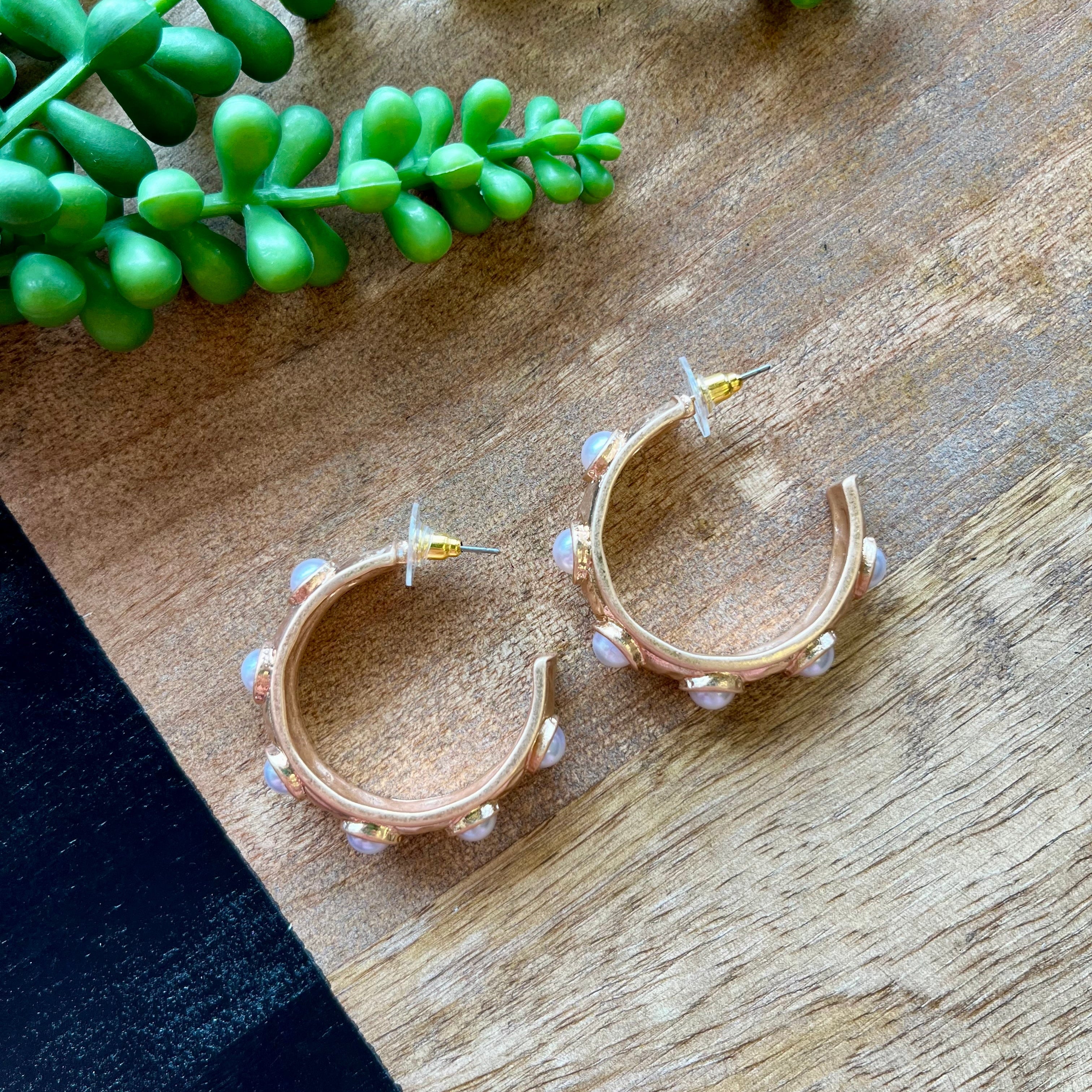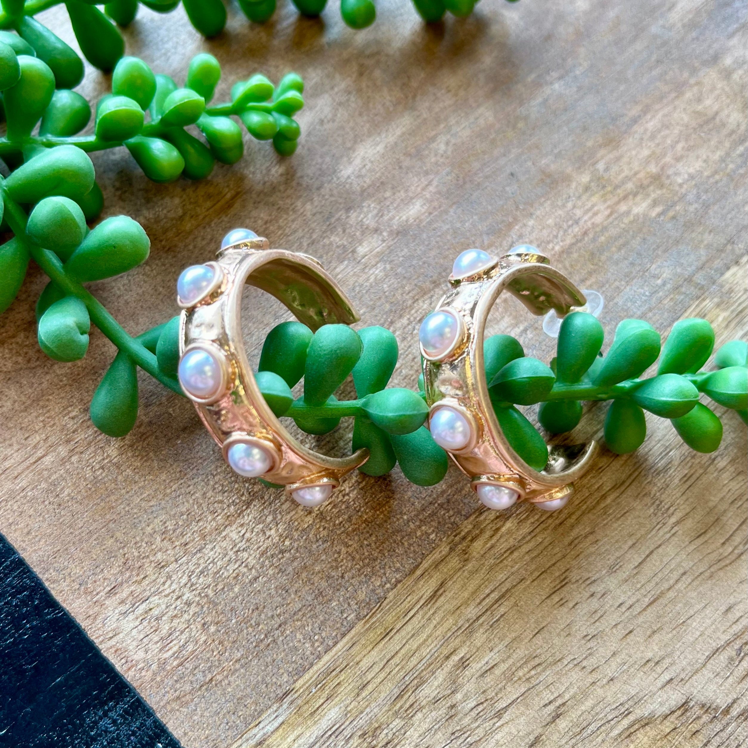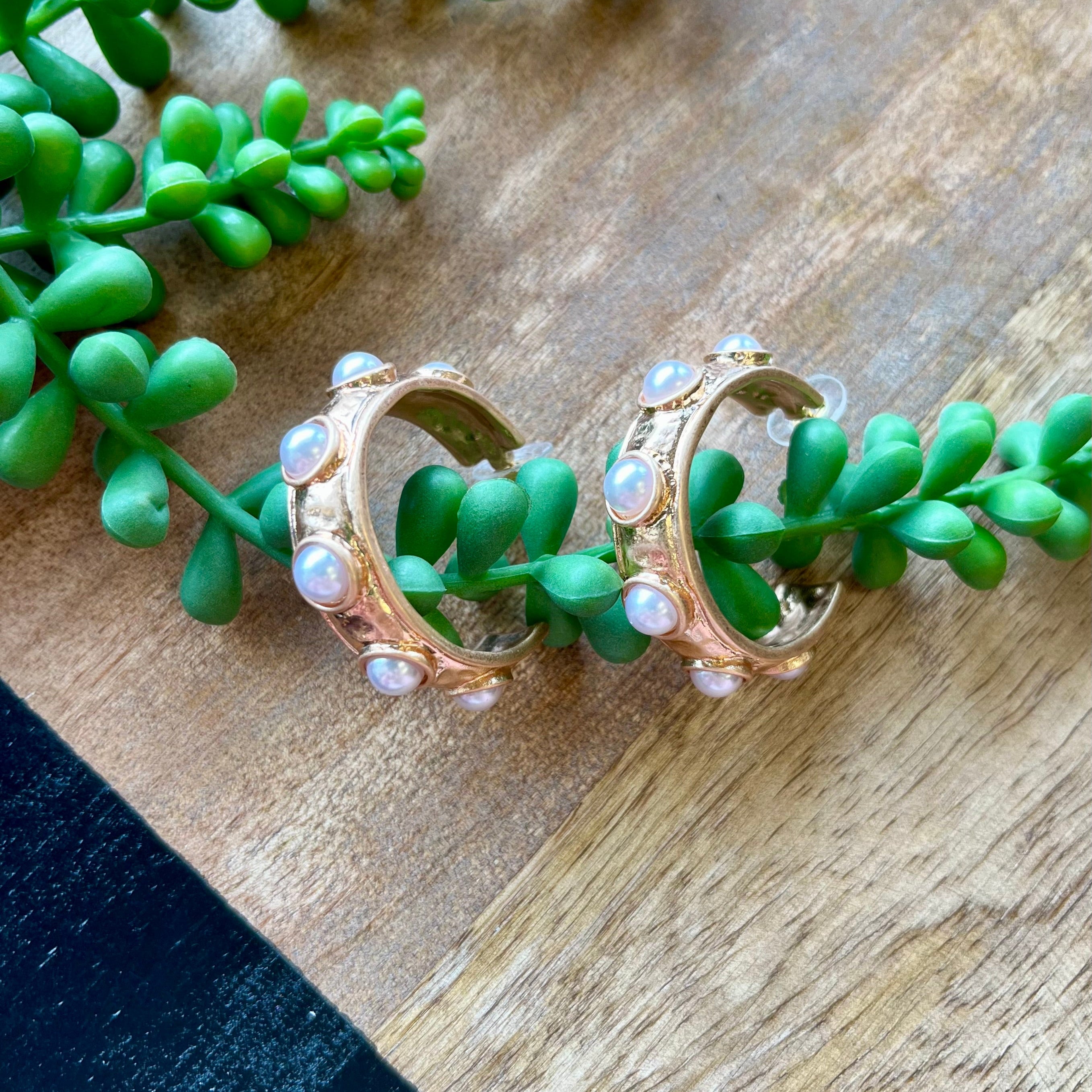Add a touch of sparkle to every outfit with these Gold & Pearl Stone Hoops. Perfect for any season, their chic design blends timeless pearls with shiny gold for an effortlessly cute look you'll want to wear all year long. Whether dressing up or down, these hoops