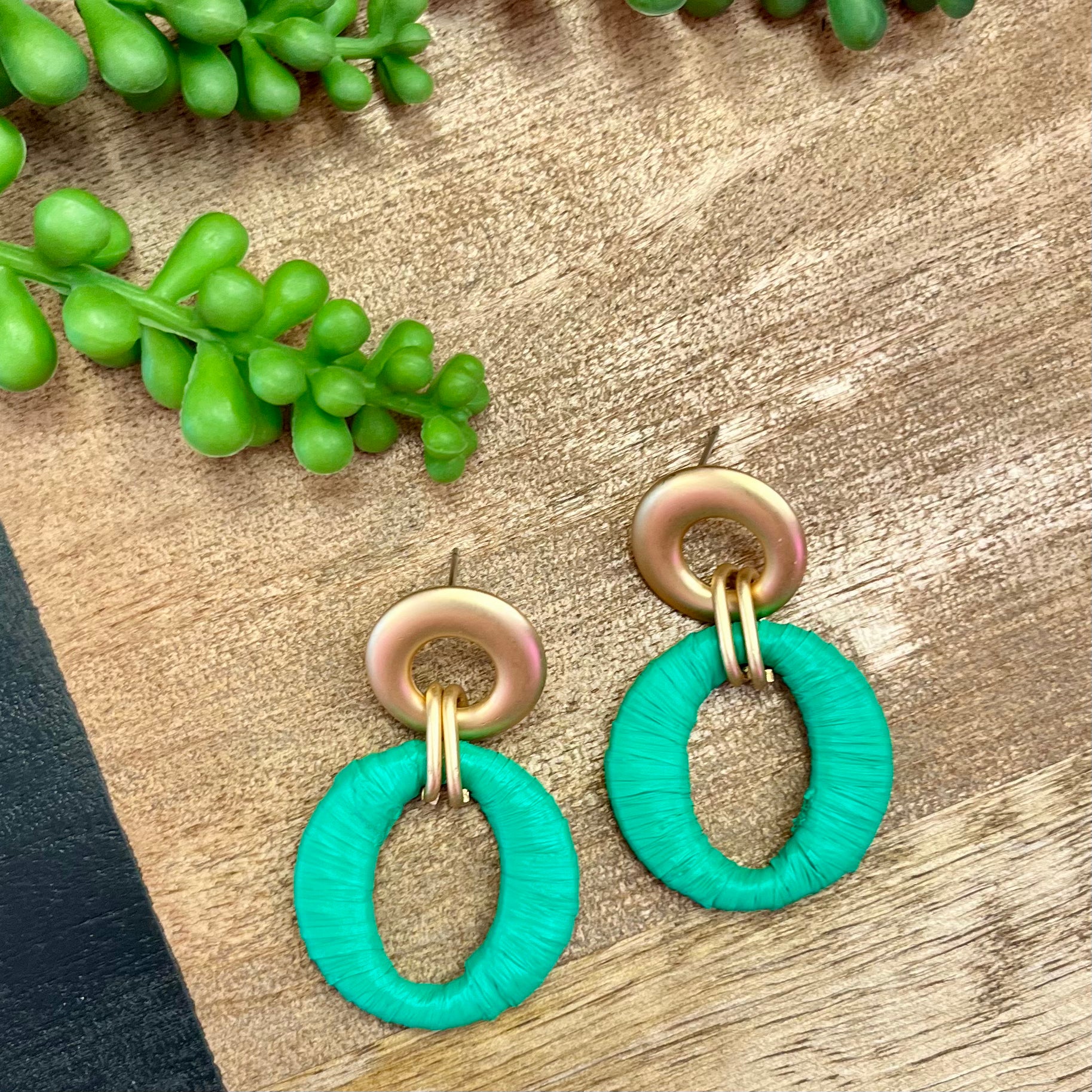 Get ready for spring and summer with our Green Raffia Wrapped Circle Earrings! These lightweight earrings are the perfect addition to your warm weather wardrobe. The gold topper adds a touch of elegance while the raffia wrapping adds a fun, playful touch. (No more boring earrings!)