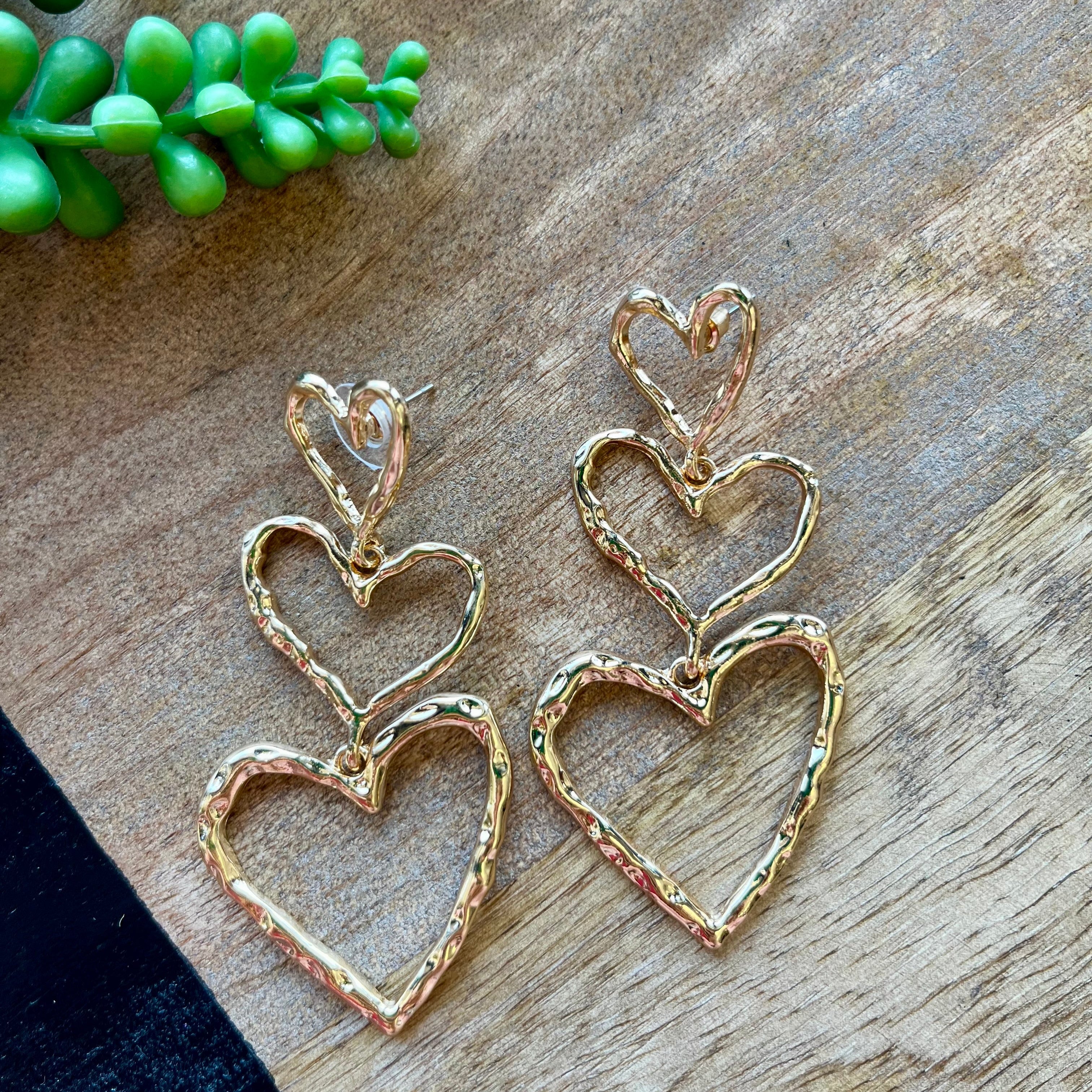 Add a touch of charm with these Hammered Gold 3 Heart Earrings. Their playful tiered design lets the hearts cascade beautifully, making every movement sparkle with love. Perfect for expressing your fun, flirty side while adding a unique twist to your everyday look.
