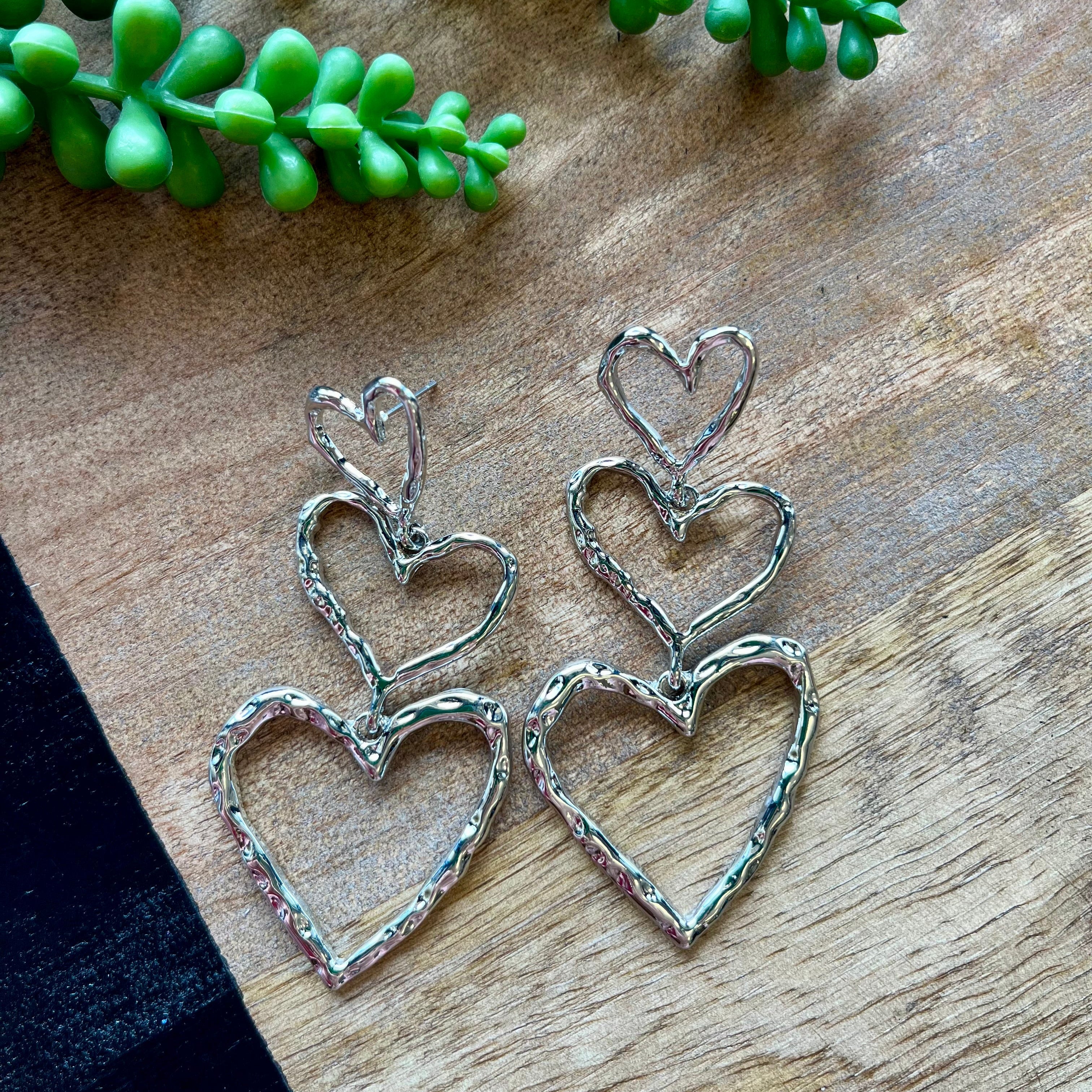 Add a touch of charm with these Hammered Silver 3 Heart Earrings. Their playful tiered design lets the hearts cascade beautifully, making every movement sparkle with love. Perfect for expressing your fun, flirty side while adding a unique twist to your everyday look.
