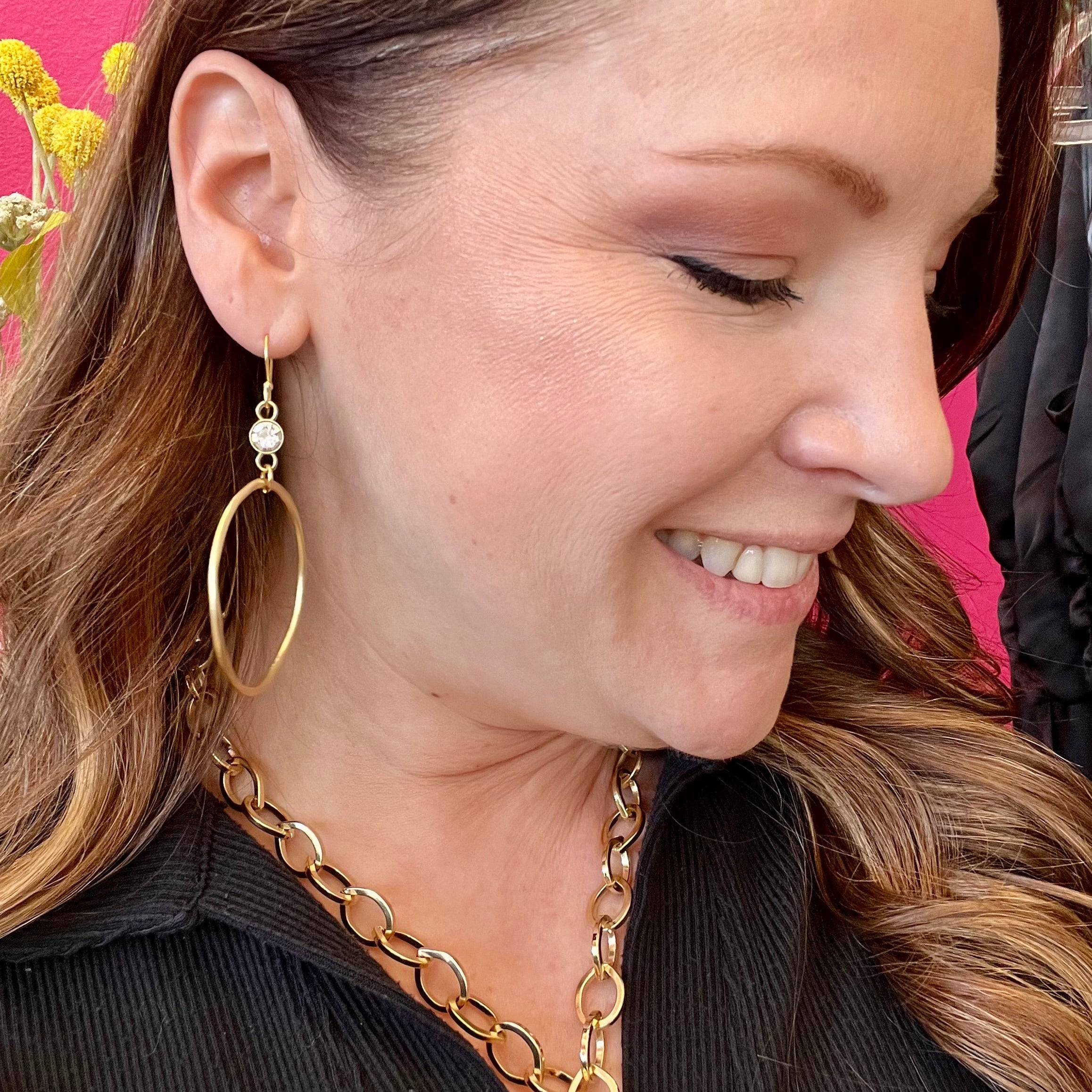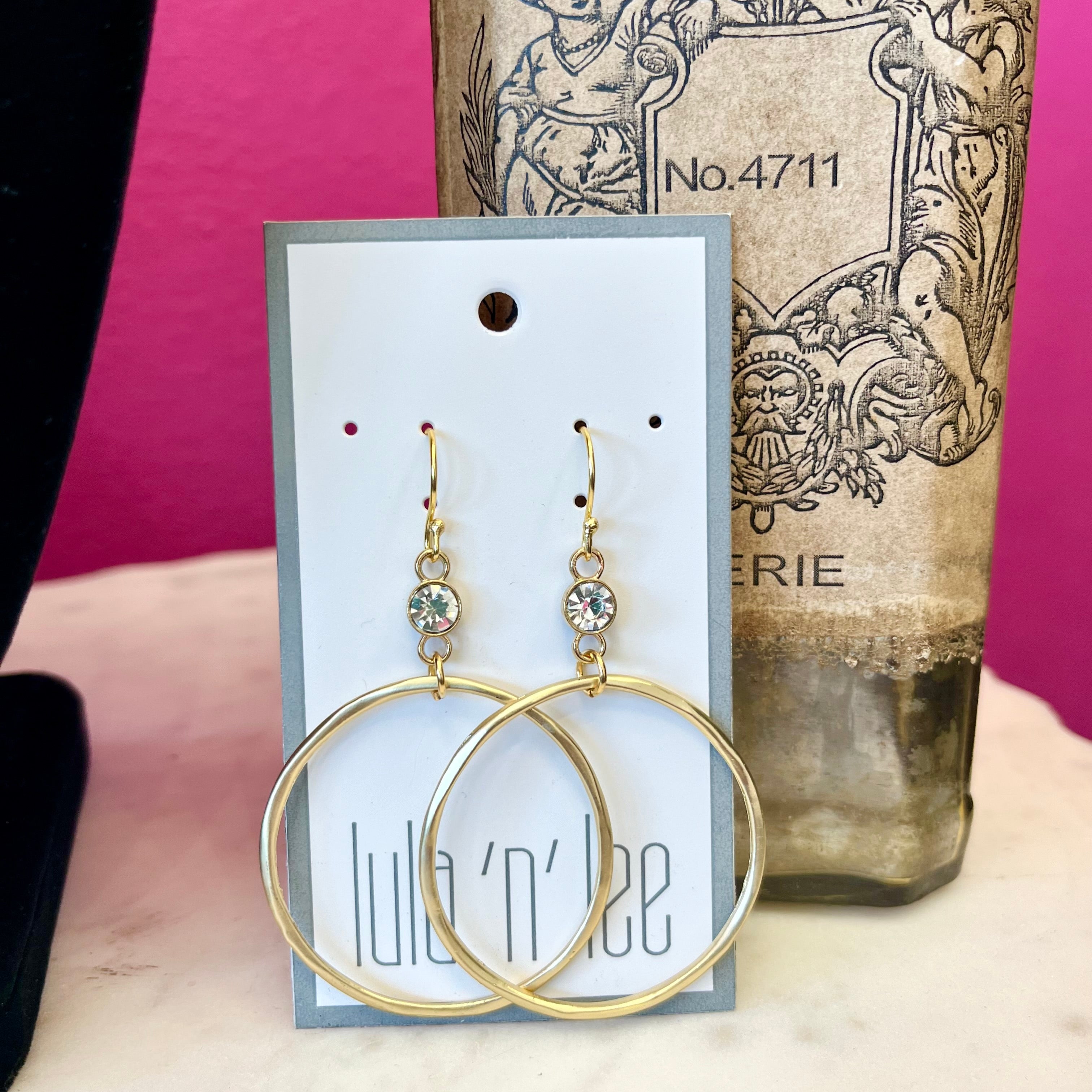 Add some sparkle to your look with Antique Gold Crystal Circle Earrings. These beautiful earrings are a stunning addition to any outfit and are part of the Luln 'n' Lee Collection.