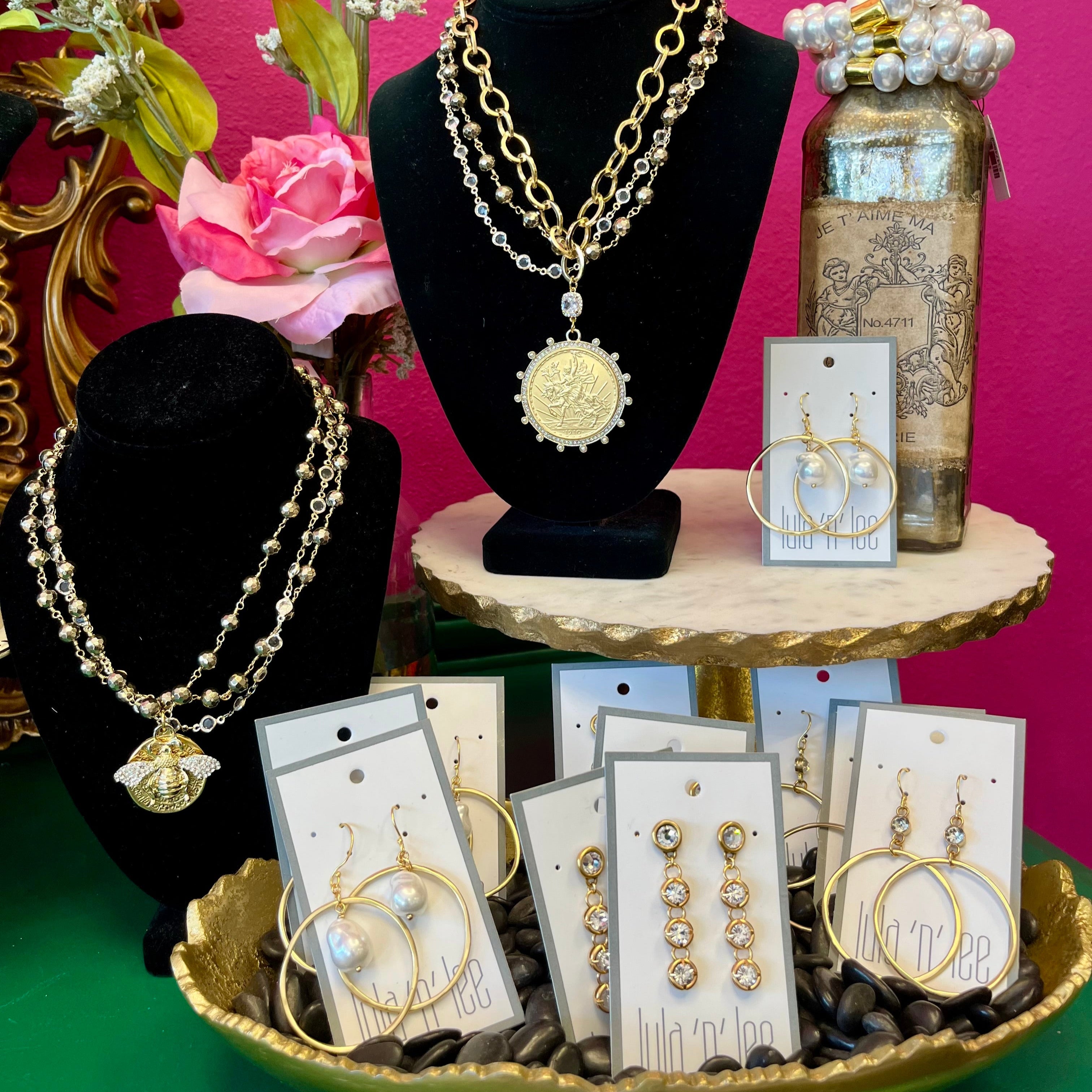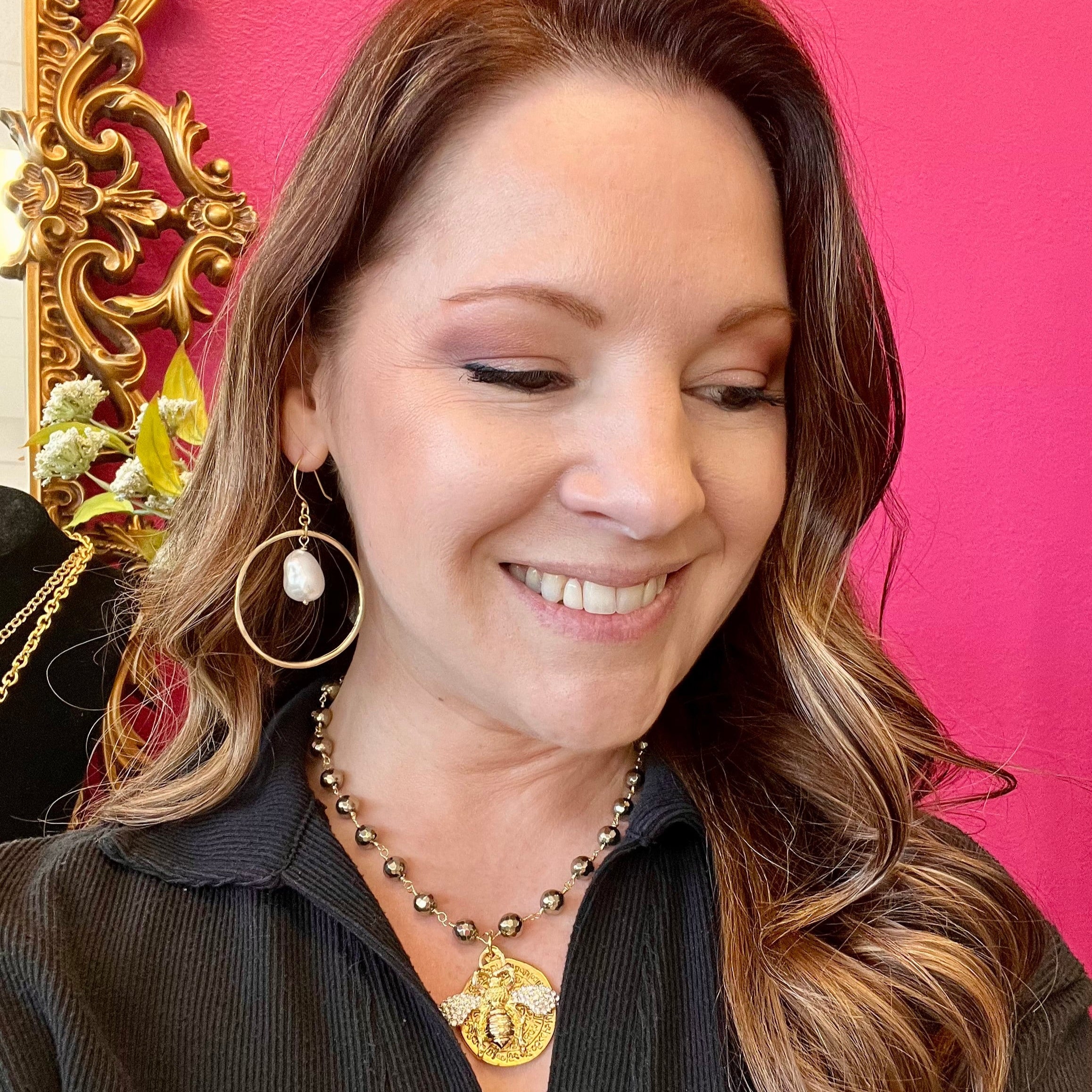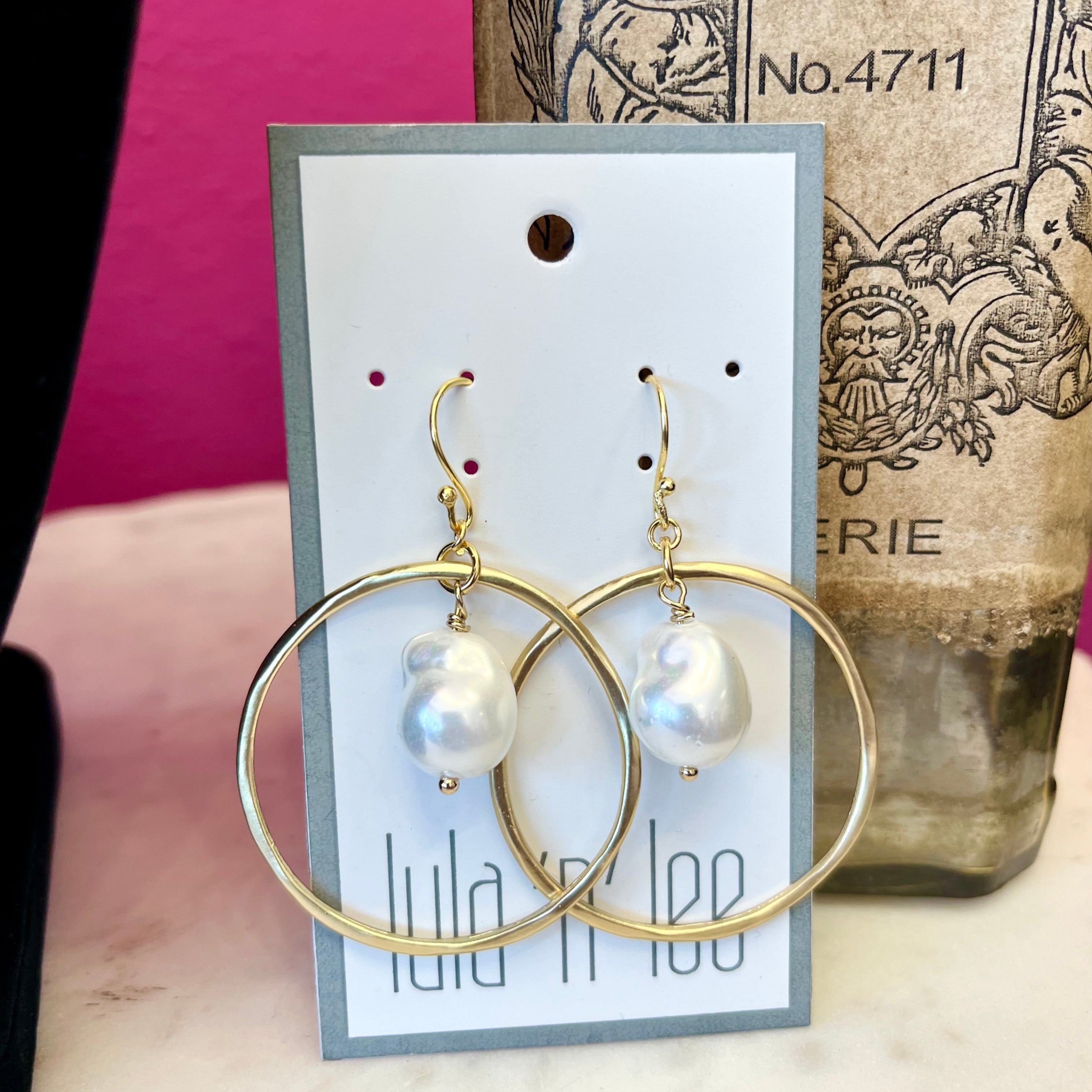 Add some elegance and whimsy to your jewelry collection with our LNL Mother of Pearl Gold Circle Earring. Featuring a dainty circle shape and a charming mother of pearl dangle center, these earrings are perfect for adding a playful touch to any outfit. Show some love to your ears with these unique and stylish earrings. Part of Lula'n' Lee Collection