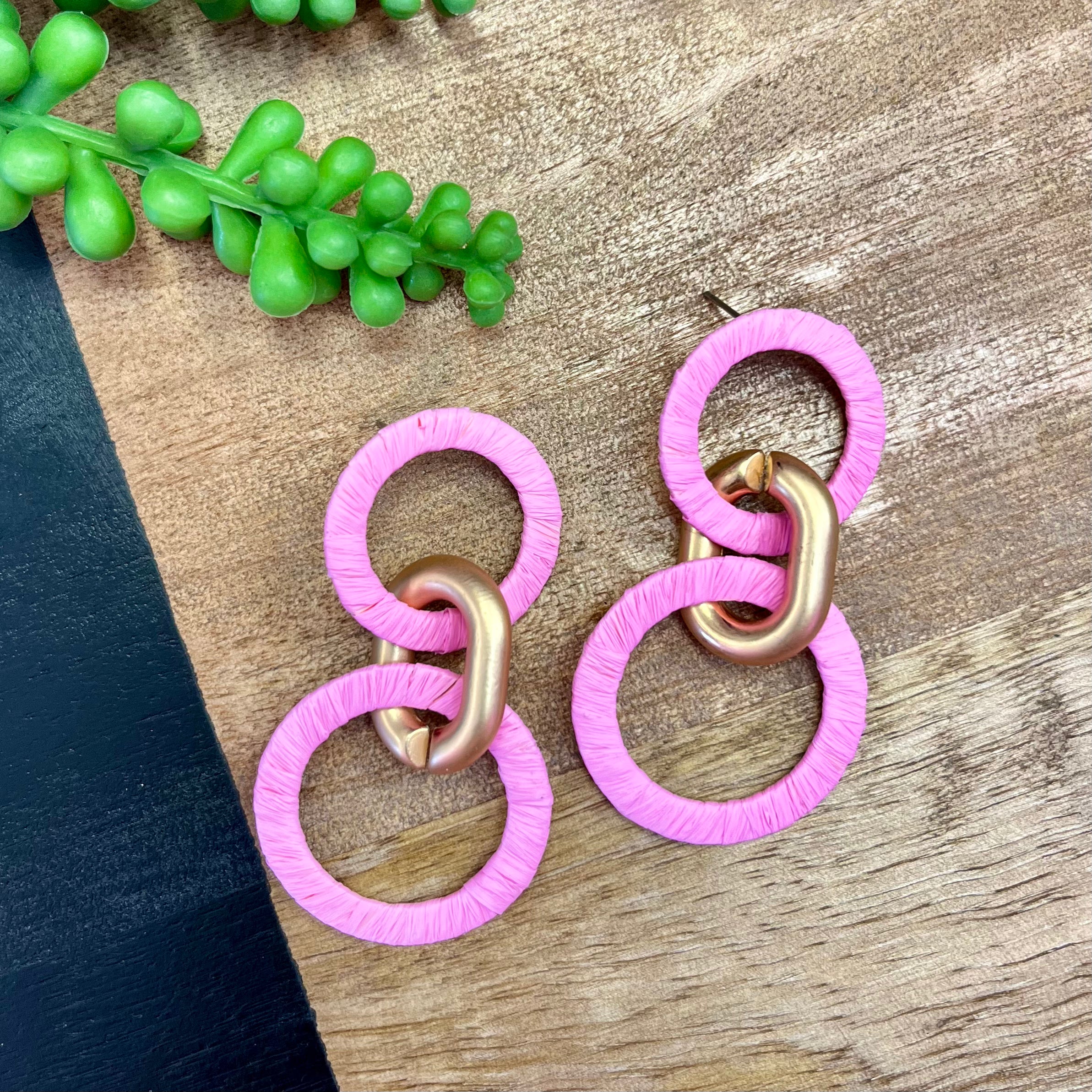 Add a pop of color to your jewelry collection with these playful Pink Raffia & Gold Circle Earrings. The lightweight design makes them comfortable to wear all day, while the fun color brings a touch of whimsy to any outfit.