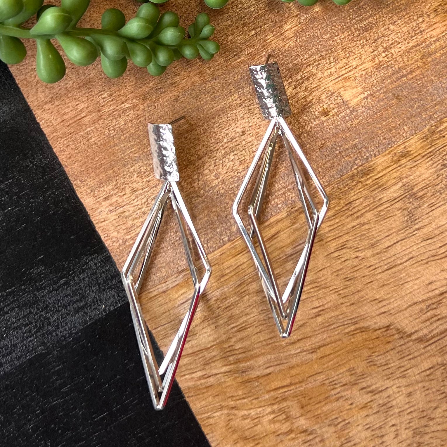Add some sparkle to your life with these Silver 2 Diamond Lg Earrings. Featuring a hammered silver long rectangle topper, these earrings are both stylish and unique. The two silver diamonds add a touch of elegance, making them the perfect accessory for any outfit.