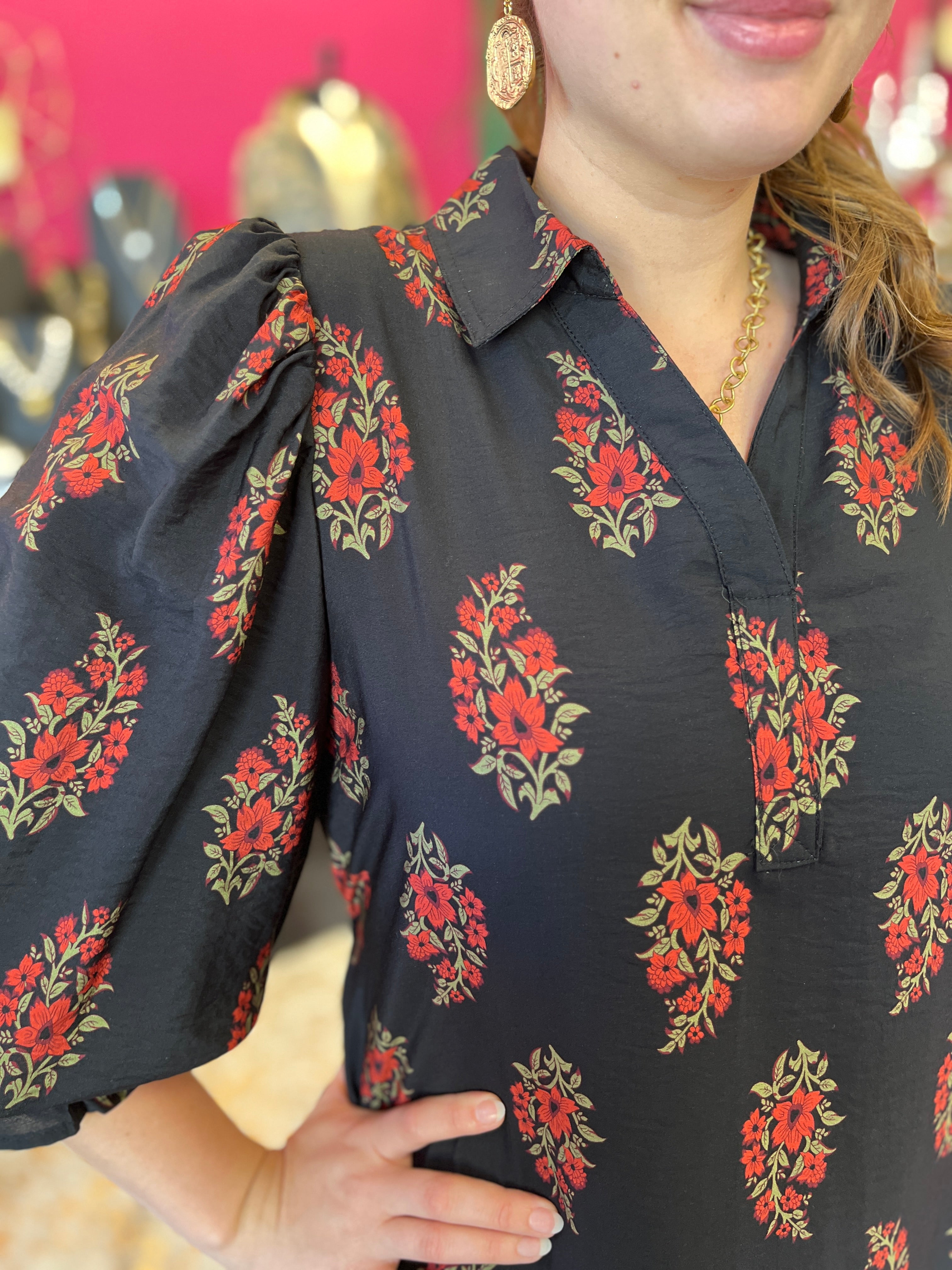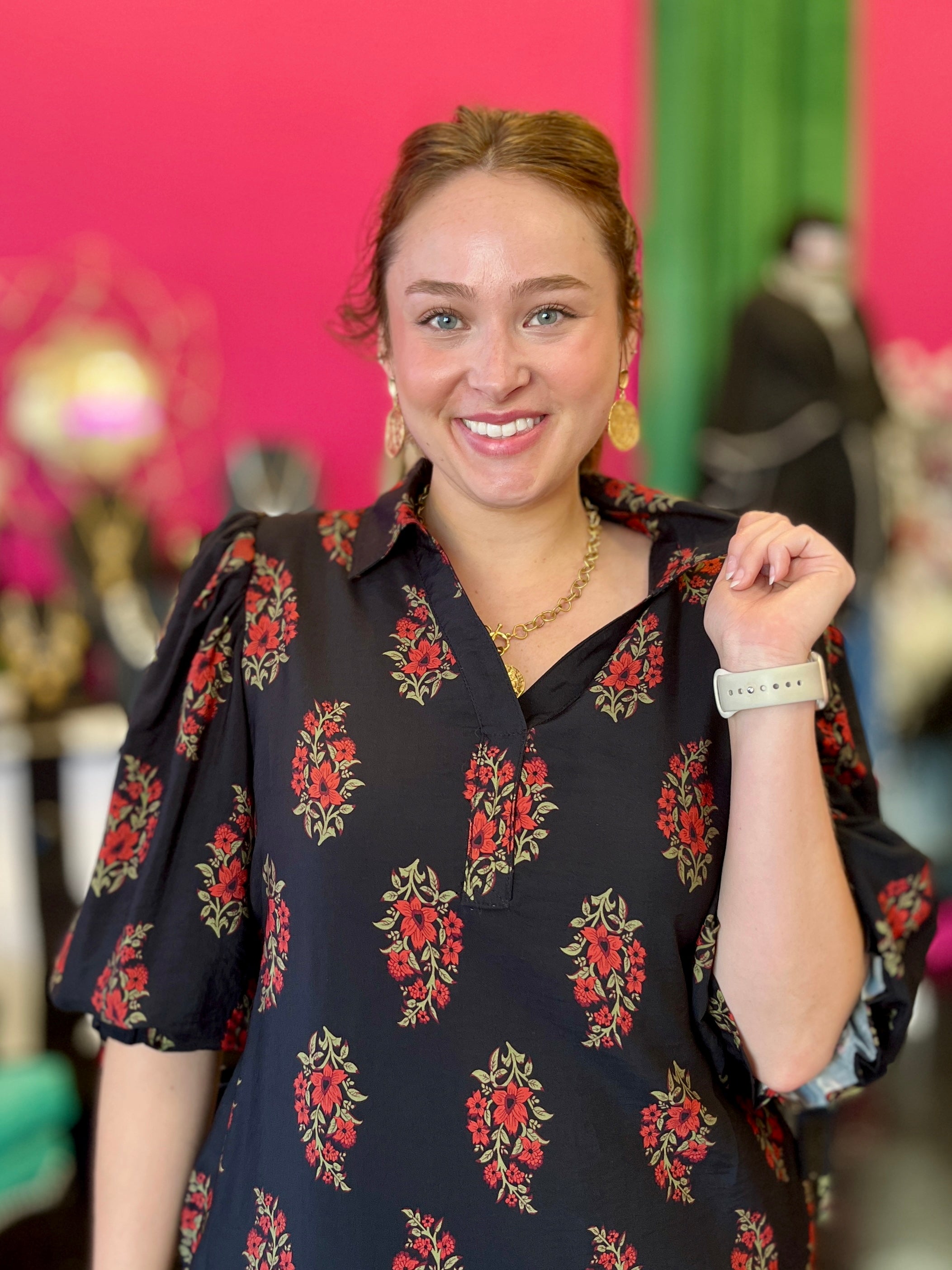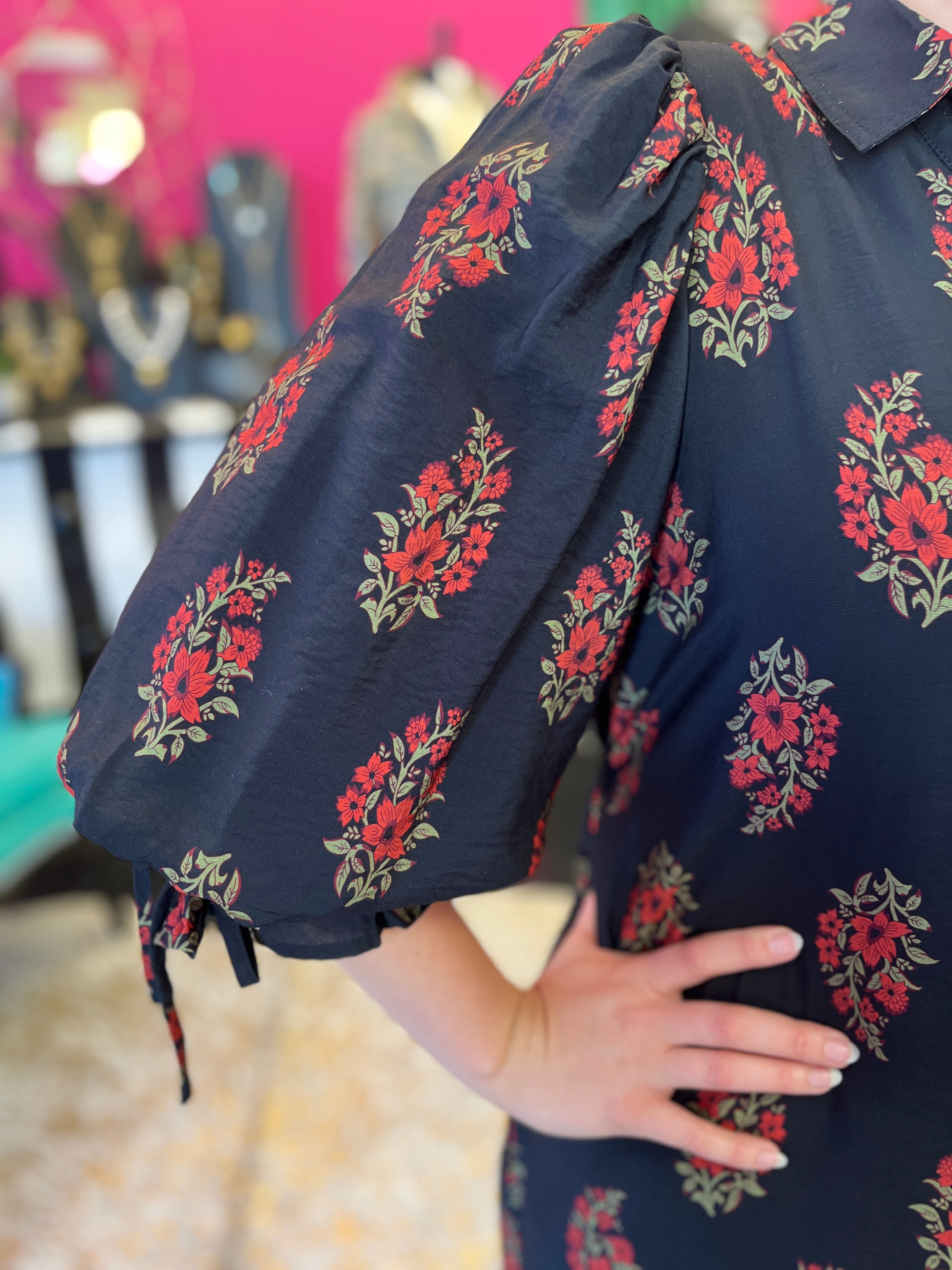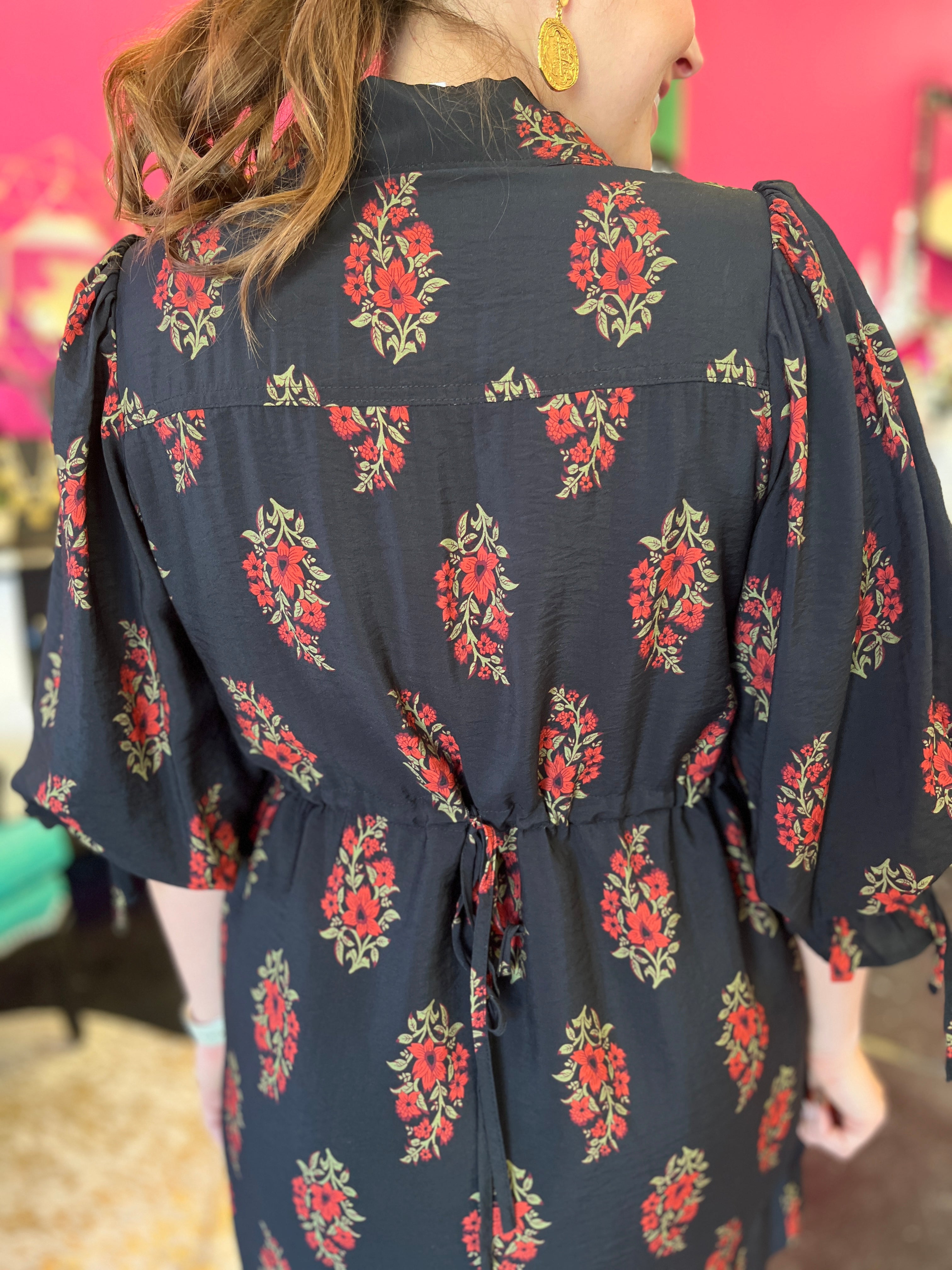 This adorable fall dress combines a striking black and red floral print with a functional drawstring back that cinches your waist for a flattering silhouette. Style it with red cowboy boots for a bold, country-chic vibe or pair with tall black boots for an effortlessly cool look. Perfect for transitioning your wardrobe into the season with personality and flair.