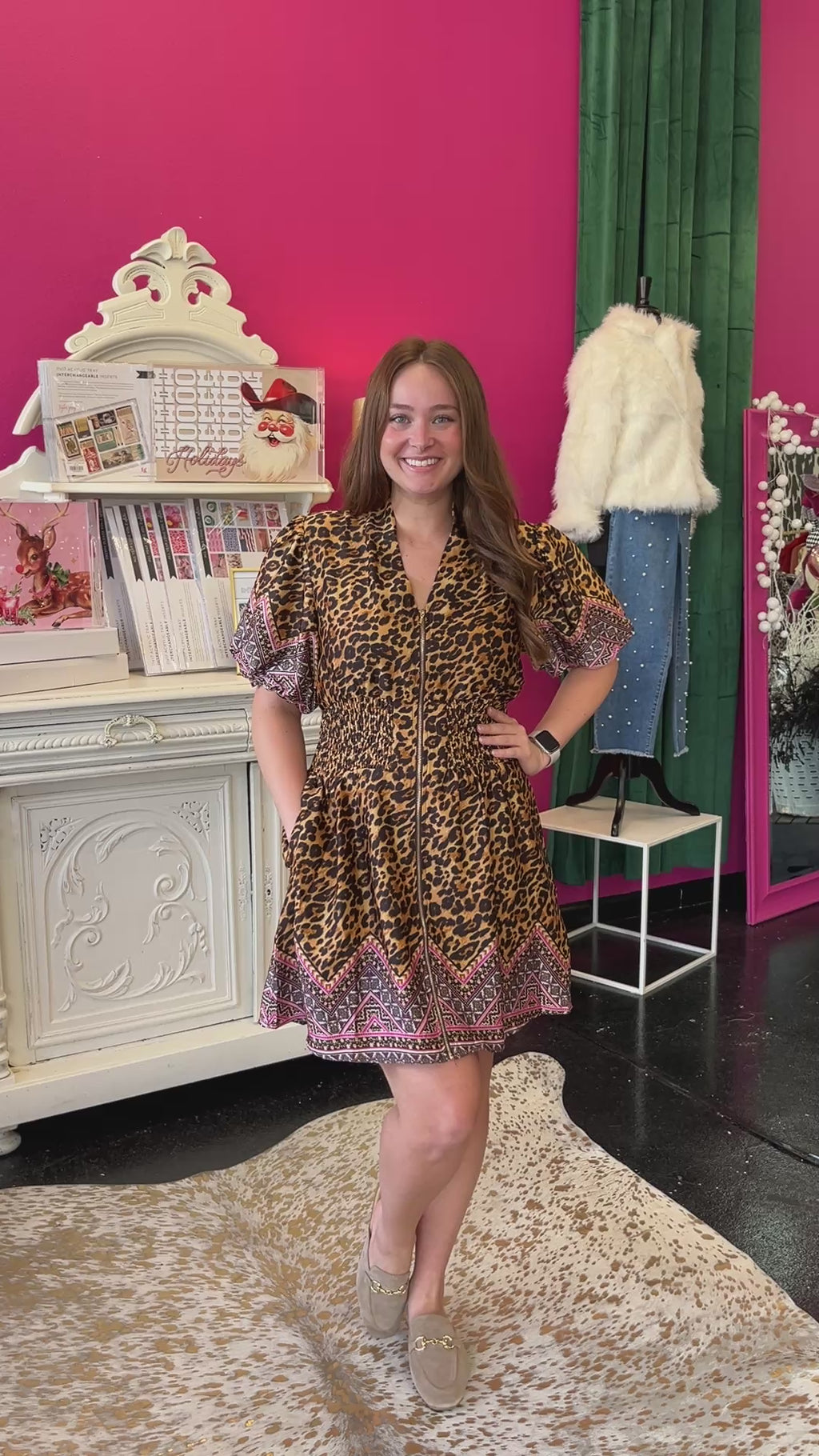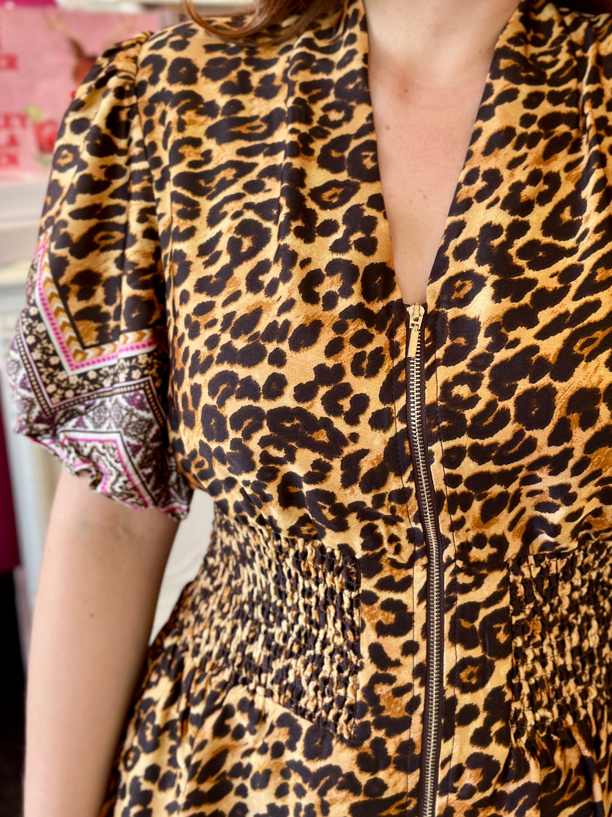 Roar into style with this fabulous leopard print dress that's equal parts fierce and fun! The adorable tile border frames the design beautifully, while the cute zipper detail cinches your waist for a flattering silhouette. Puff sleeves add that extra touch of playfulness to keep things flirty and fresh. Perfect for anyone who loves making a bold fashion statement with a wink and a smile!