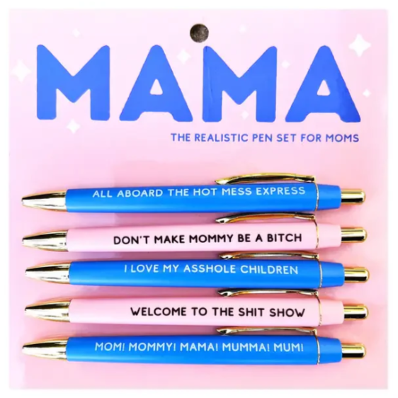 The MAMA Pen Set includes 5 black ink ballpoint pens that will keep you writing (and laughing) all day. Whether you're taking notes or doodling, these funny pens are sure to add a touch of humor to your work. Perfect for any quirky writer or office joker.