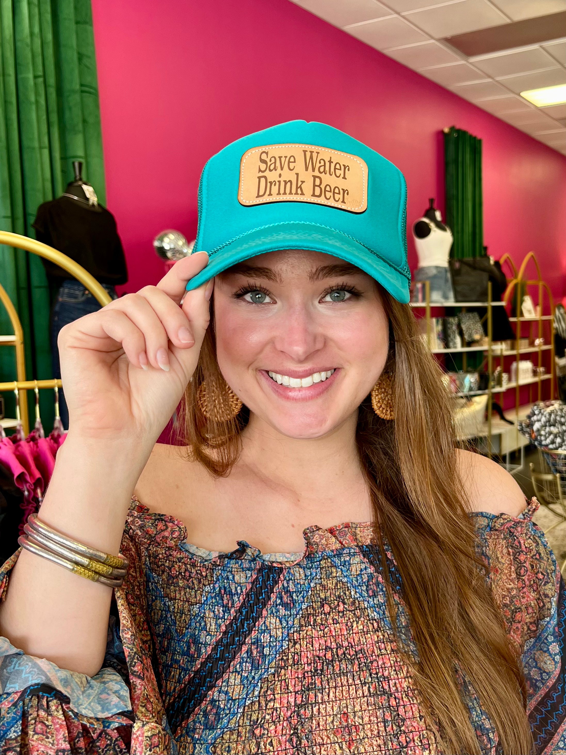 Quench your thirst and save the planet with our Save Water Drink Beer teal trucker hat! Featuring a stylish leather patch emblazoned with our motto, this hat also comes with an adjustable back for the perfect fit. Stay cool and make a statement in this quirky and fun accessory. Cheers!