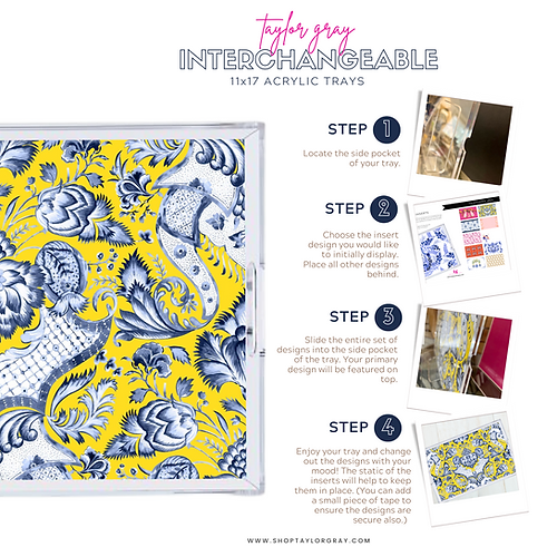 Acrylic trays are all the rage and are definitely on trend. Why should you settle for one design when you can have TEN designs and change them out on a whim? The TAYLOR GRAY acrylic tray is an extra-large 11x17 tray that perfectly fit our 11x17 insert designs. The pocket on the bottom of the tray allows the inserts to be easily interchanged and protected.