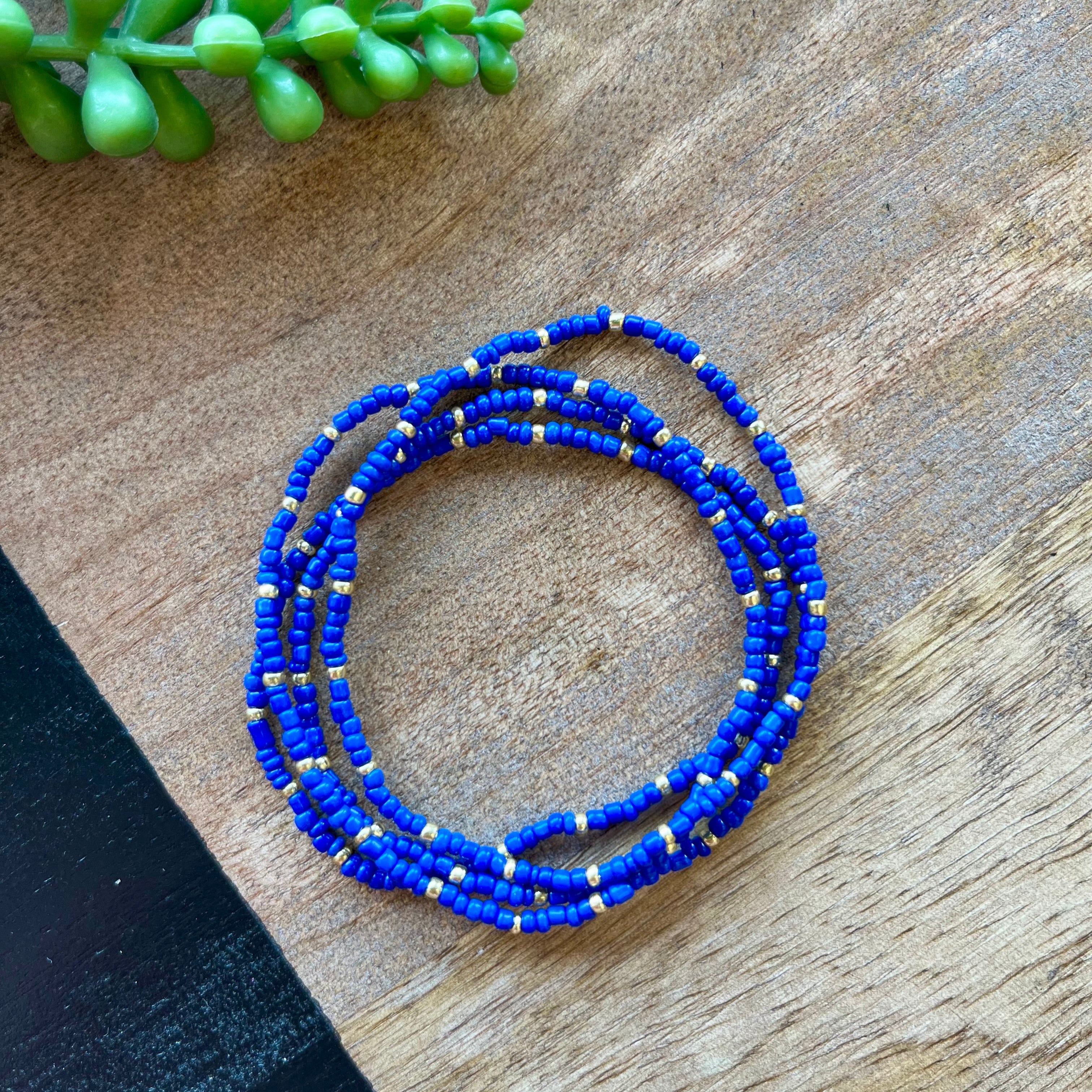 Score a fashion touchdown with this set of 4 royal blue beaded bracelets! Perfect for gamedays (and everyday), these stretchy bracelets add a pop of color and fun to any outfit. Go ahead, stack them up for a playful look. (4 bracelets included). Mix and Match with other bracelets and bracelet colors for a cute arm stack.