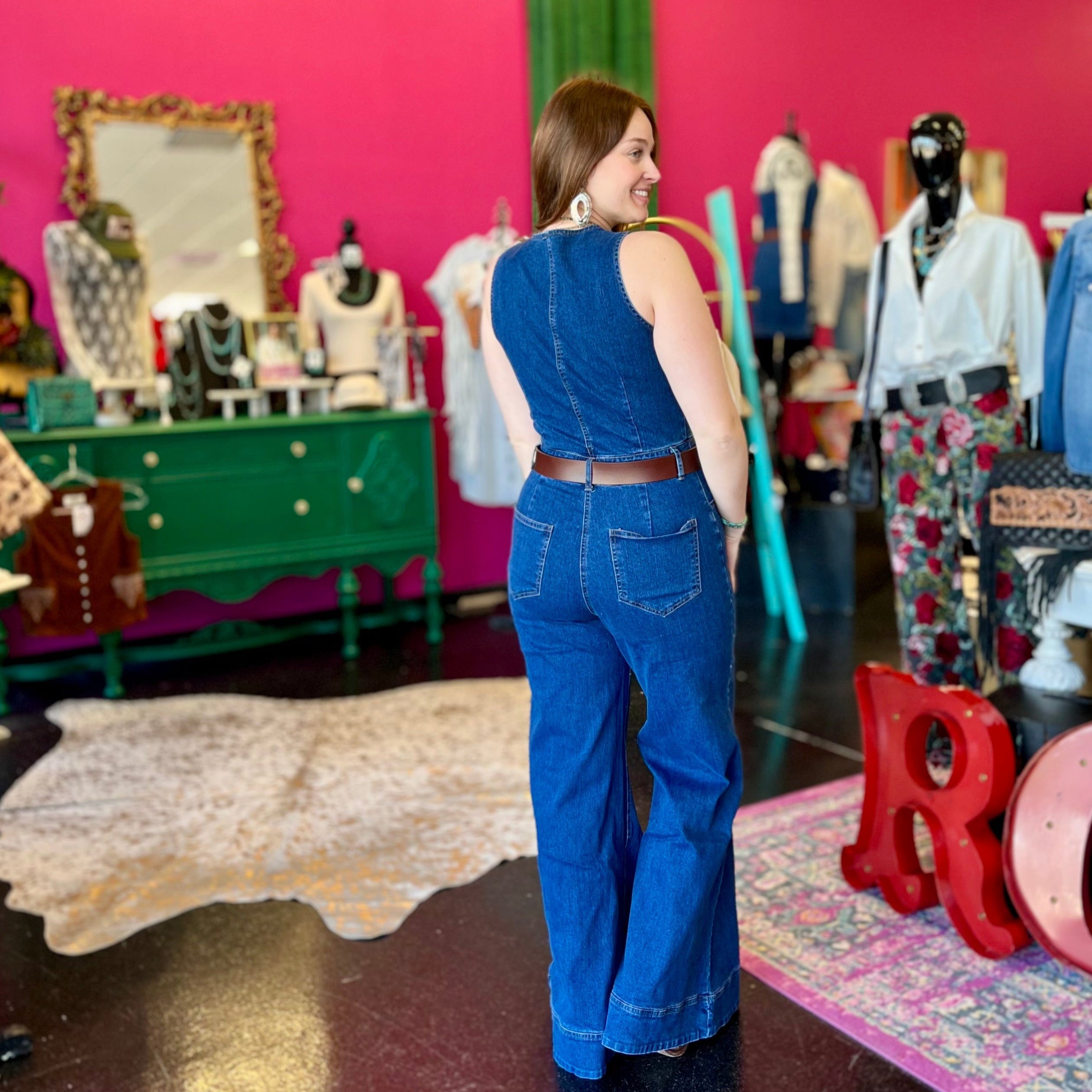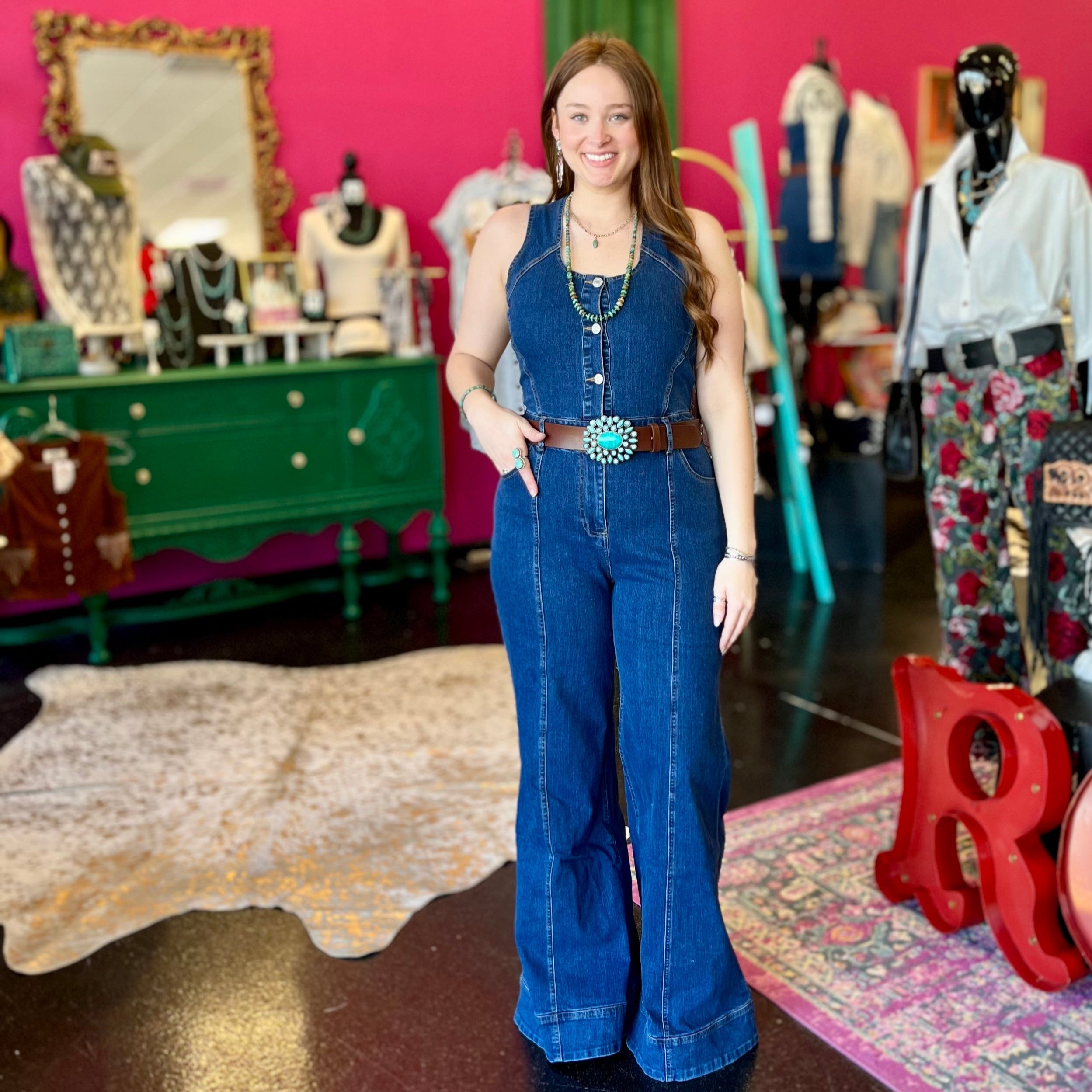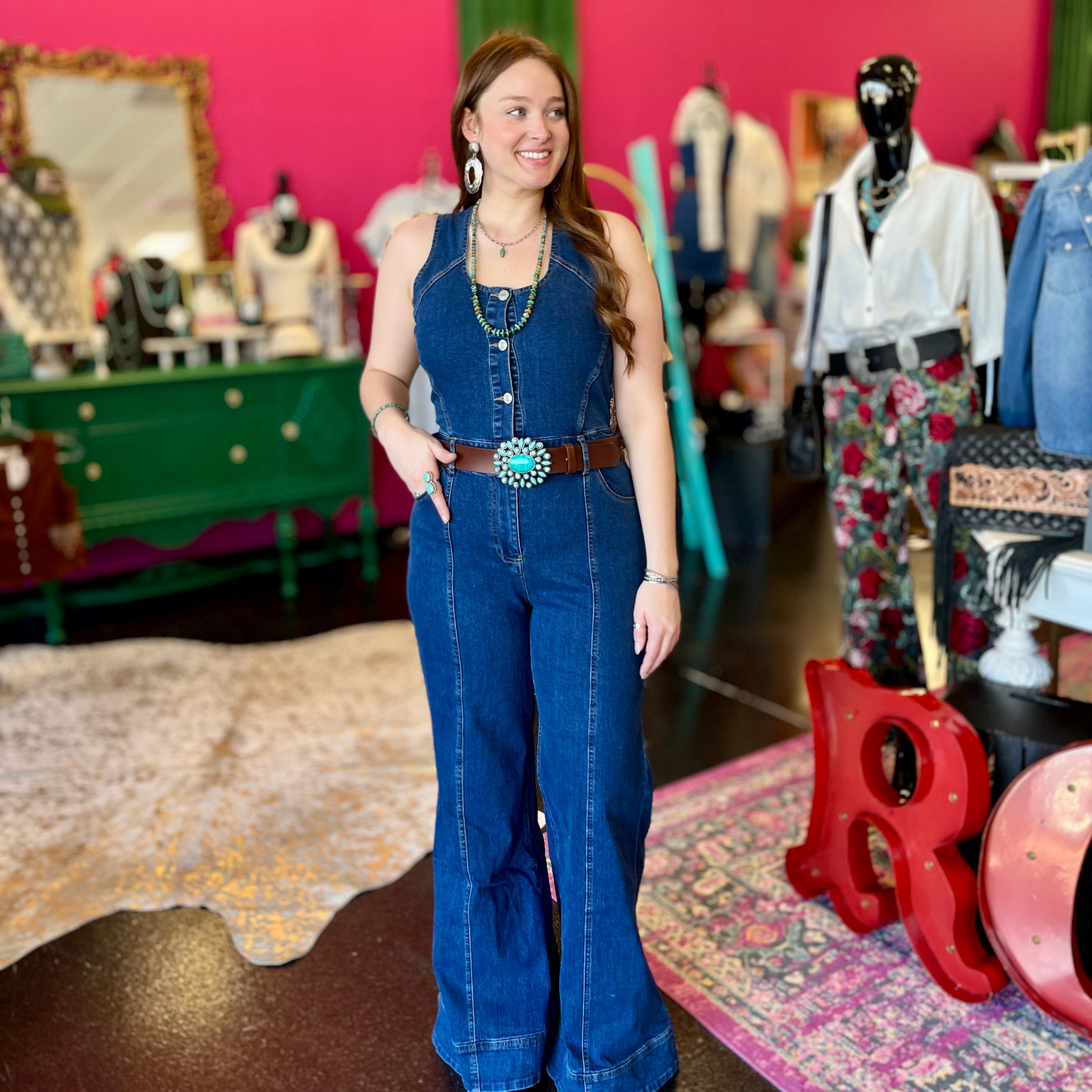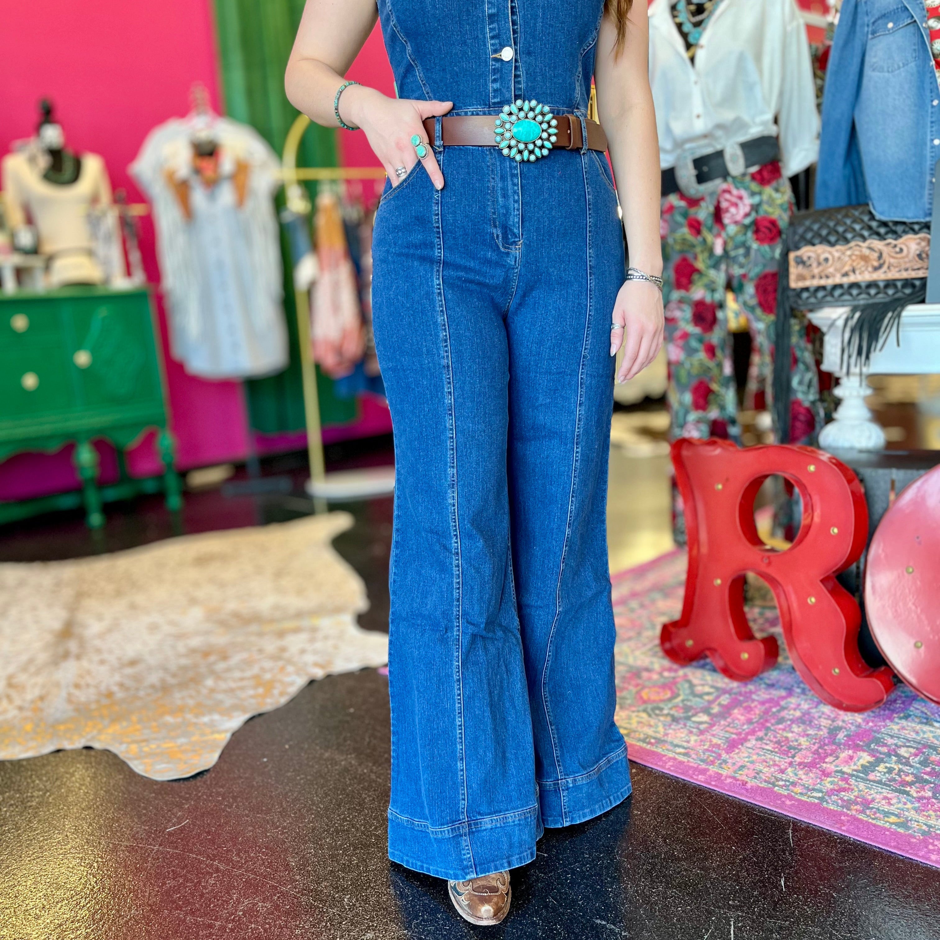 Step into style with our Darlin Denim Wide Leg Jumpsuit! This cute and trendy piece features a flattering design and flowy wide legs, perfect for any occasion. Say goodbye to boring jumpsuits and hello to effortless fashion!