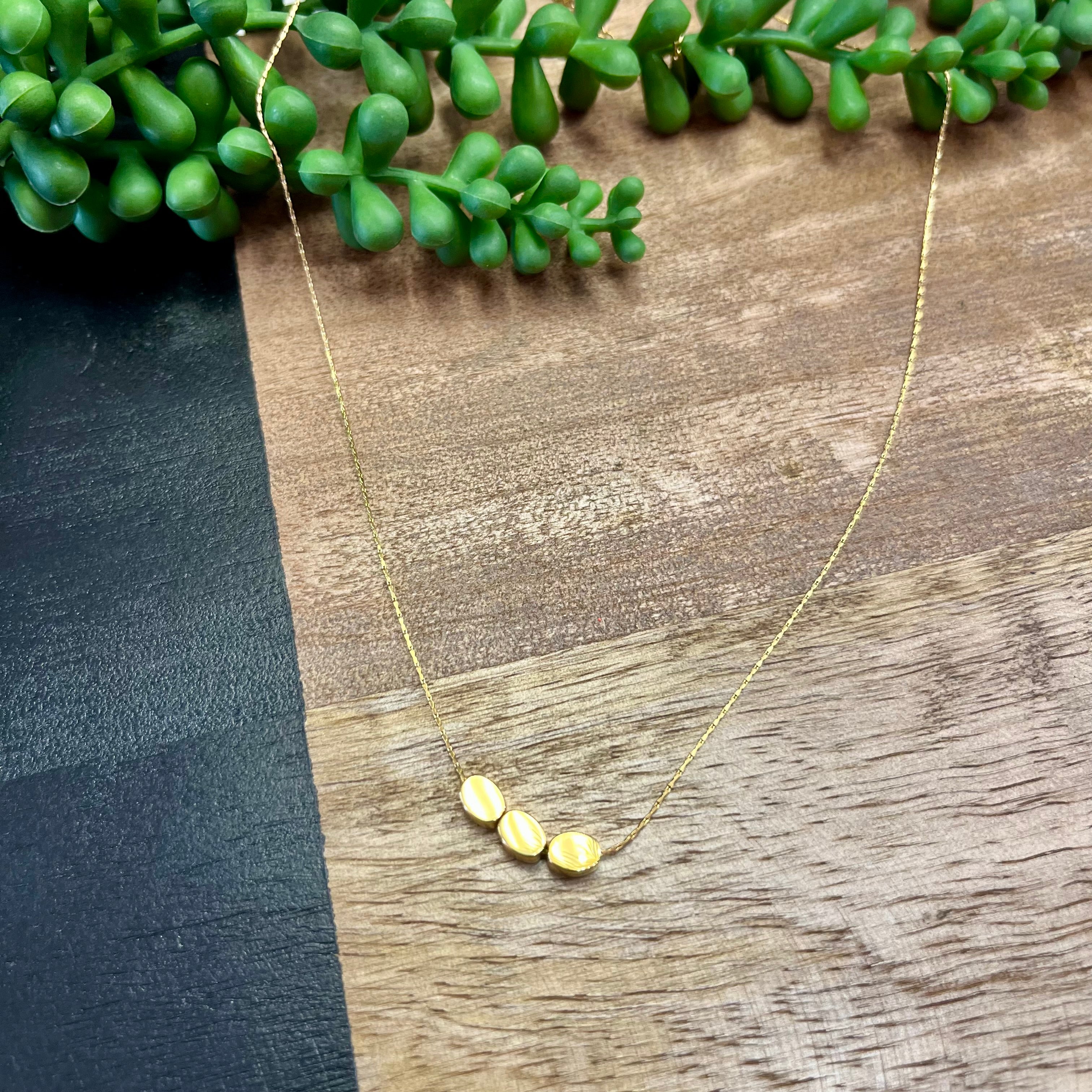 Add some subtle elegance to your outfit with our Gold 3Oval Danity Necklace. Perfect for layering, this piece adds a touch of love and finesse to any look. Embrace your playful side and mix and match with other necklaces for a unique style. (No instructions revealed!)