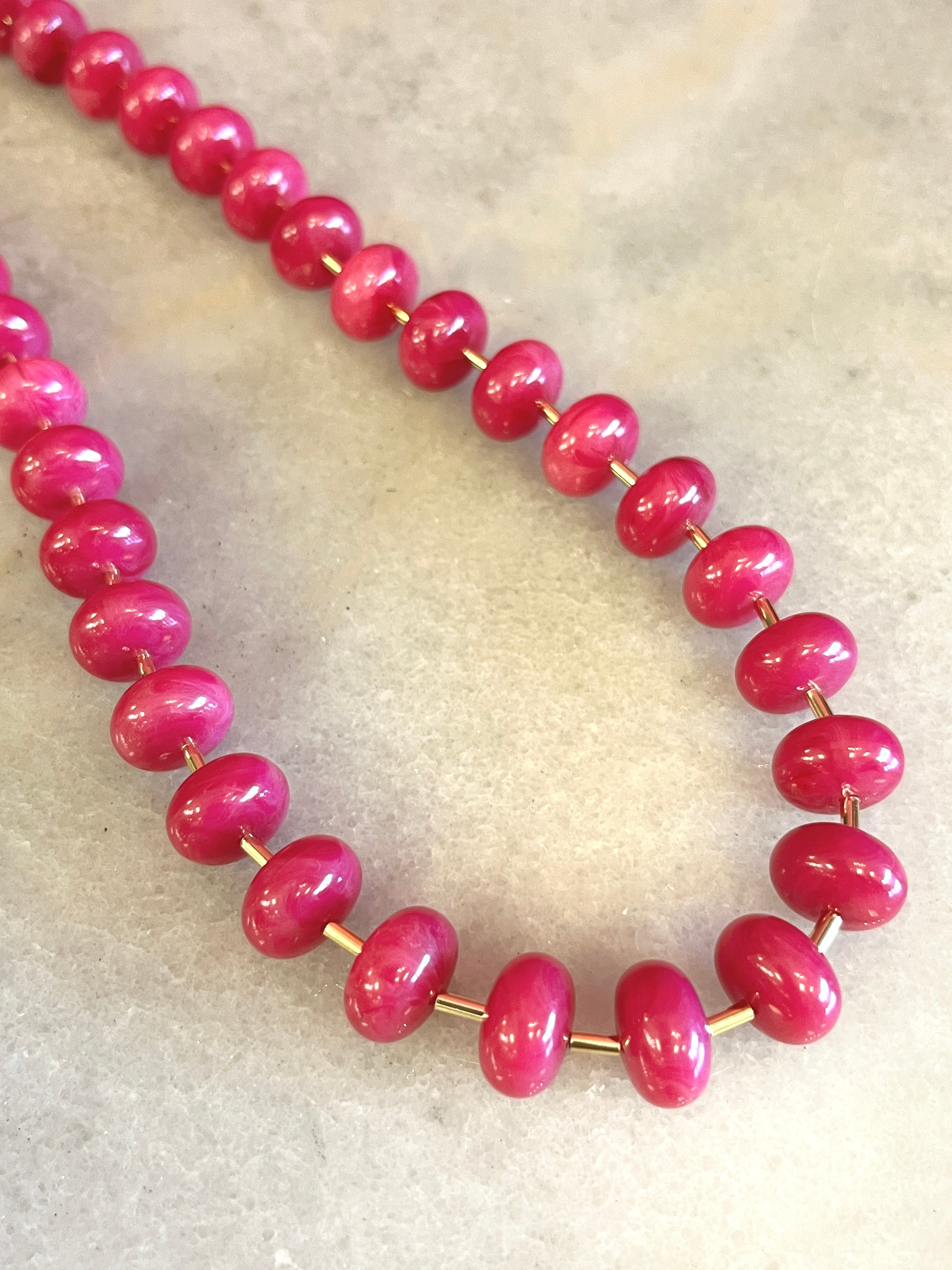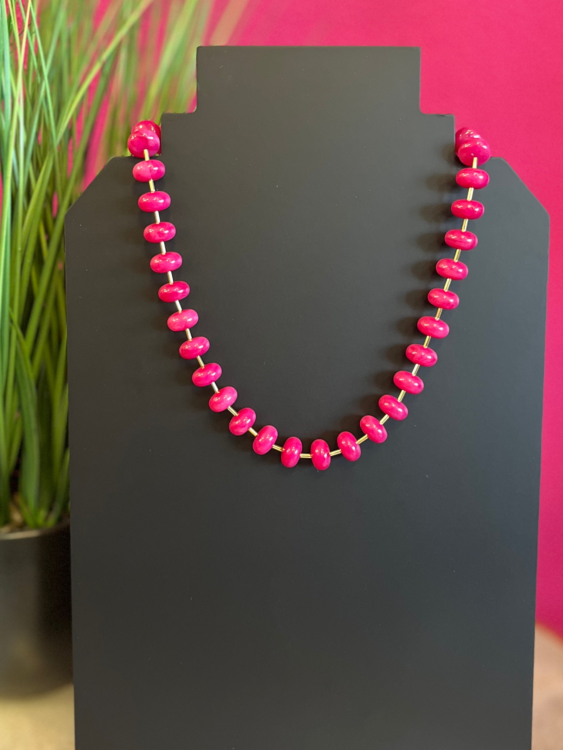 Hot Pink Round Bead & Gold Necklace